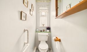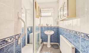 With fitted walls, radiator, shower cubicle and wash basin. Separate WC with radiator.