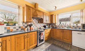 with double aspect windows, radiator and part tiled walls. The kitchen is equipped with a range of fitted box storage cupboards with complimentary work surfaces over and including a cooker with extractor hood over fitted within matching wall-mounted storage cupboards. There is plumbing for an automatic washing machine, radiator, oil wired boiler for central heating and hot water and a 15 pane glass door opening into:
