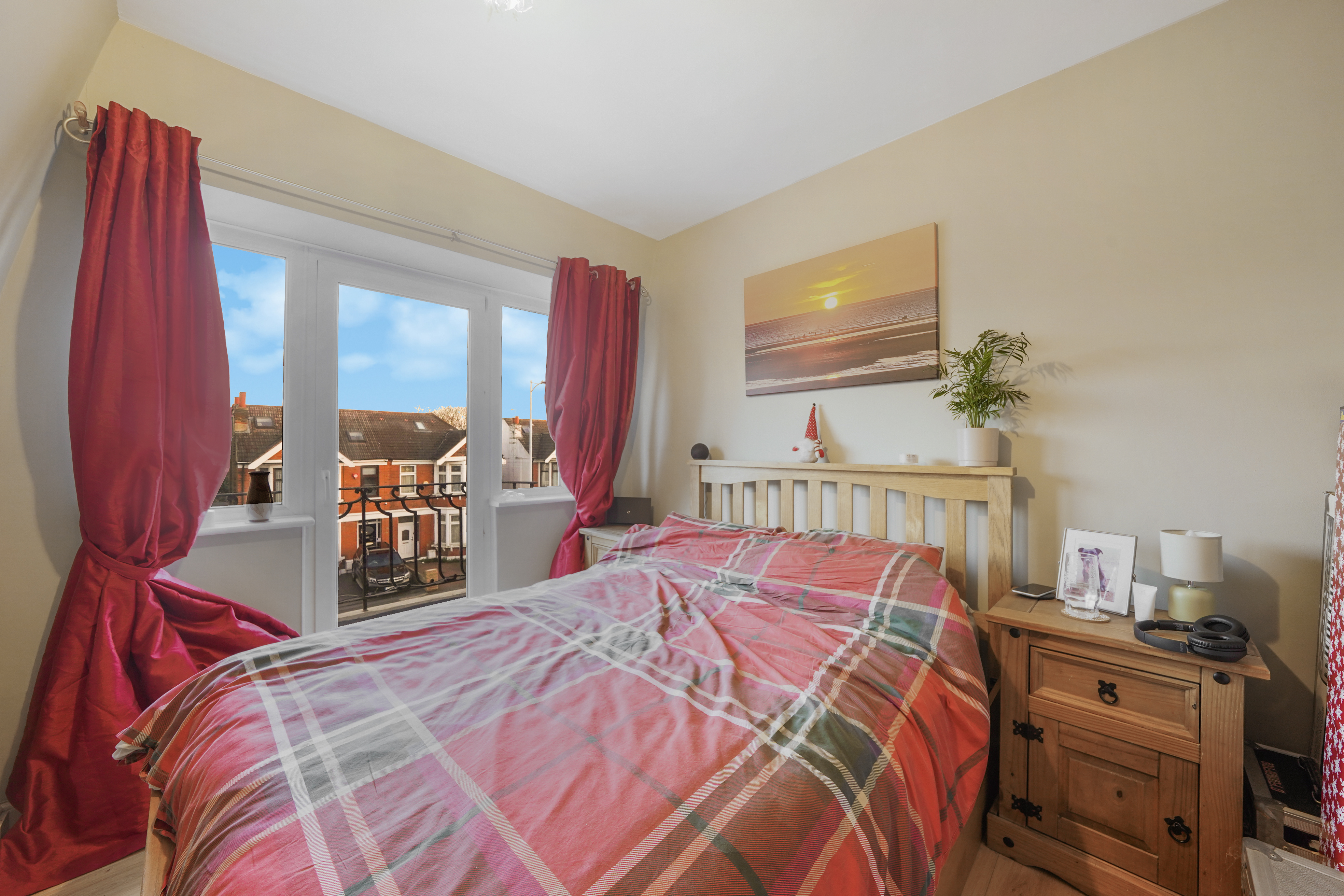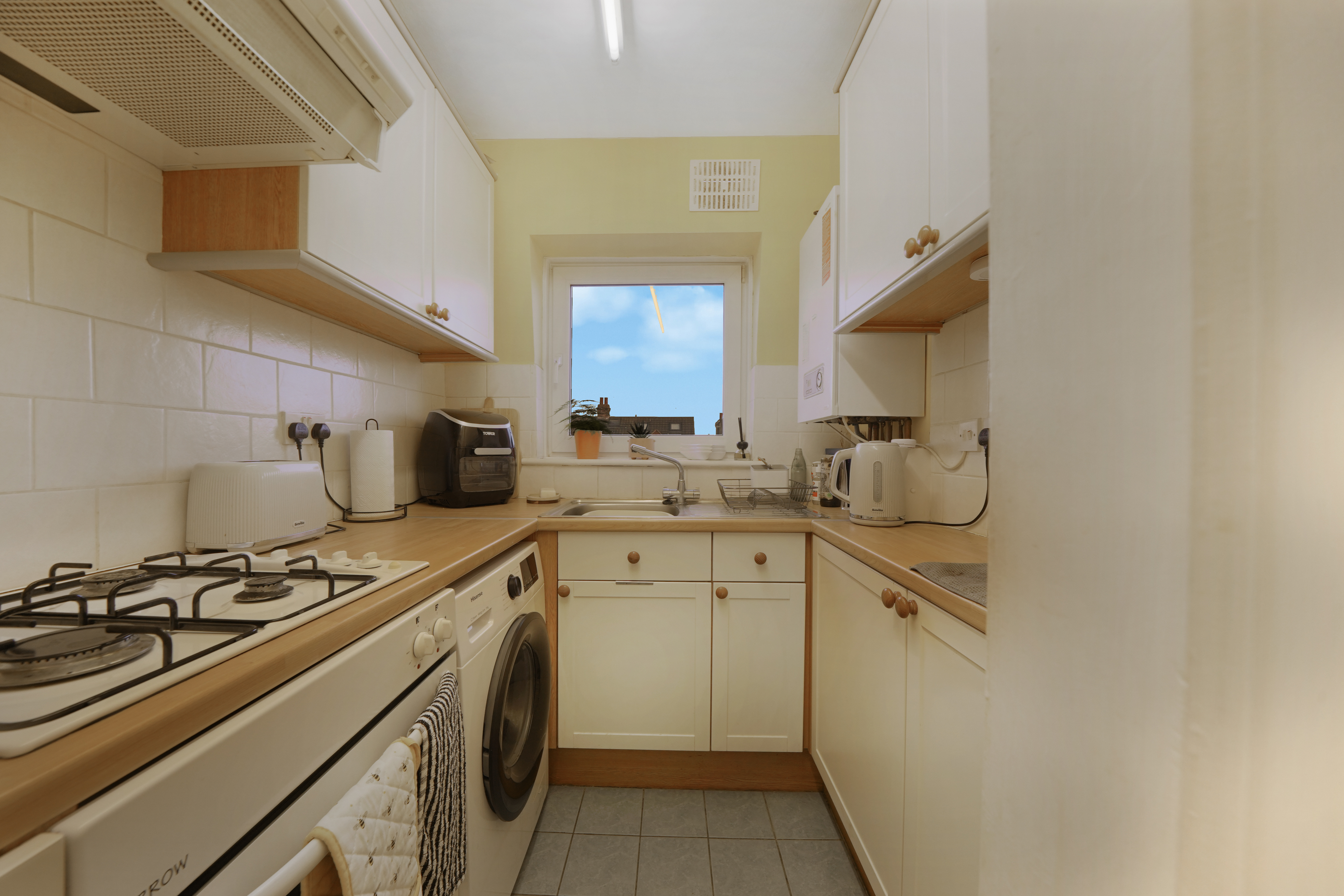 The flat’s layout has been thoughtfully designed to maximise comfort and functionality, featuring a well-proportioned double bedroom with storage, a stylish bathroom, and a separate fitted kitchen equipped with modern appliances and generous worktop space.