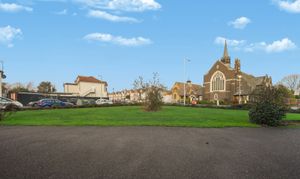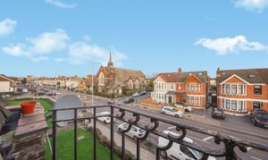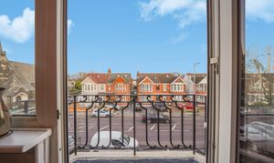 The property boasts a spacious and bright living area, enhanced by large windows and a Juliet balcony that provides a charming view overlooking the historic All Saints Church, creating a tranquil backdrop and a sense of space.