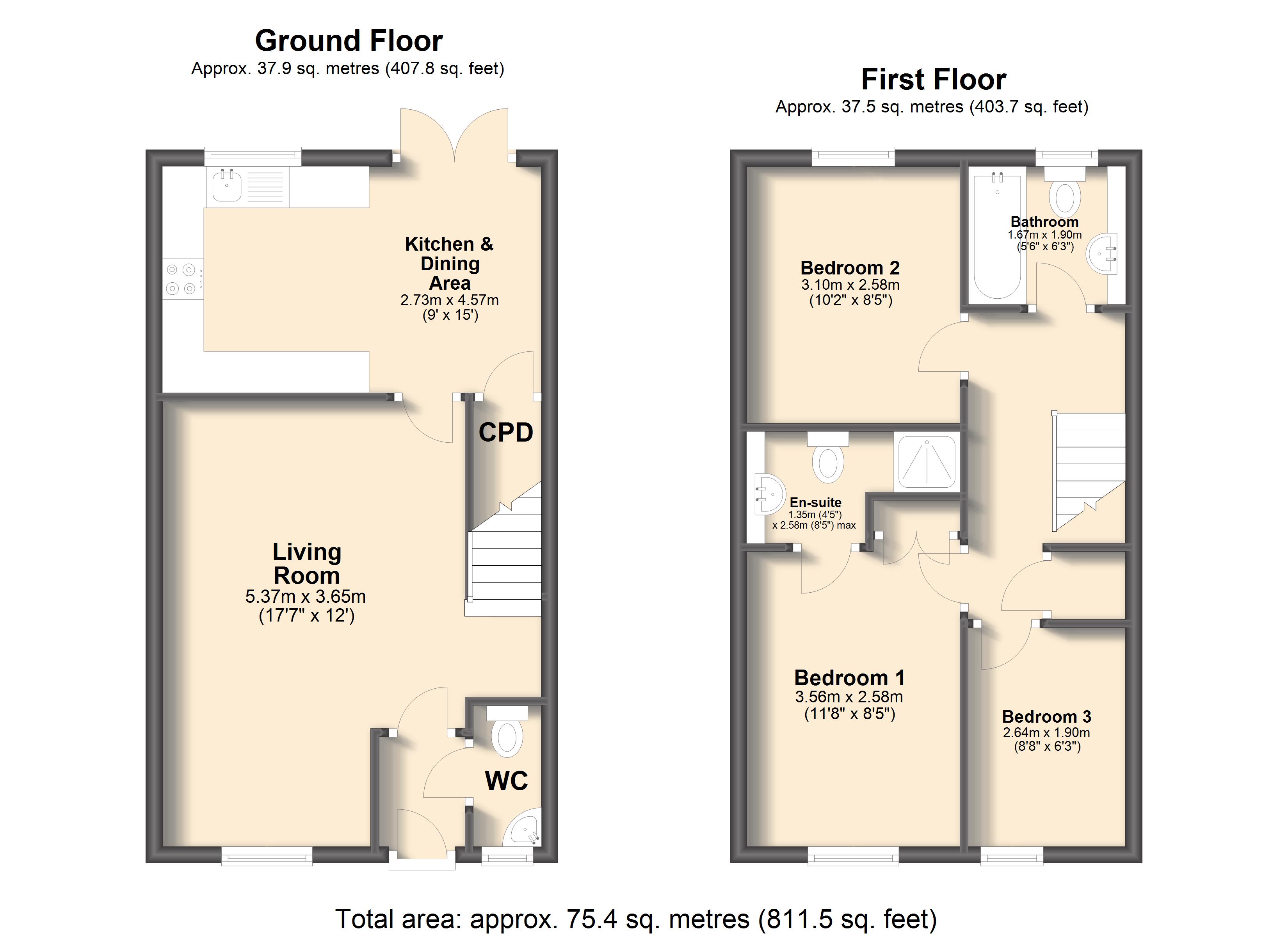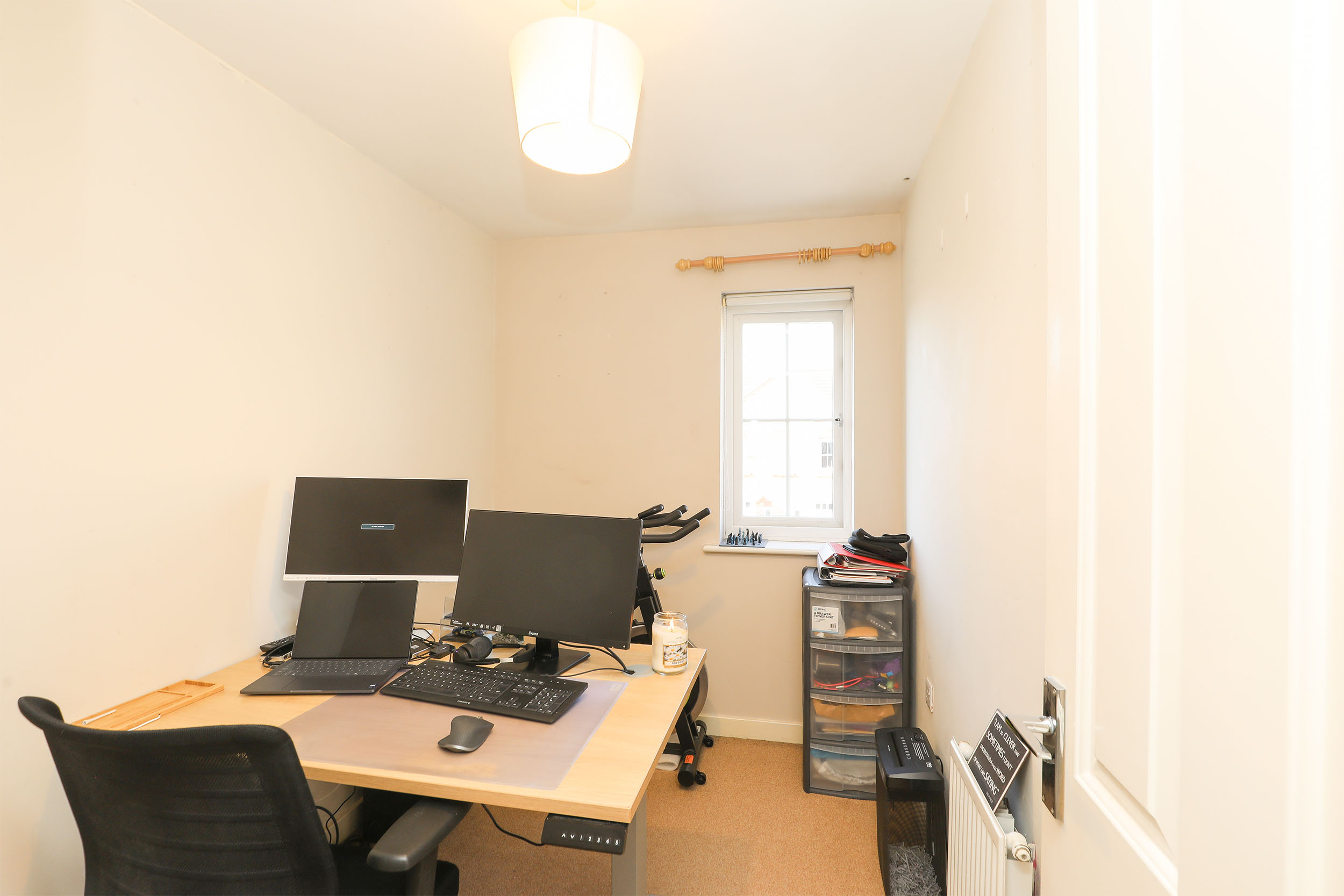 Upstairs, the property offers three well-proportioned bedrooms. The principal bedroom features fitted wardrobes and an en-suite shower room, creating a practical, self-contained space. The remaining bedrooms are ideal for family living, guest accommodation or those looking to work from home. These rooms are accompanied by a family bathroom fitted with a three-piece suite, while a ground-floor W.C. adds further convenience.