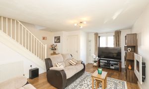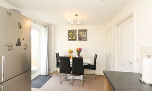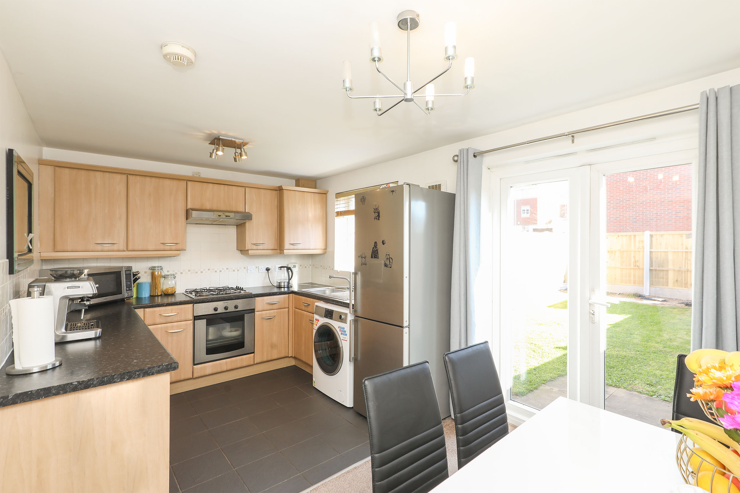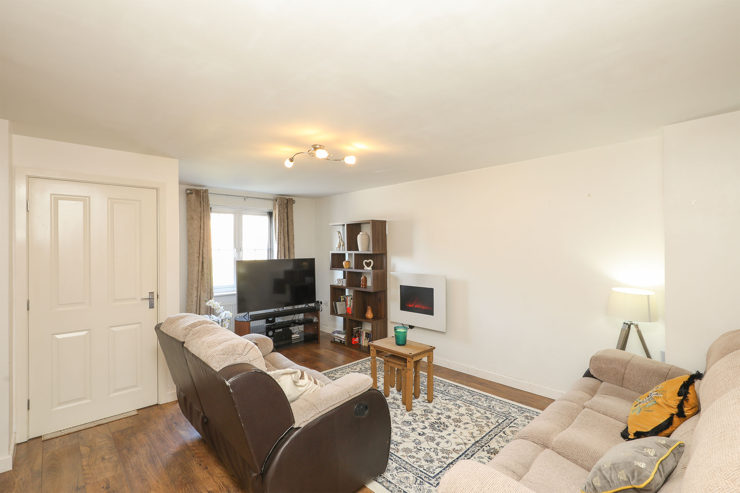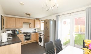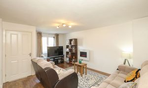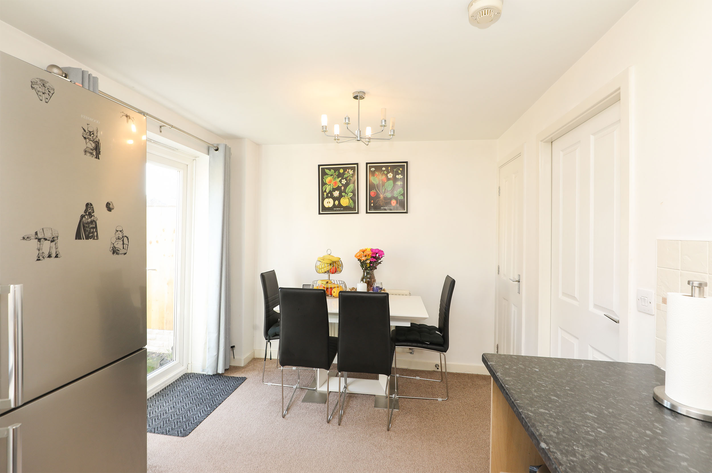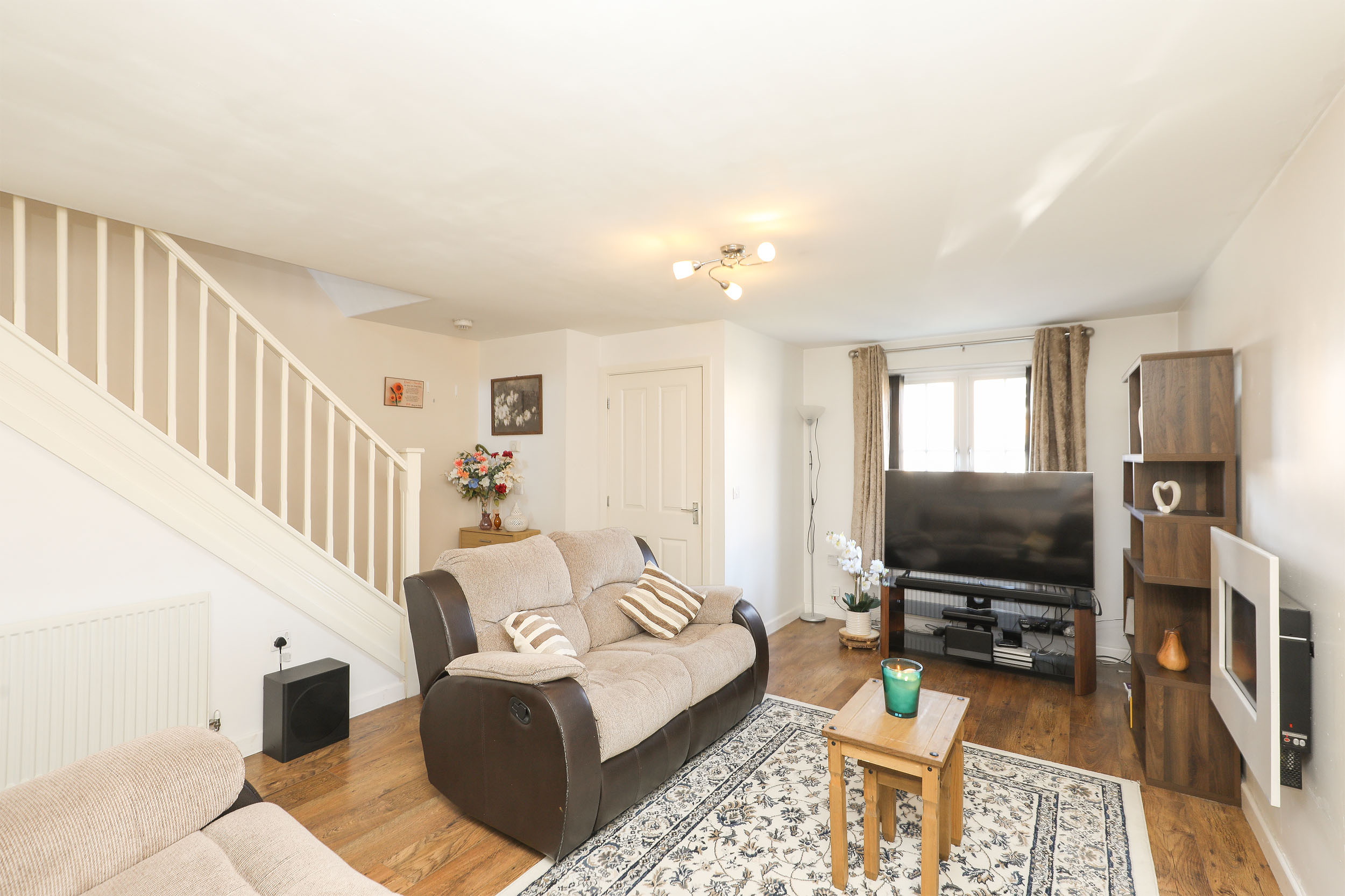 The property opens into an entrance area that leads through to a generously sized living room, providing a comfortable, well-proportioned space with flexibility to suit a variety of furniture layouts. To the rear of the home is an open-plan kitchen and dining area. The kitchen is fitted with a range of units and worktop space, while the dining area provides ample room for family meals and entertaining, with doors that open onto the rear garden.