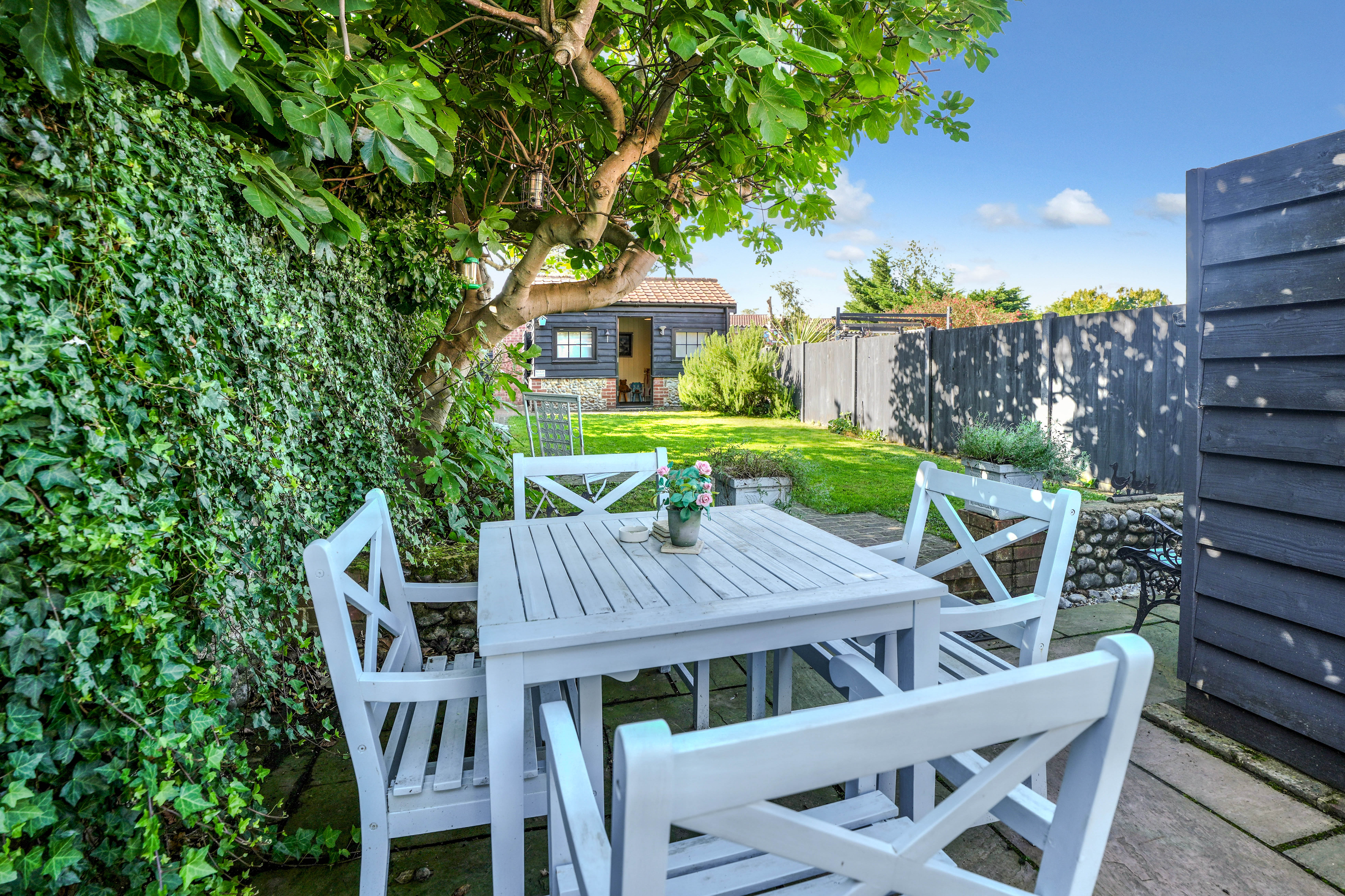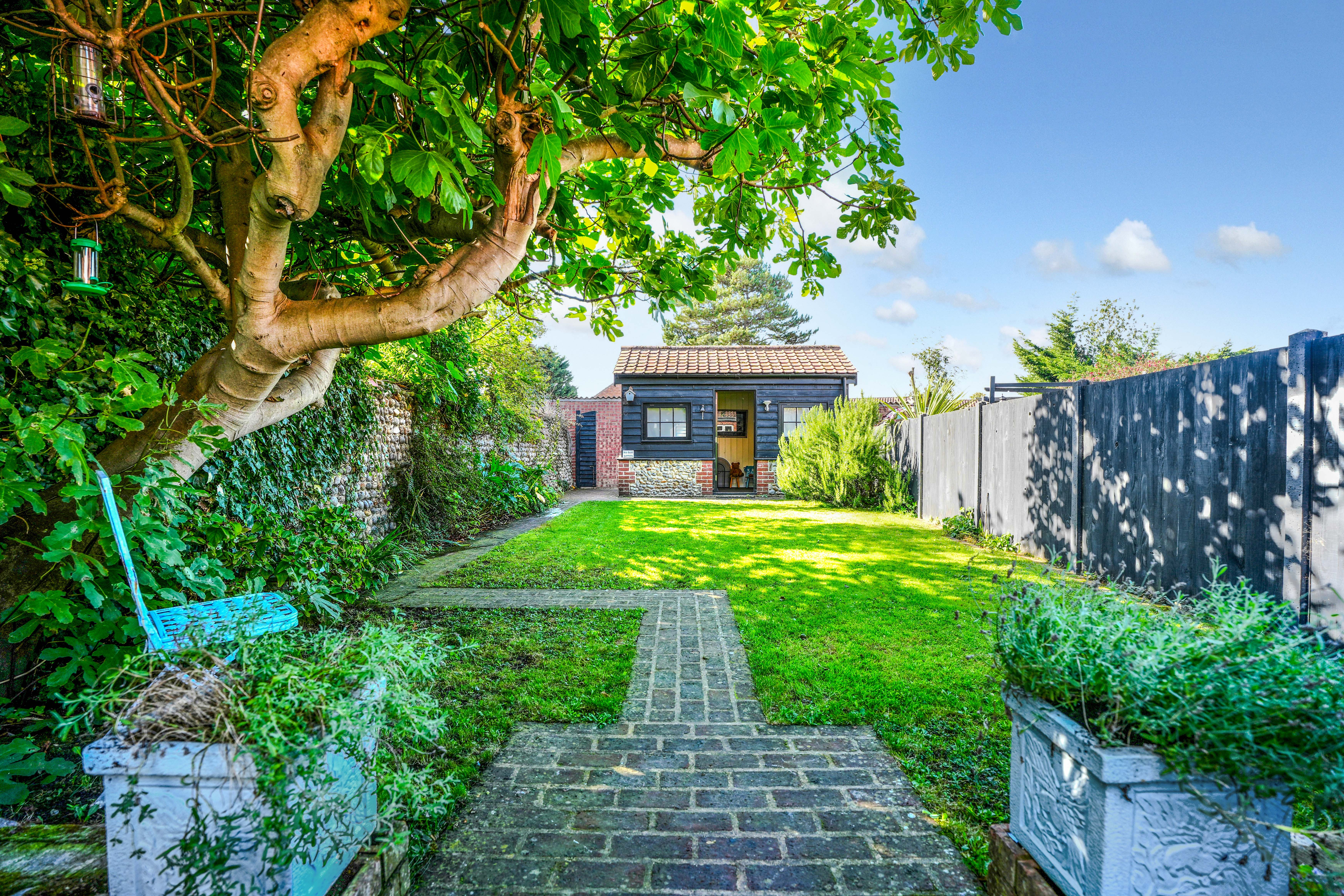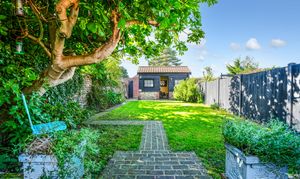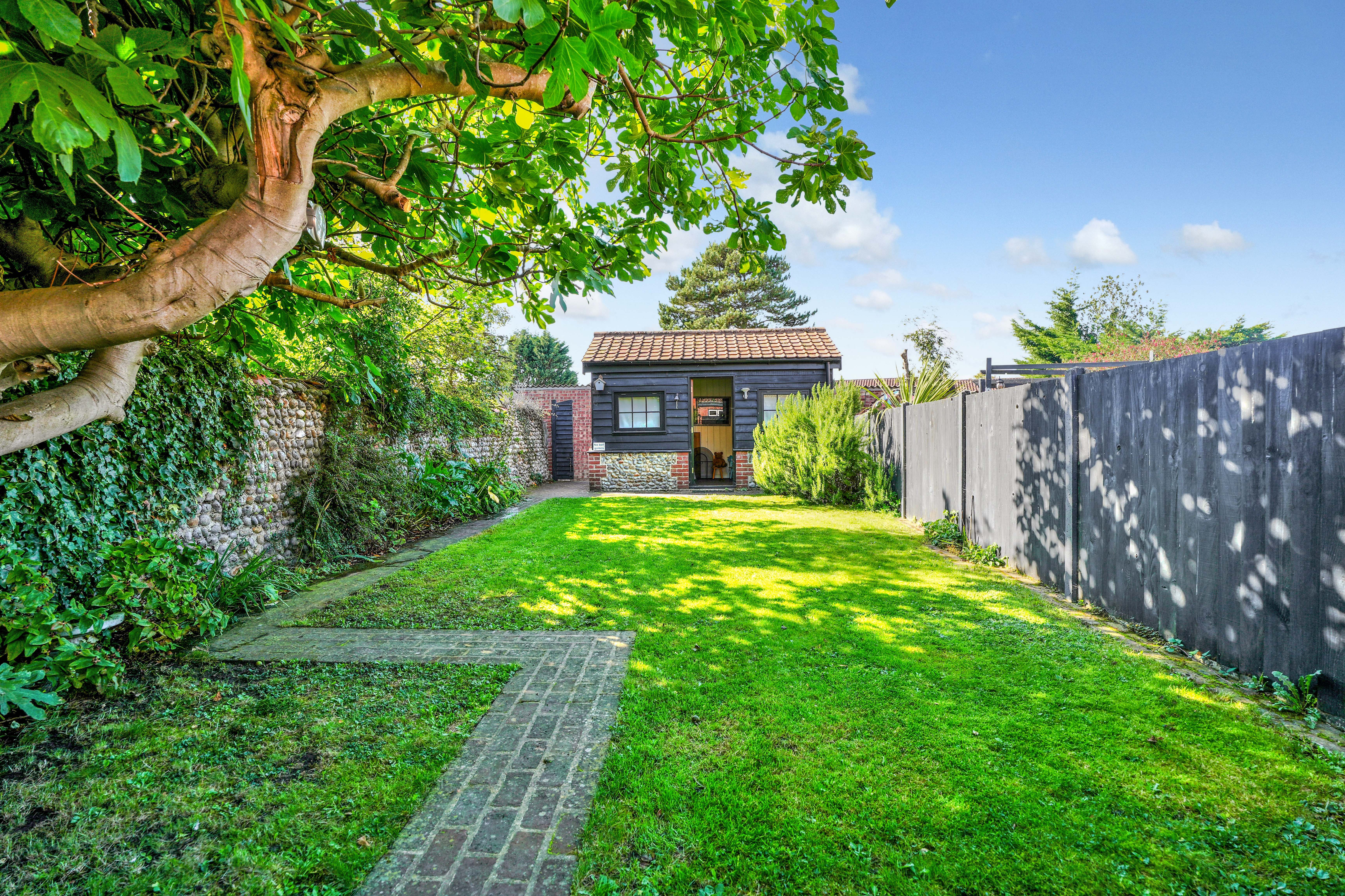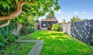 The property sits within generous front and rear gardens, both mainly laid to lawn. A pathway leads through the front garden to the original front door, while the sunny rear garden offers an ideal spot for alfresco dining. At the far end of the garden is a characterful brick, flint, and timber summer house which benefits from power and has been insulated, making it viable for a variety of uses, including a fantastic home office. Within the garden is also a log shed and a timber garden shed, and a gate to the rear leads to a residents’ parking area.