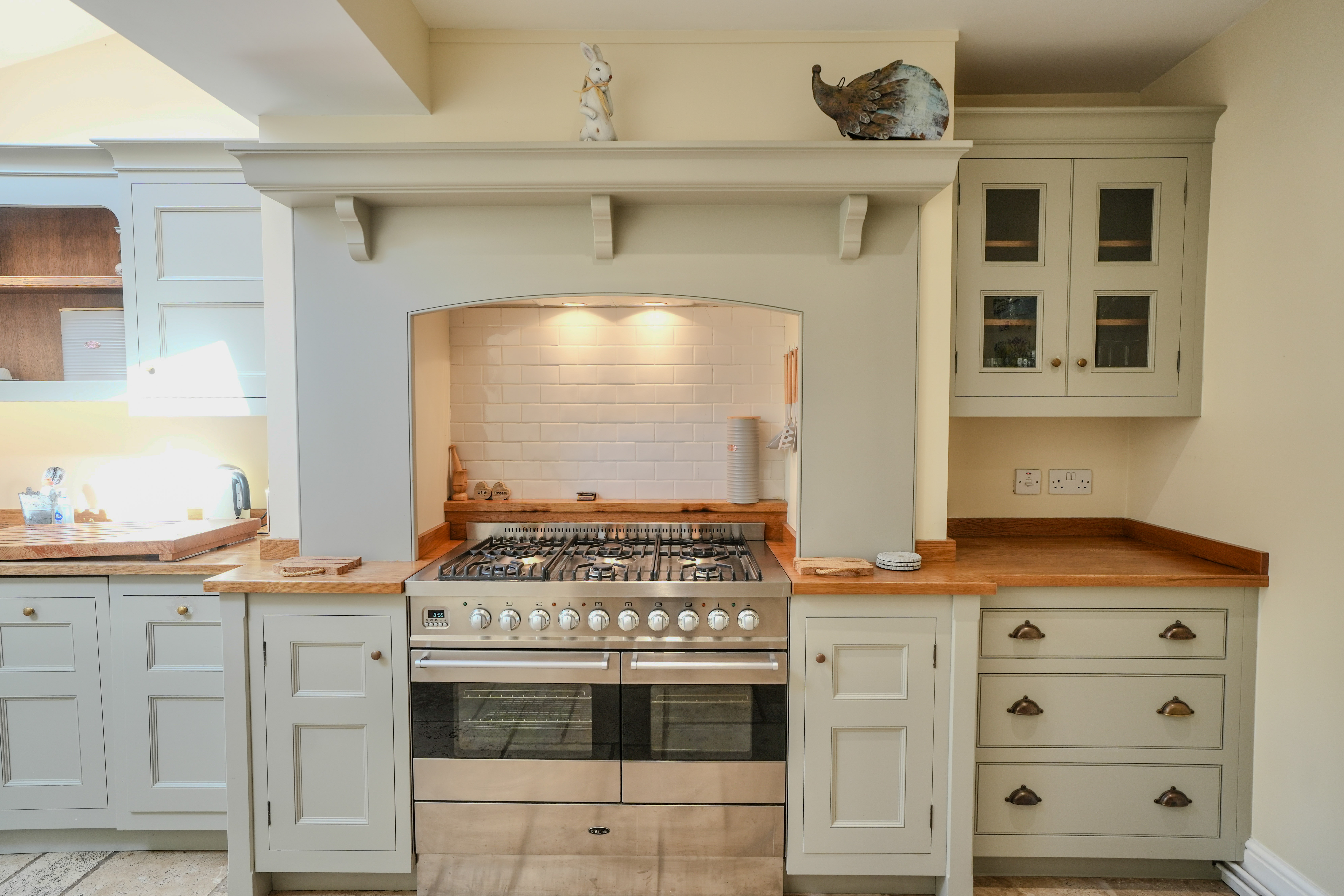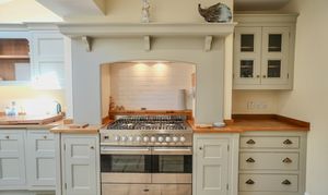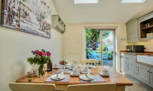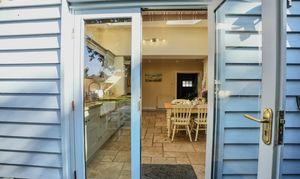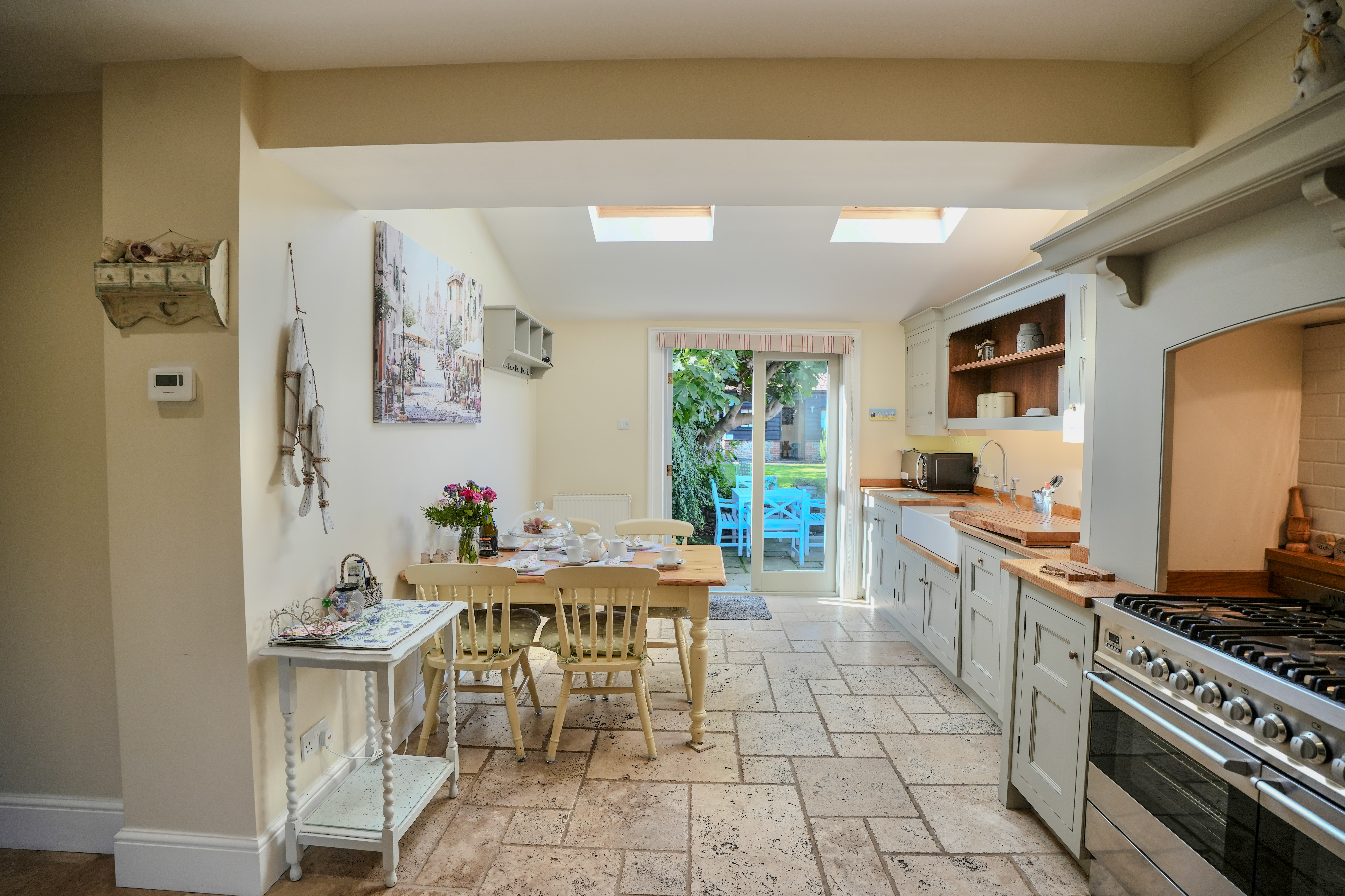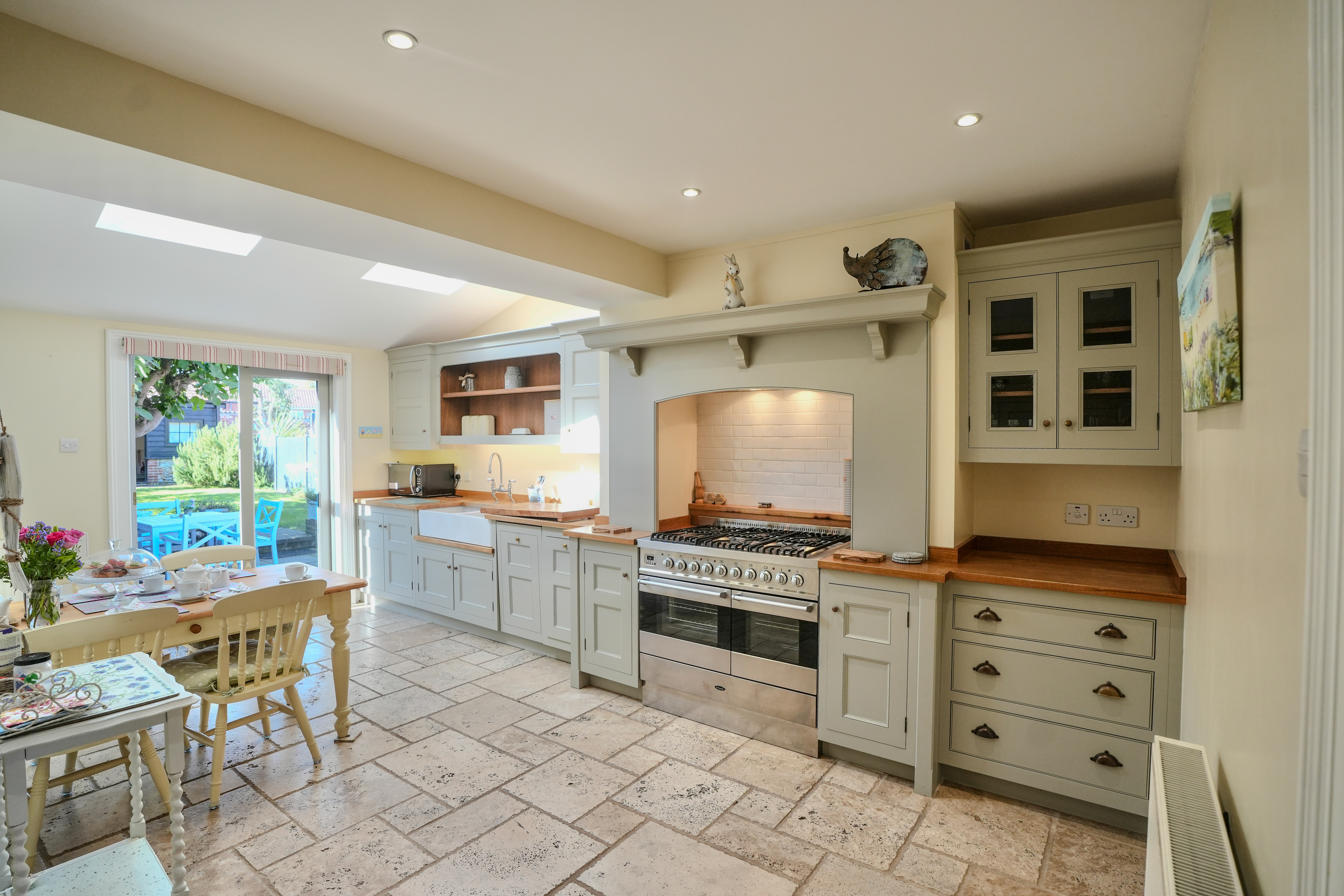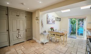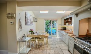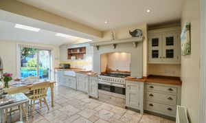 This immaculate period home welcomes you with a characterful sitting room, complete with original tiled flooring, a striking feature fireplace with wood burner, and handcrafted storage cupboards. The heart of the home is the bespoke kitchen/dining room, designed with exceptional attention to detail. It offers an abundance of fitted storage, a larder with integrated appliances, a range cooker, and double doors opening to the garden. Thoughtfully extended, the kitchen is filled with natural light thanks to Velux windows overhead.