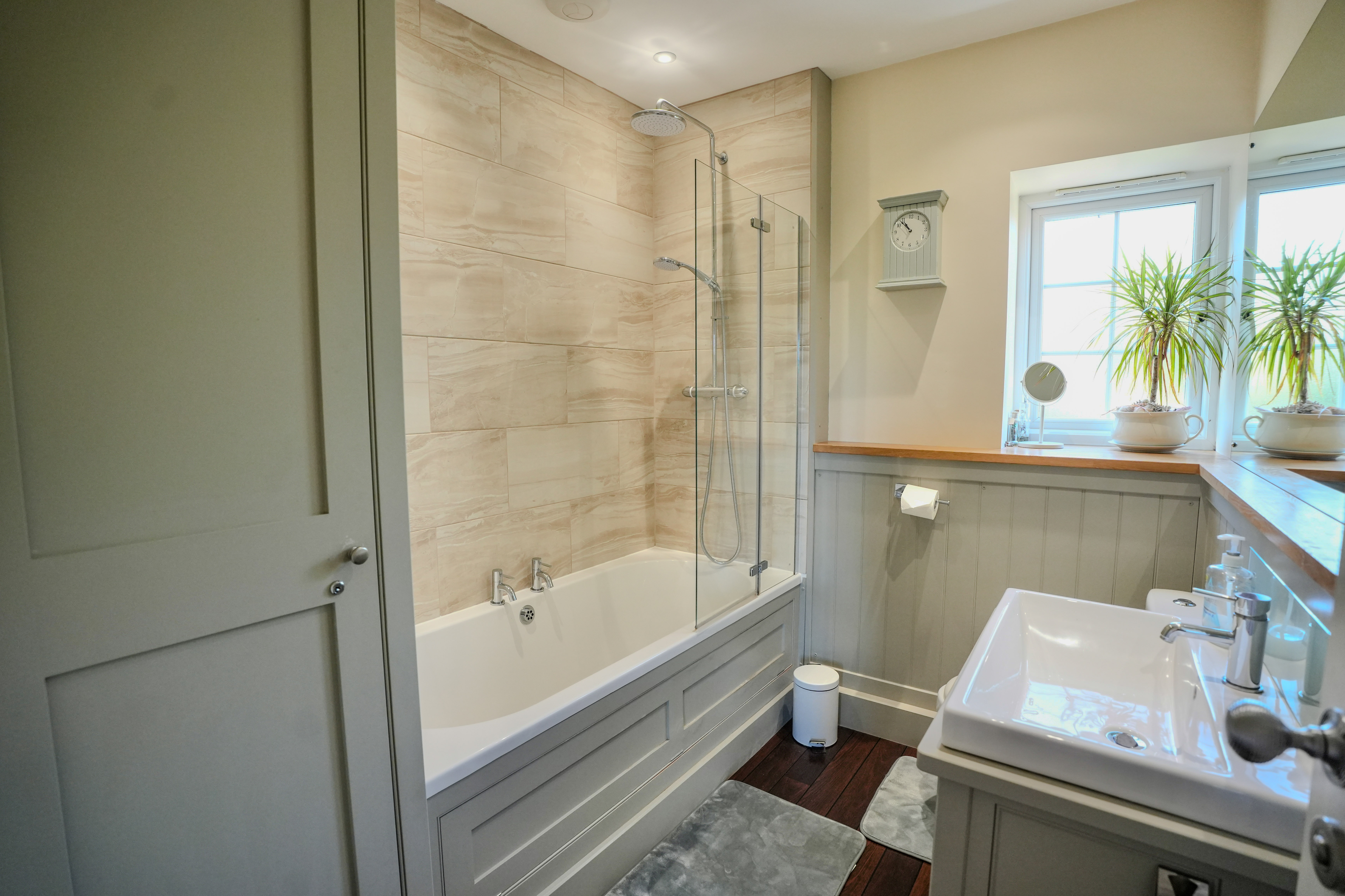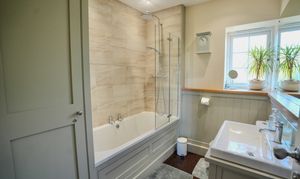 Upstairs, there are two double bedrooms. The main bedroom enjoys built-in storage, while the second bedroom overlooks the peaceful rear garden. A tastefully refitted bathroom continues the home’s charm, featuring bespoke storage and a shower over the bath.
