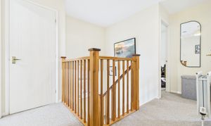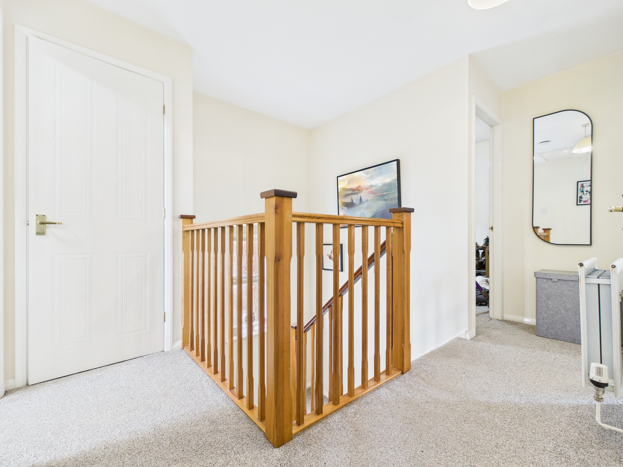 To the first floor, the landing features a spindled balustrade and two storage cupboards, with doors leading to three bedrooms. The generously proportioned main bedroom benefits from its own private en-suite shower room, while the remaining bedrooms are served by a family bathroom with a modern three-piece white suite.