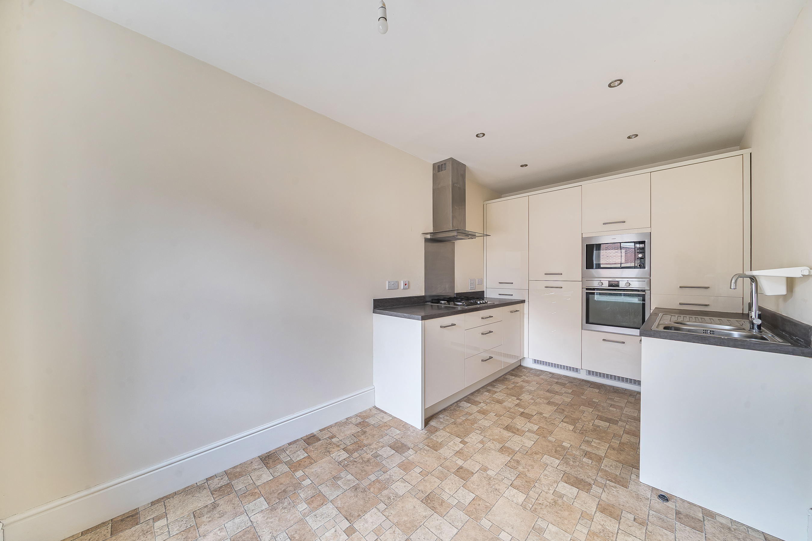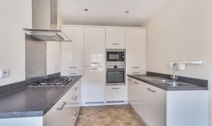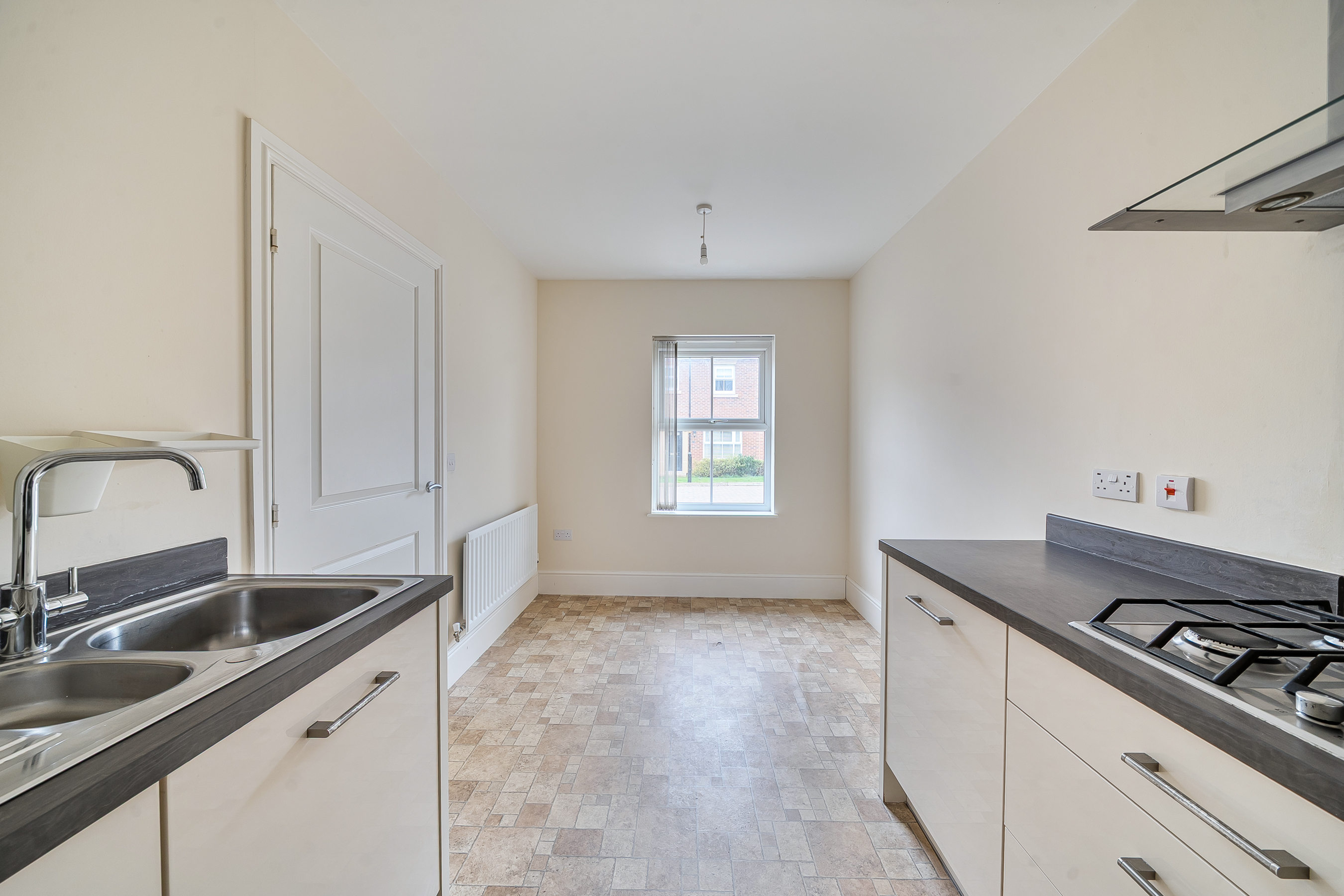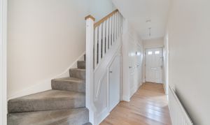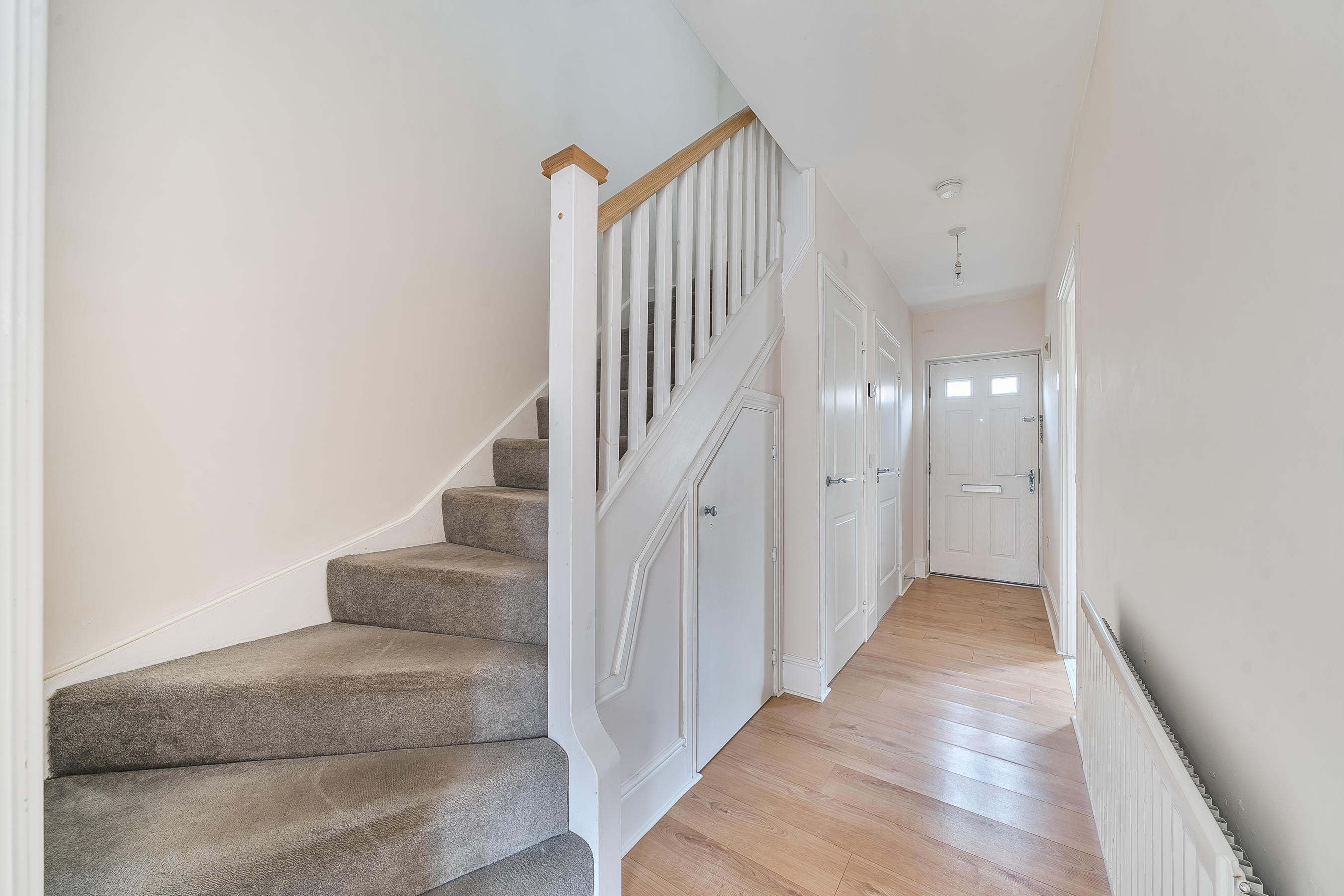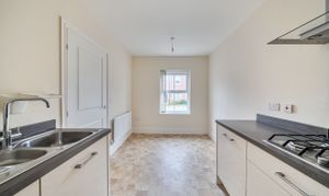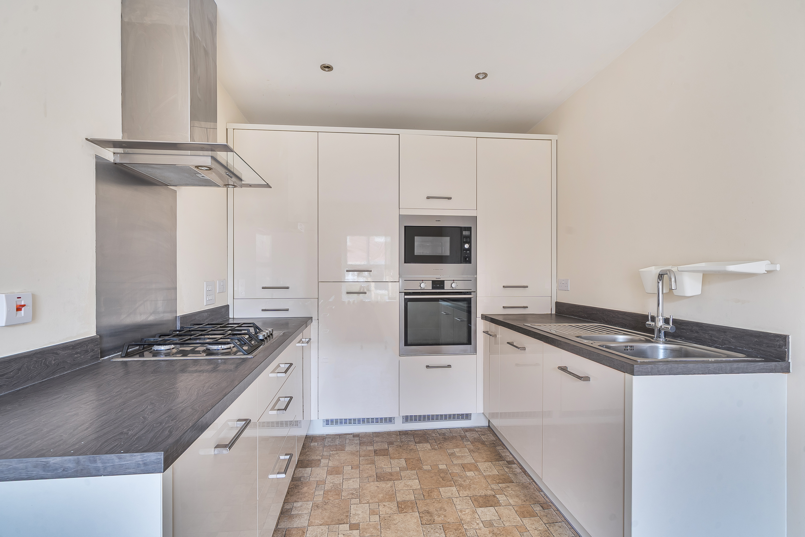 Just off the hallway, the bright and modern kitchen features sleek fitted units, a gas hob with extractor fan, and ample countertop space—perfect for everyday cooking or family meals. Opposite the kitchen, a staircase leads to the first floor, where the accommodation continues.