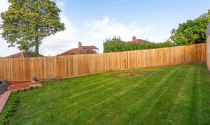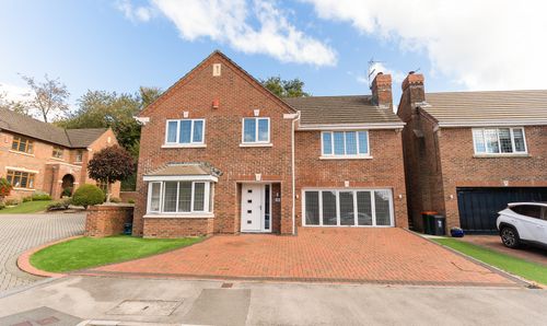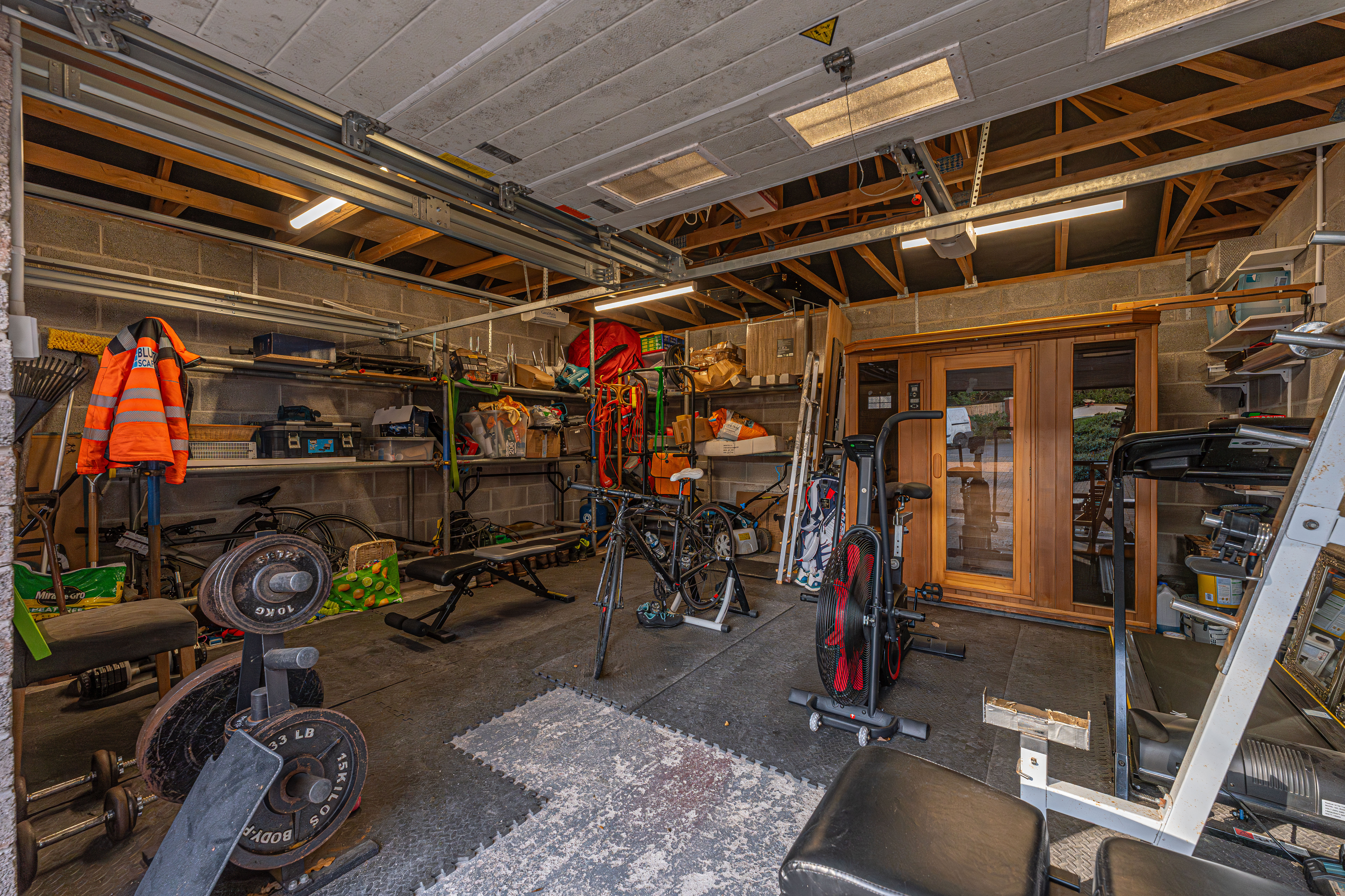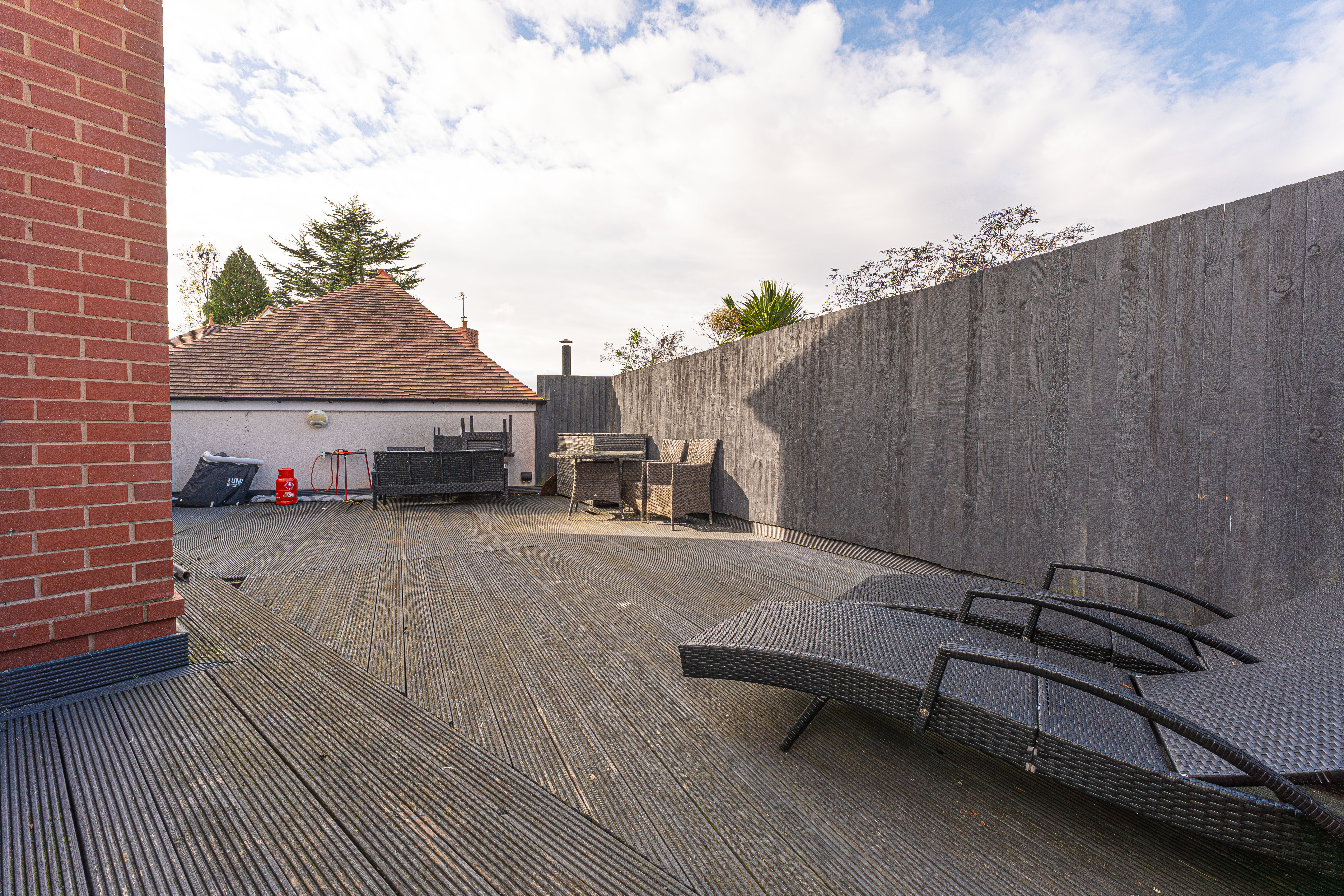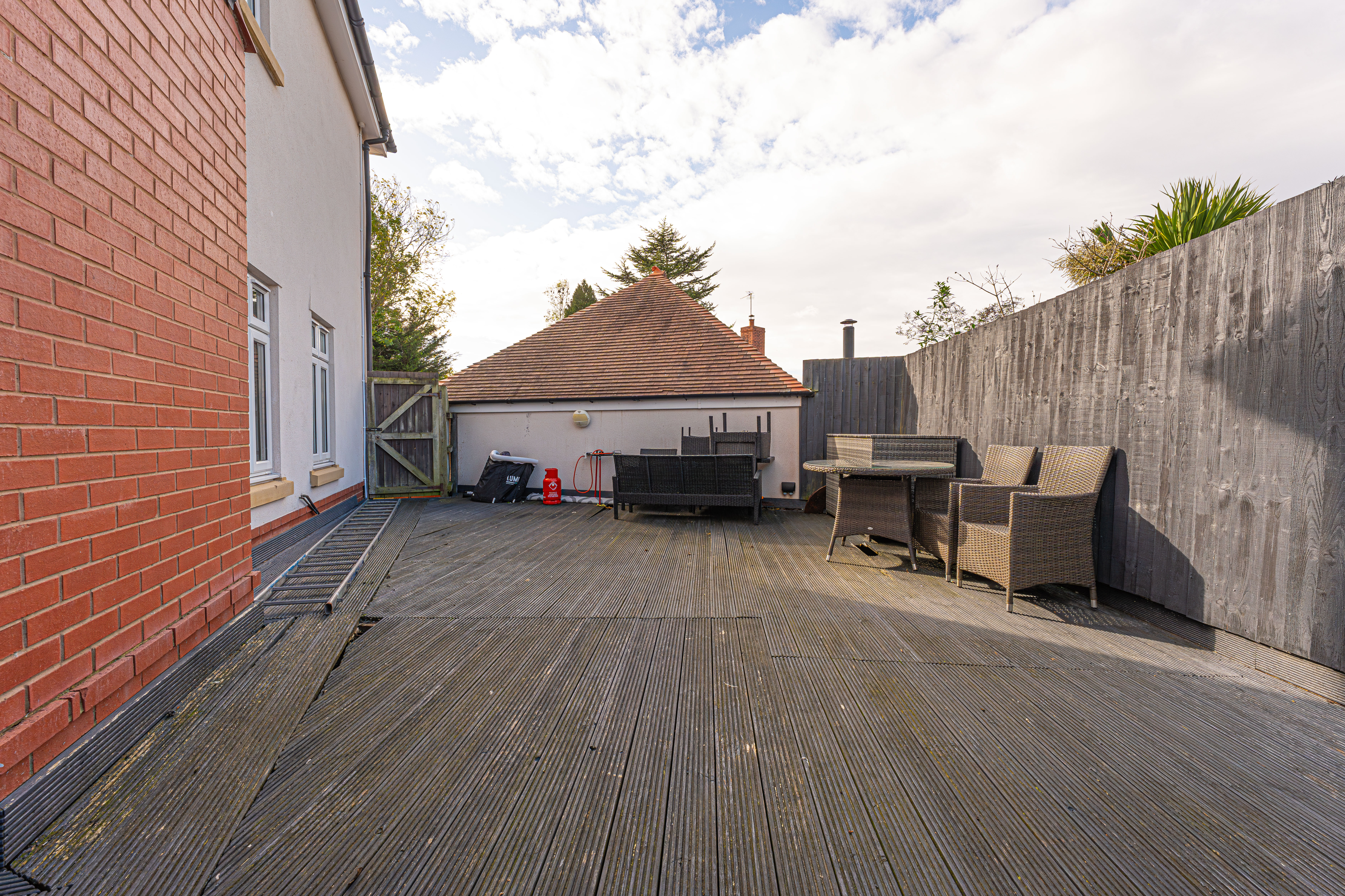 Stepping outside we can find the glorious rear gardens, featuring a large patio and lawn to the rear, and a sizeable wooden deck to the side of the house, highlighting an abundance of space to enjoy in the company of friends and family. This tranquil garden retreat is also fully enclosed and minimally overlooked, ensuring a great deal of privacy for residents to relax in the sunshine and enjoy a wide range of activities in peace. To the front of the house we can ample driveway space, with an estimated parking capacity of around 4-5 vehicles, not including the impressive double garage, which can provide further parking, storage, or fantastic multi-functional space thanks to the available lights and power outlets. The property also lies within a secure gated entrance for added security.
