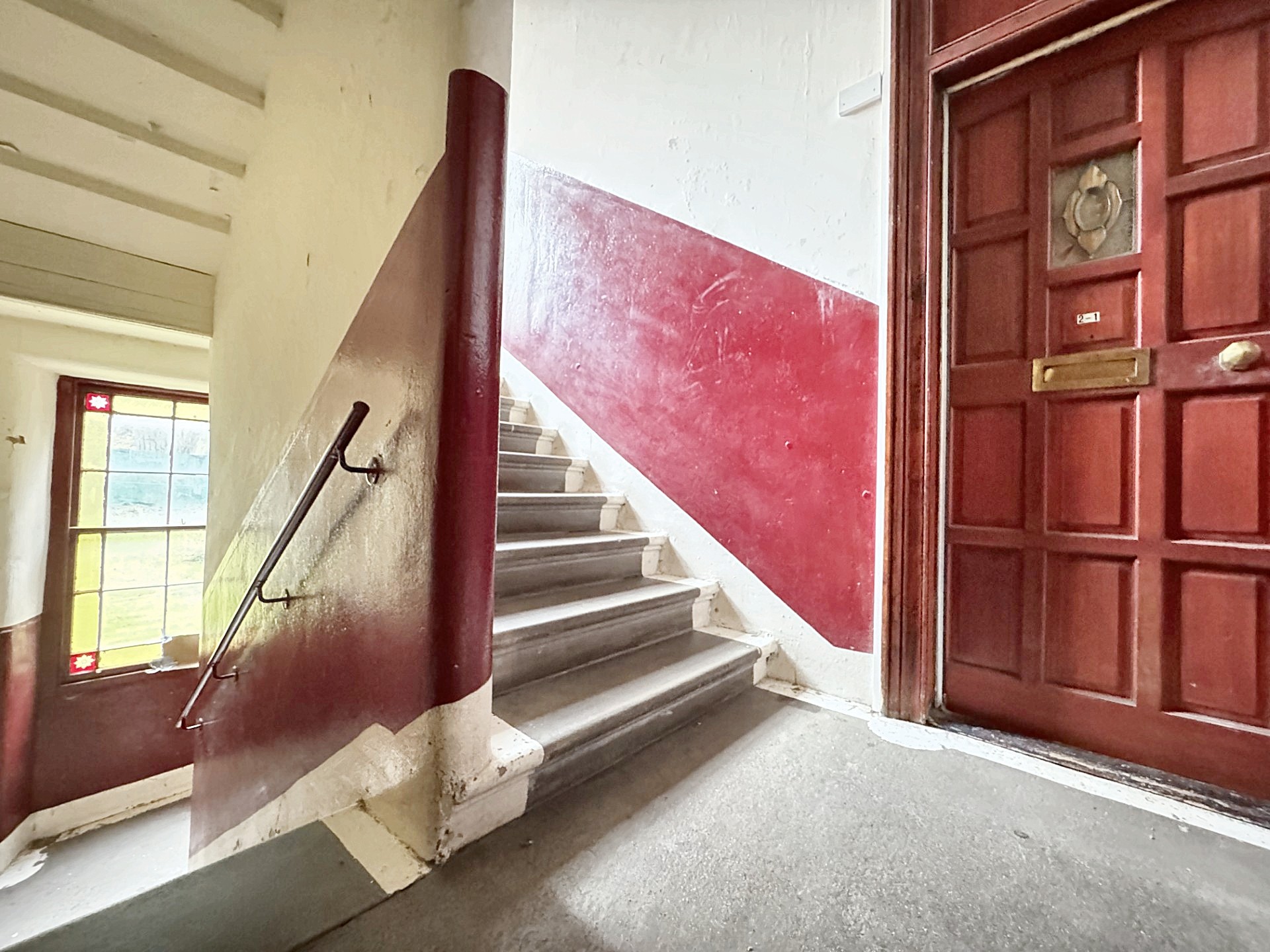 Accessed via a secure entry system into a well-kept communal hallway, stairs lead up to the second floor. A red timber door opens into a broad and welcoming entrance hallway, providing access to all accommodation. The property enjoys high ceilings throughout, enhancing the sense of space and character.