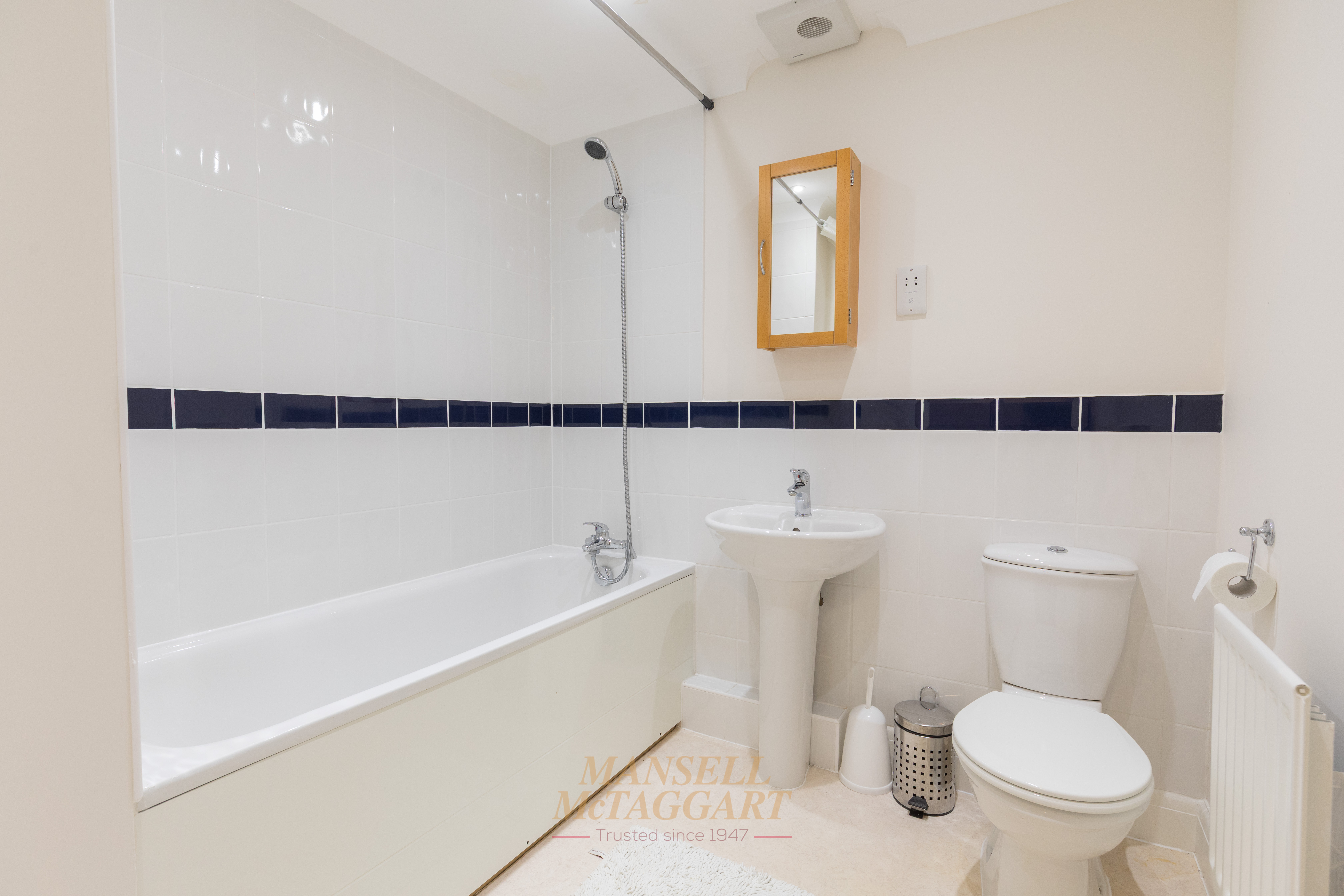The main bathroom is fitted with a white suite, including a W.C., hand wash basin, and a bath with shower over.