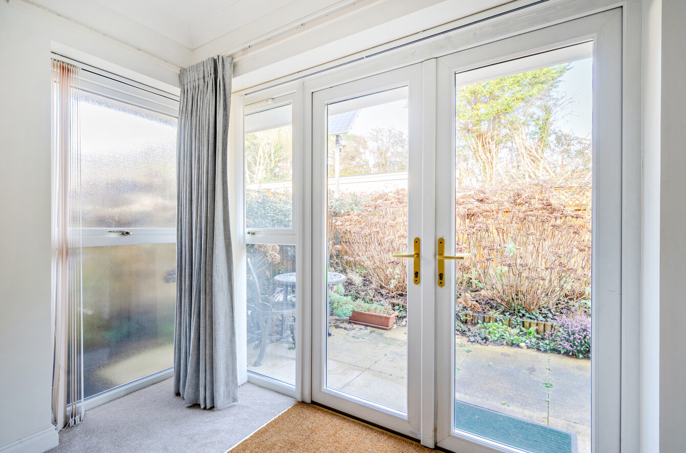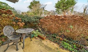 The accommodation includes an entrance hall, a welcoming sitting room with French doors opening onto a semi enclosed garden and private patio. The kitchen is fitted with shaker-style units, a two-ring ceramic hob and an integrated fridge. The double bedroom enjoys a dual aspect, while the modern wet room features an electric shower. Underfloor heating runs throughout the property, providing year-round comfort.