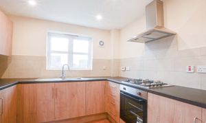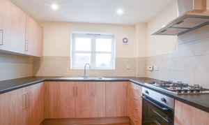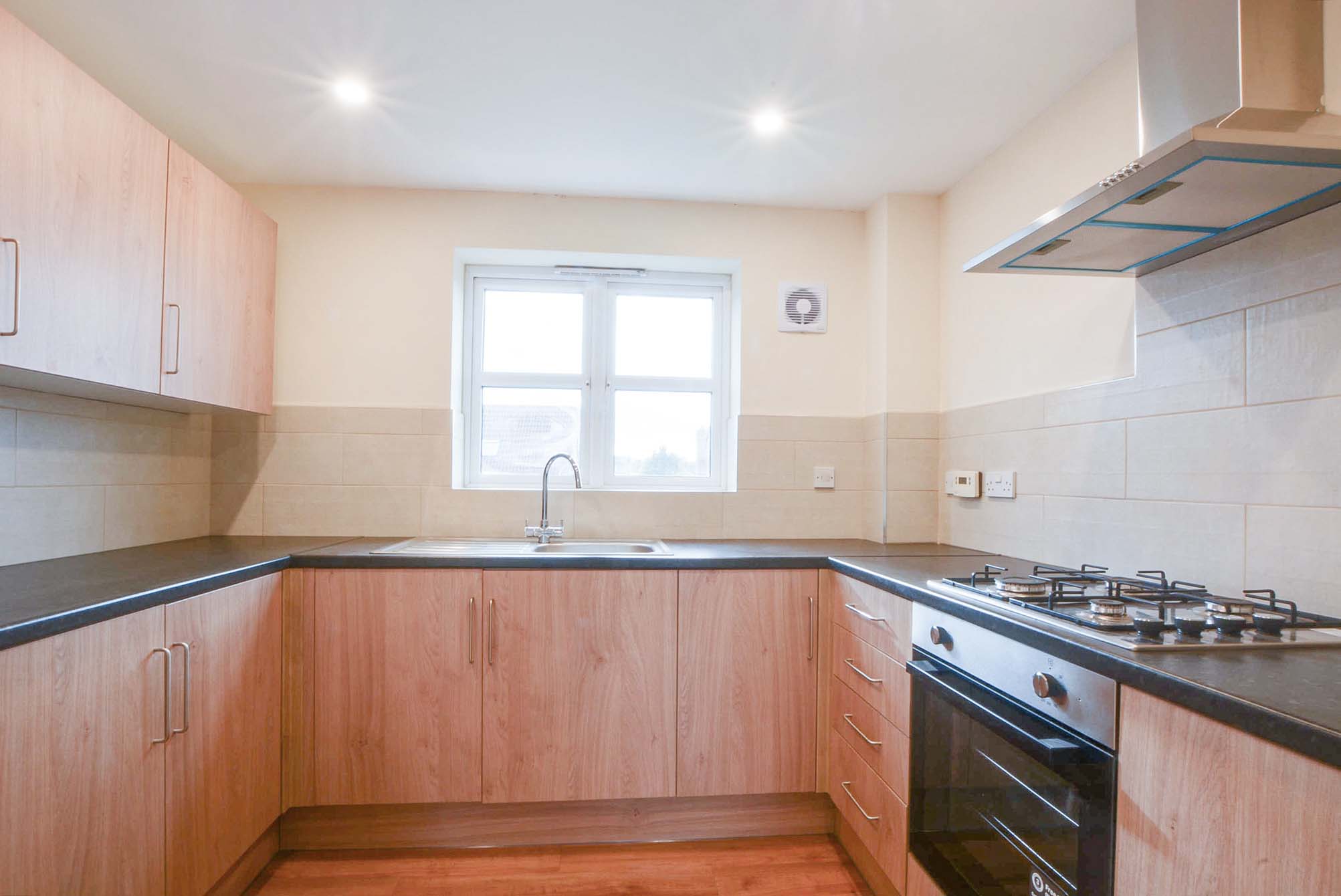 With double glazed window to the rear elevation, wood effect floor, a range of wall and base units with work surface over, stainless steel sink, drianer and mixer tap, part tiled walls, inset four ring gas hob and oven, extractor hood, integrated fridge, integrated freezer.