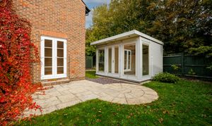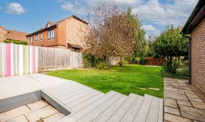 Outside there is a driveway and a DOUBLE GARAGE with twin doors. The gardens wrap around the property with paved terrace, lawn, decking and superb HOME OFFICE.