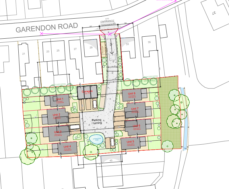 Planning permission has been granted for the demolition of the existing bungalow to create EIGHT new dwellings at the rear of the current property.