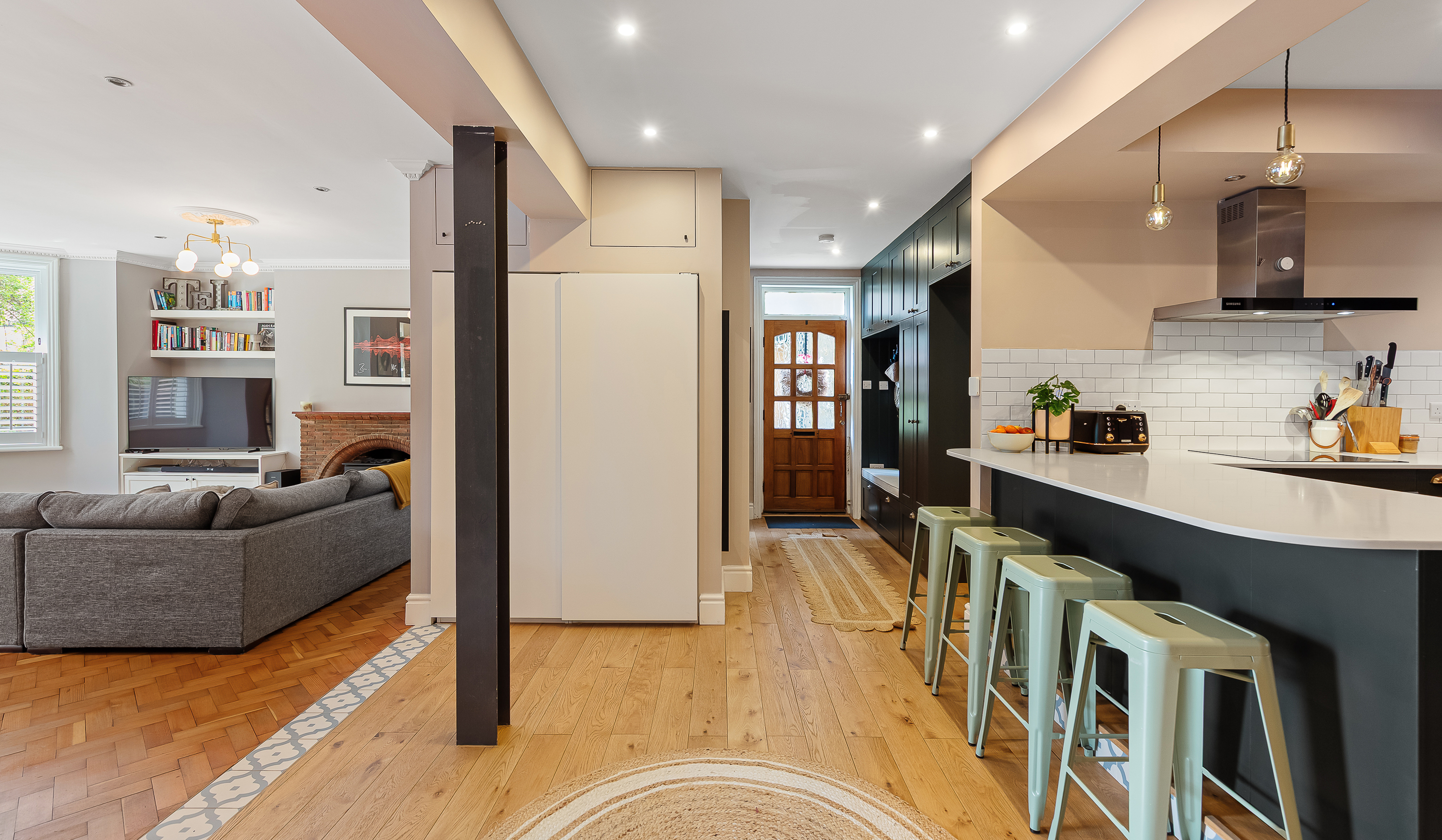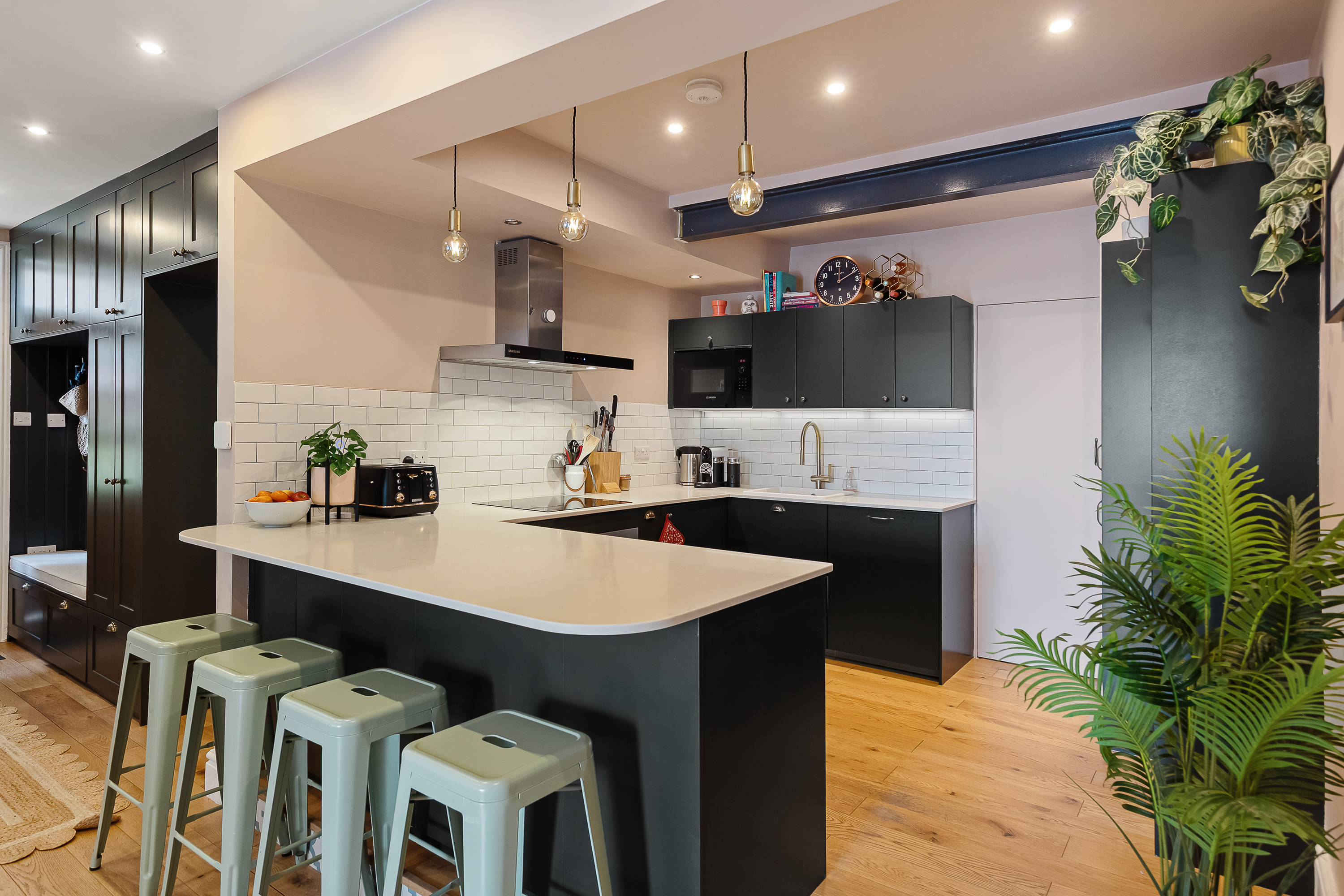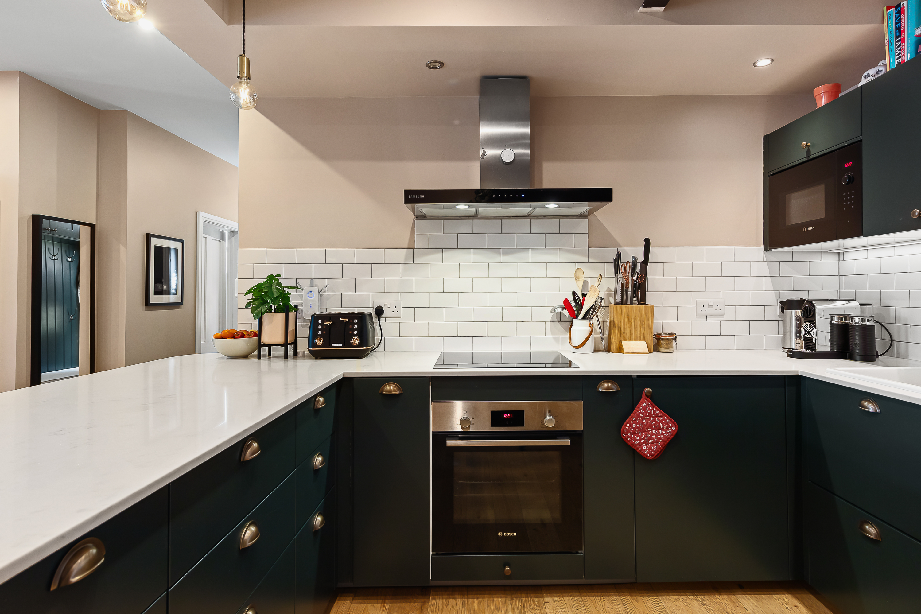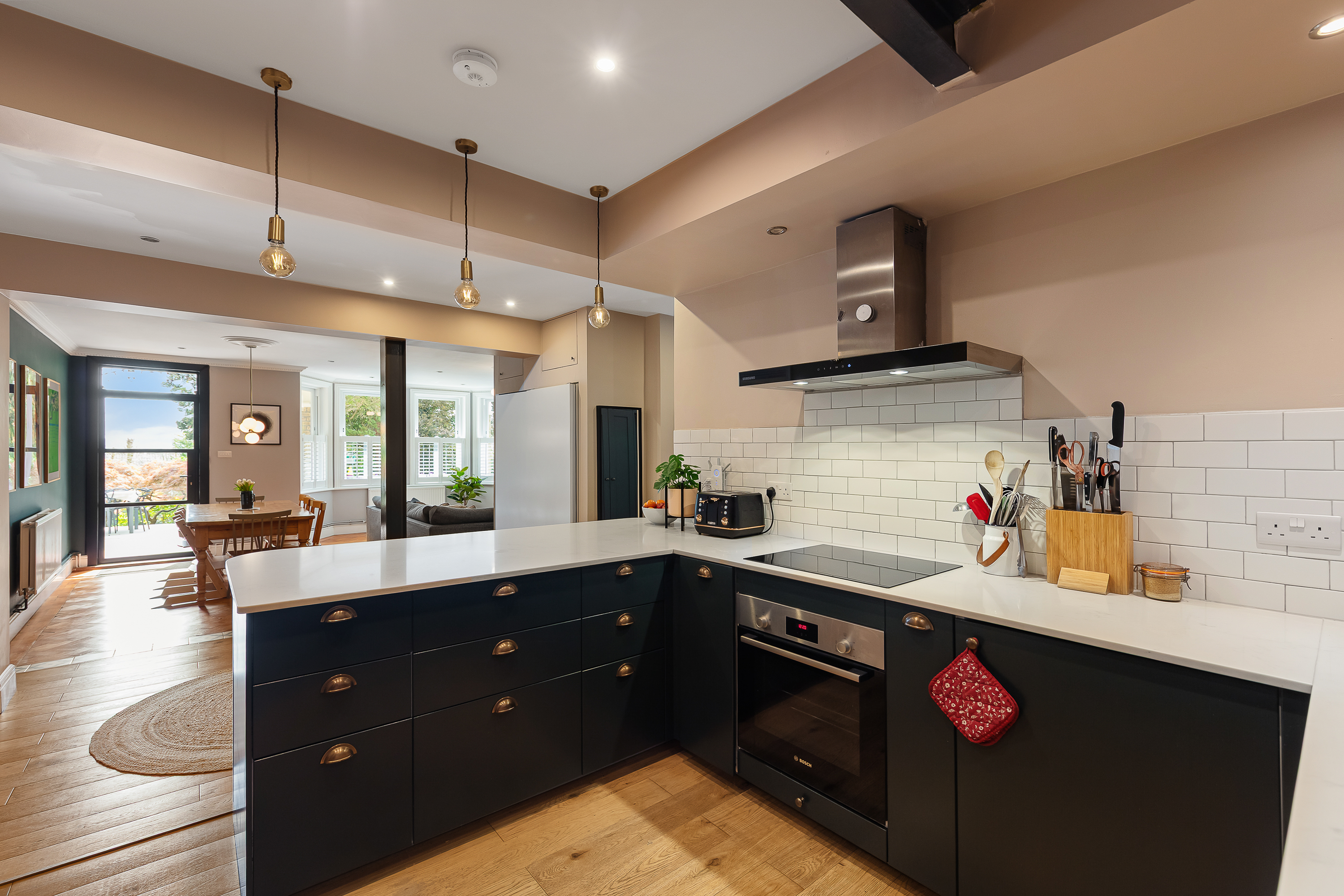 The kitchen sits adjacent to the living room in its own dedicated space, with a separate utility room alongside, which means the washing machine noise ends up exactly where it should, not in your kitchen or your bedroom. The kitchen itself has been fitted in matte units with white quartz worktops, white metro tile splashback, and an island with a white quartz top and bar stools for four. It's a sociable layout — you can cook and still be part of the conversation, and the island means there's a casual place to eat as well as the formal dining space next door. The pendant lighting above the island and the recessed spots above the worktops are well-judged details.