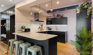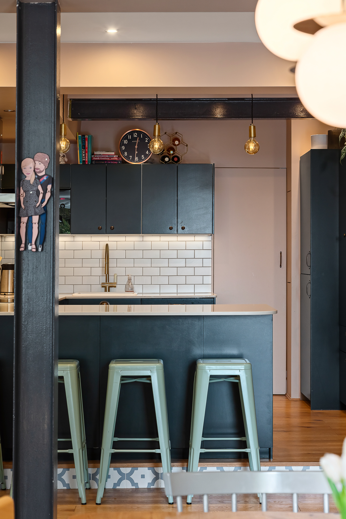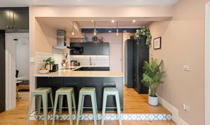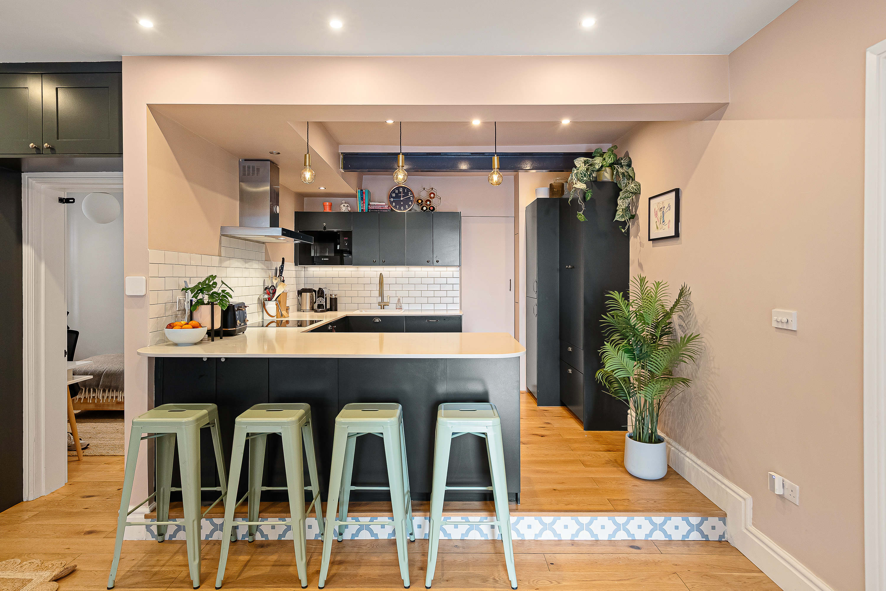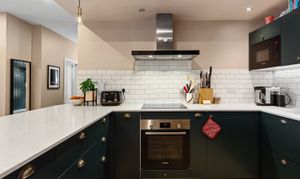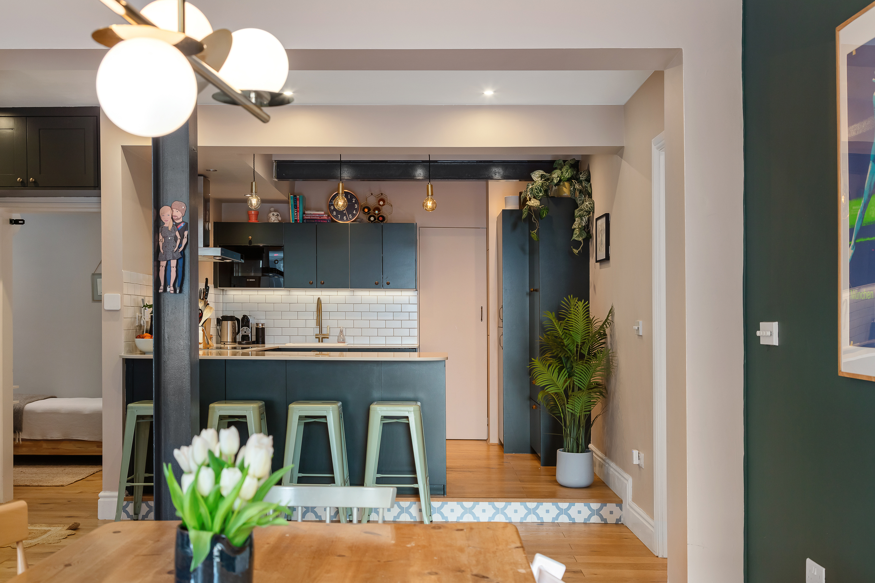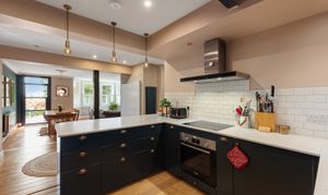 The kitchen sits adjacent to the living room in its own dedicated space, with a separate utility room alongside, which means the washing machine noise ends up exactly where it should, not in your kitchen or your bedroom. The kitchen itself has been fitted in matte units with white quartz worktops, white metro tile splashback, and an island with a white quartz top and bar stools for four. It's a sociable layout — you can cook and still be part of the conversation, and the island means there's a casual place to eat as well as the formal dining space next door. The pendant lighting above the island and the recessed spots above the worktops are well-judged details.