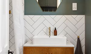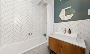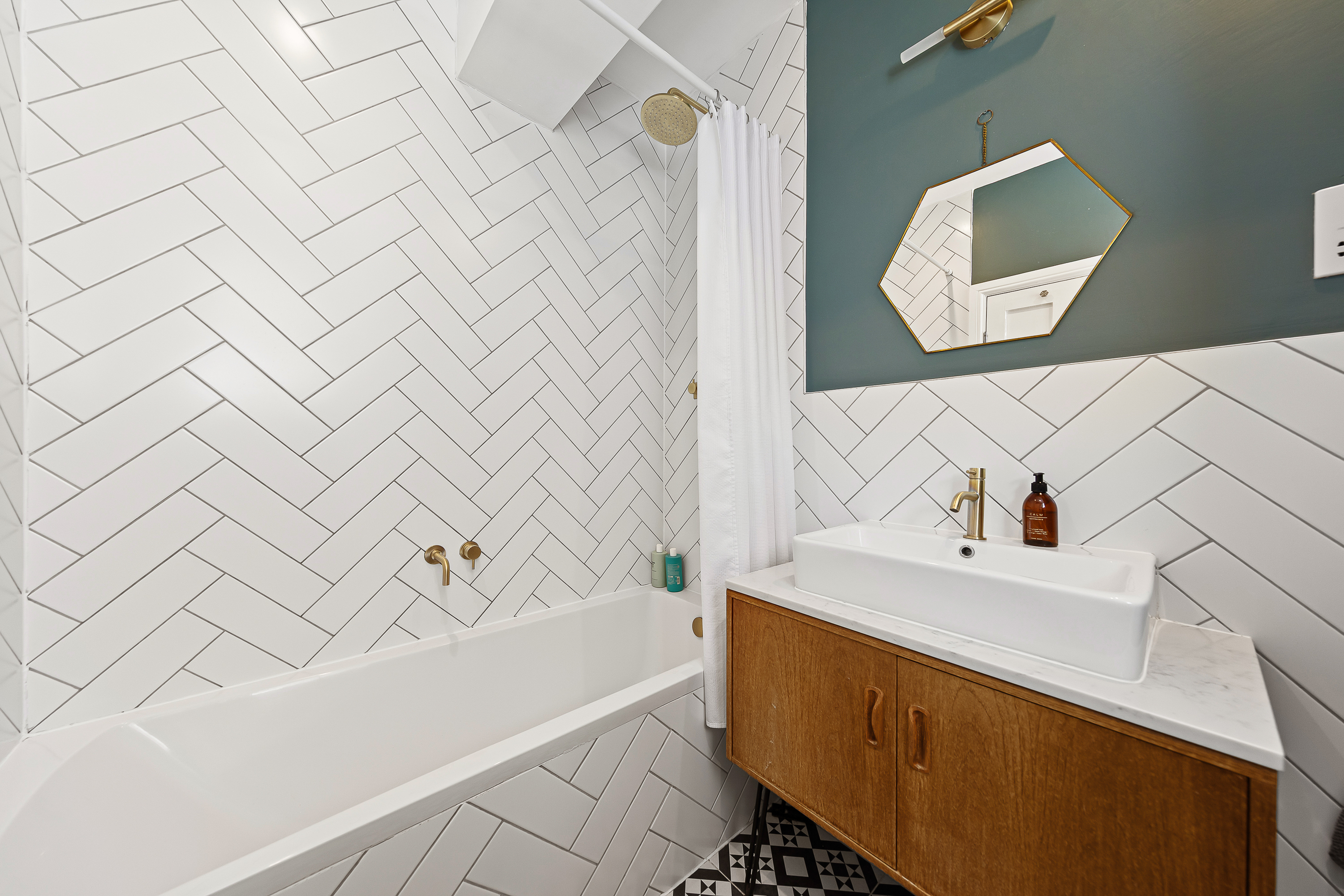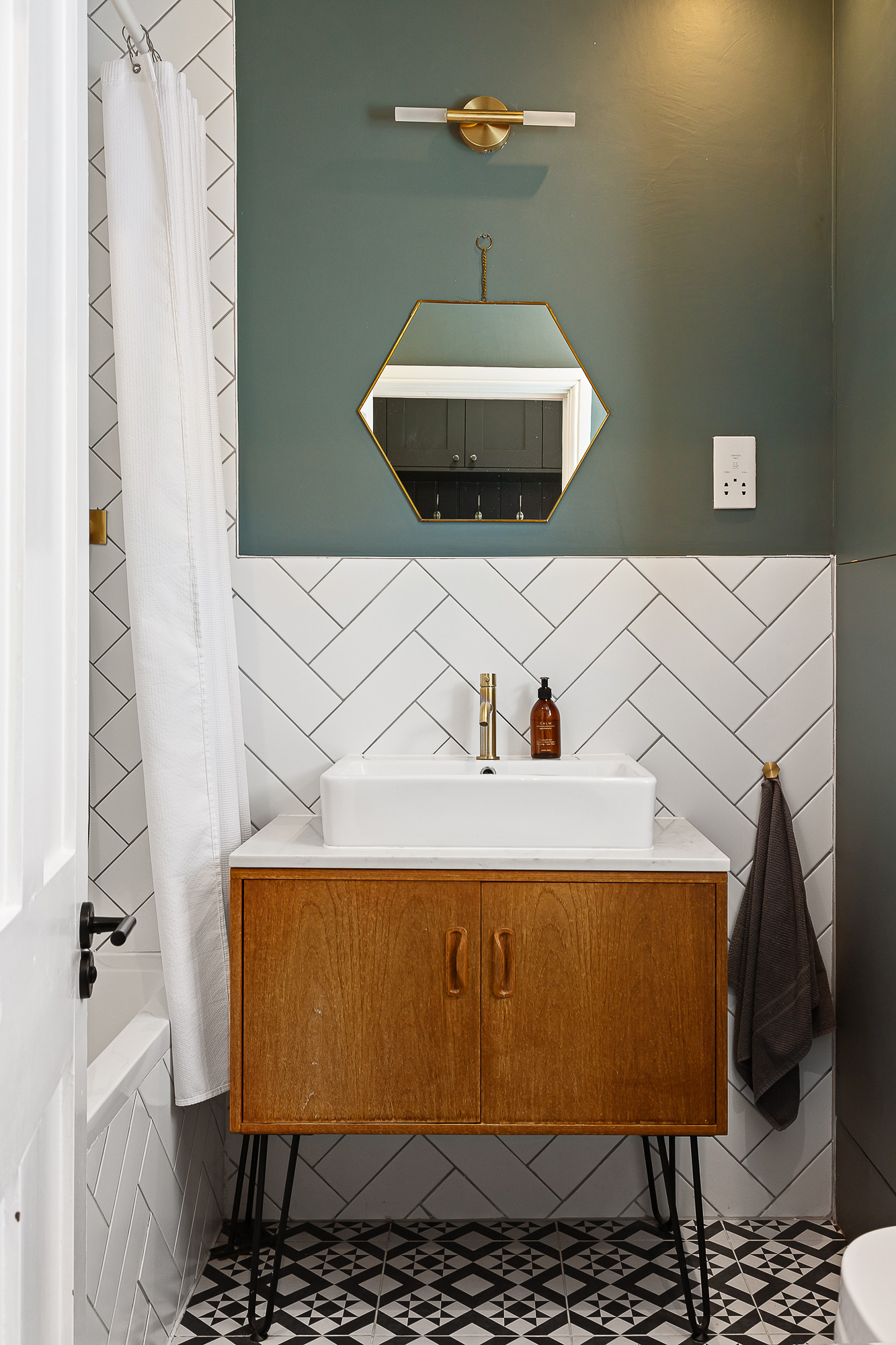 The bathroom has been done properly — full-size bath with overhead shower, white herringbone tiles laid floor to ceiling, gold fittings throughout, a walnut vanity unit with a vessel basin, geometric patterned floor tiles, and a teal feature wall behind a hexagonal gold-framed mirror. It's a confident room and it looks great.