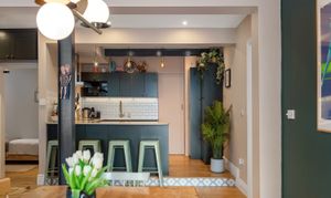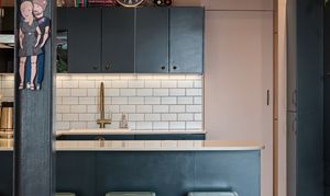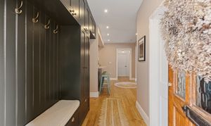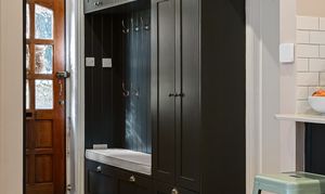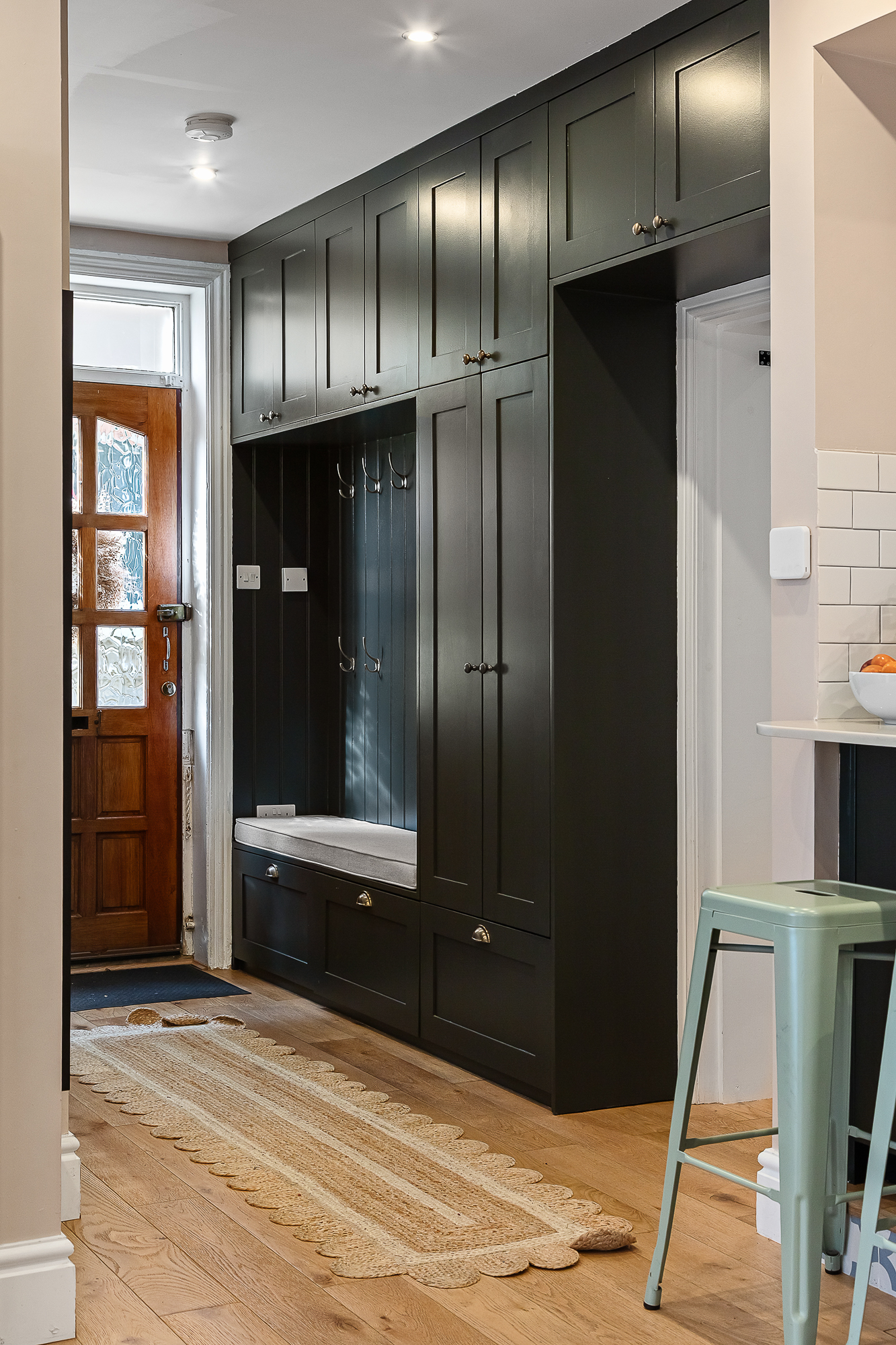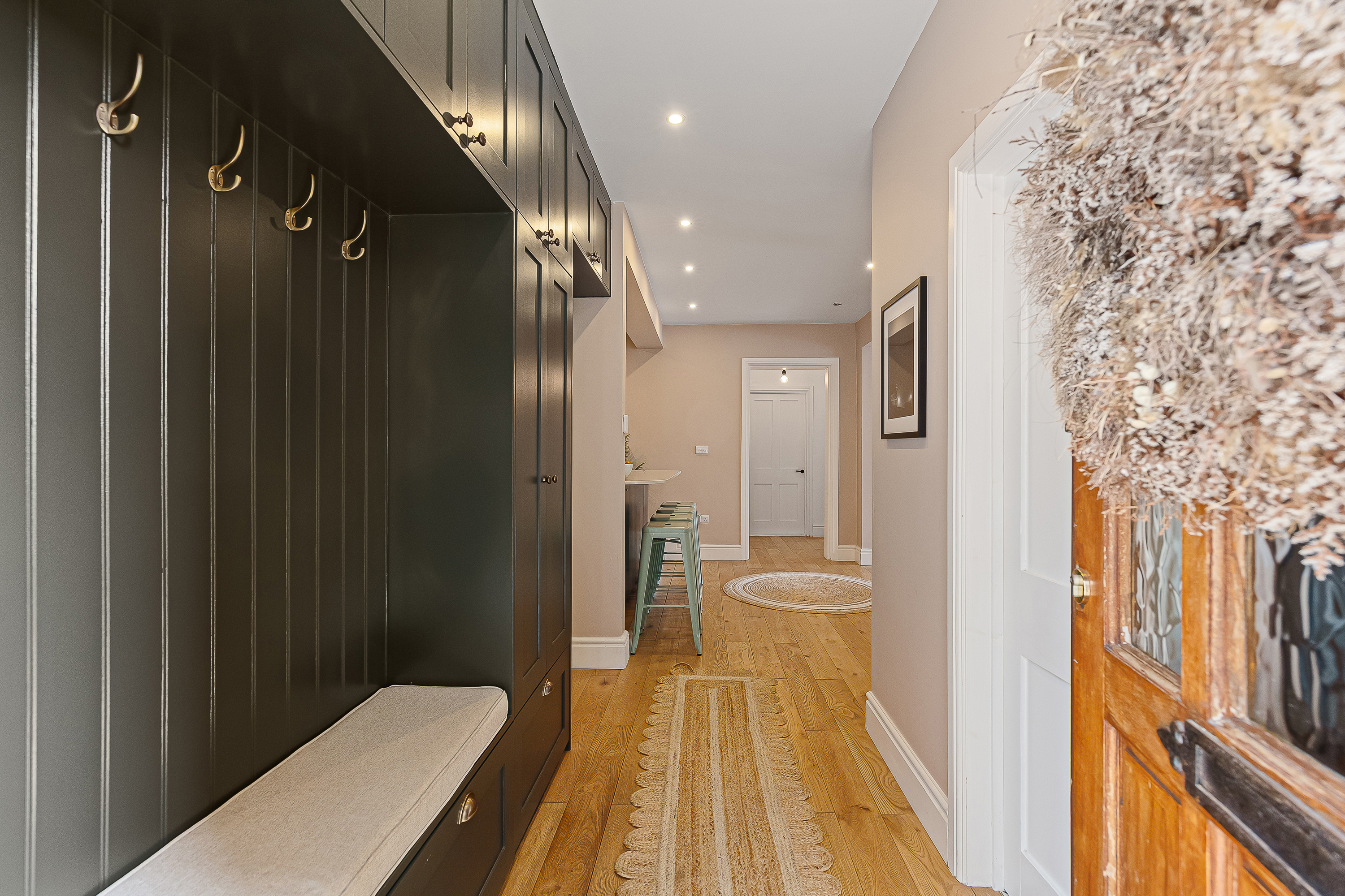 You enter into a proper hallway with a bespoke dark-painted fitted storage running the full length of one wall — hooks, cupboards, a bench seat, the works. It's the kind of entrance that solves the coat-and-shoes problem permanently and sets the tone for a flat that has been thought about properly throughout. Oak flooring runs the length of the hallway and continues through into the main living space.