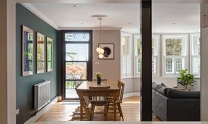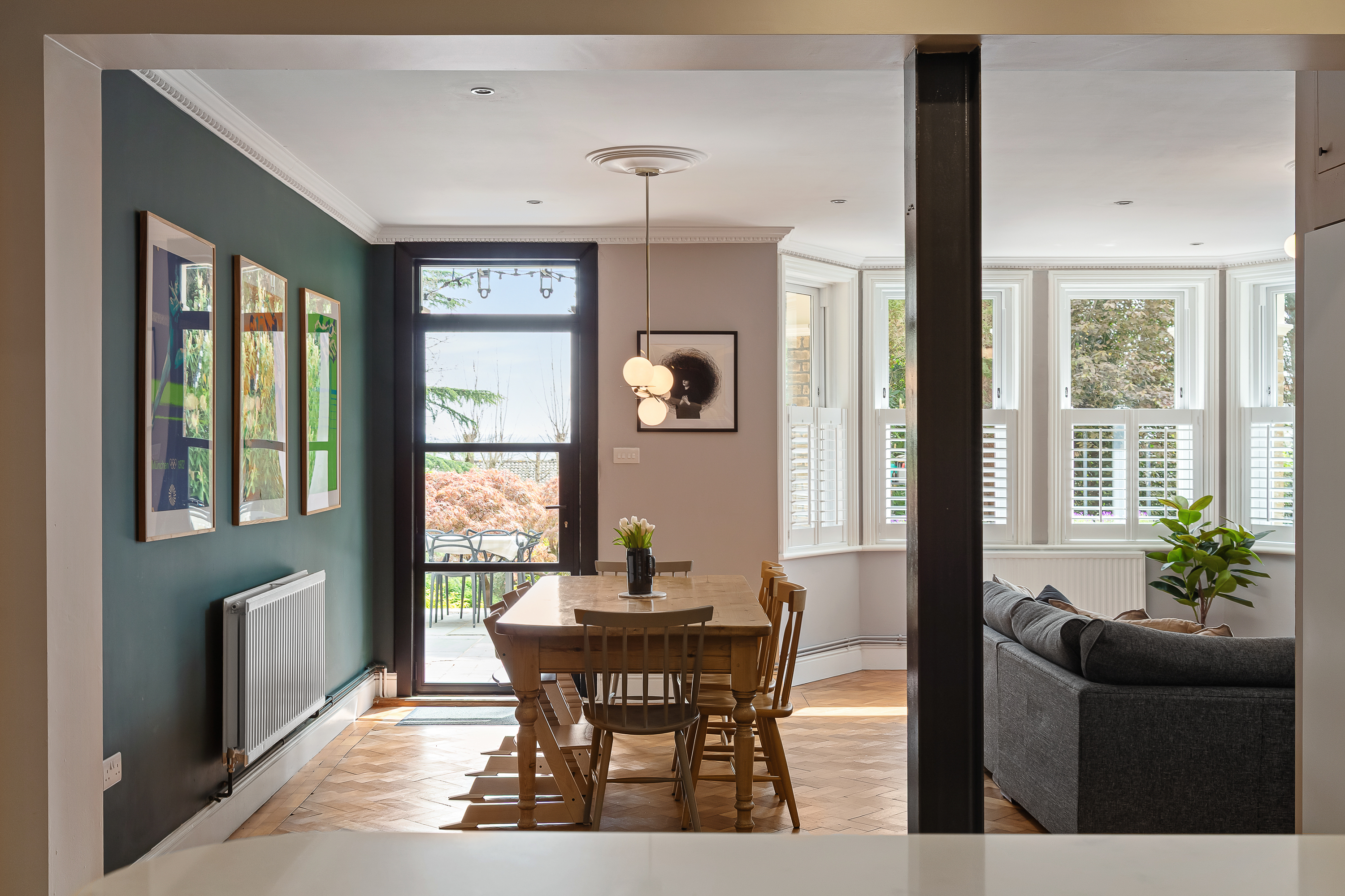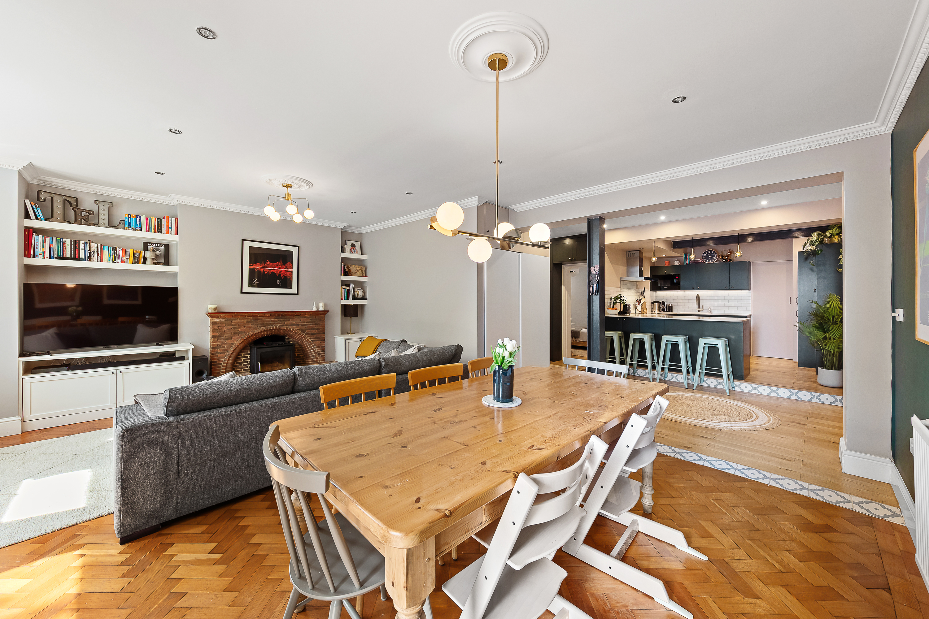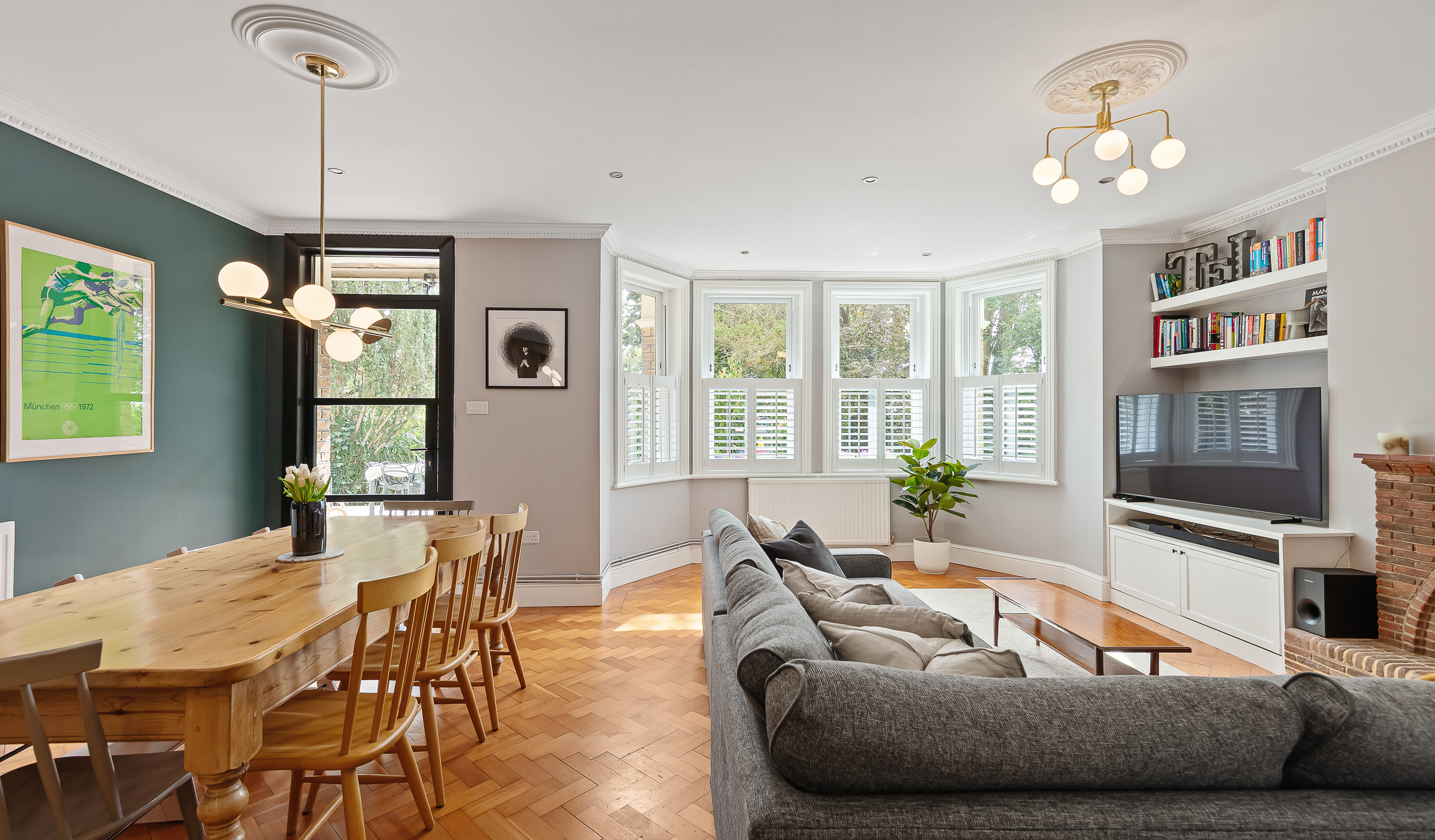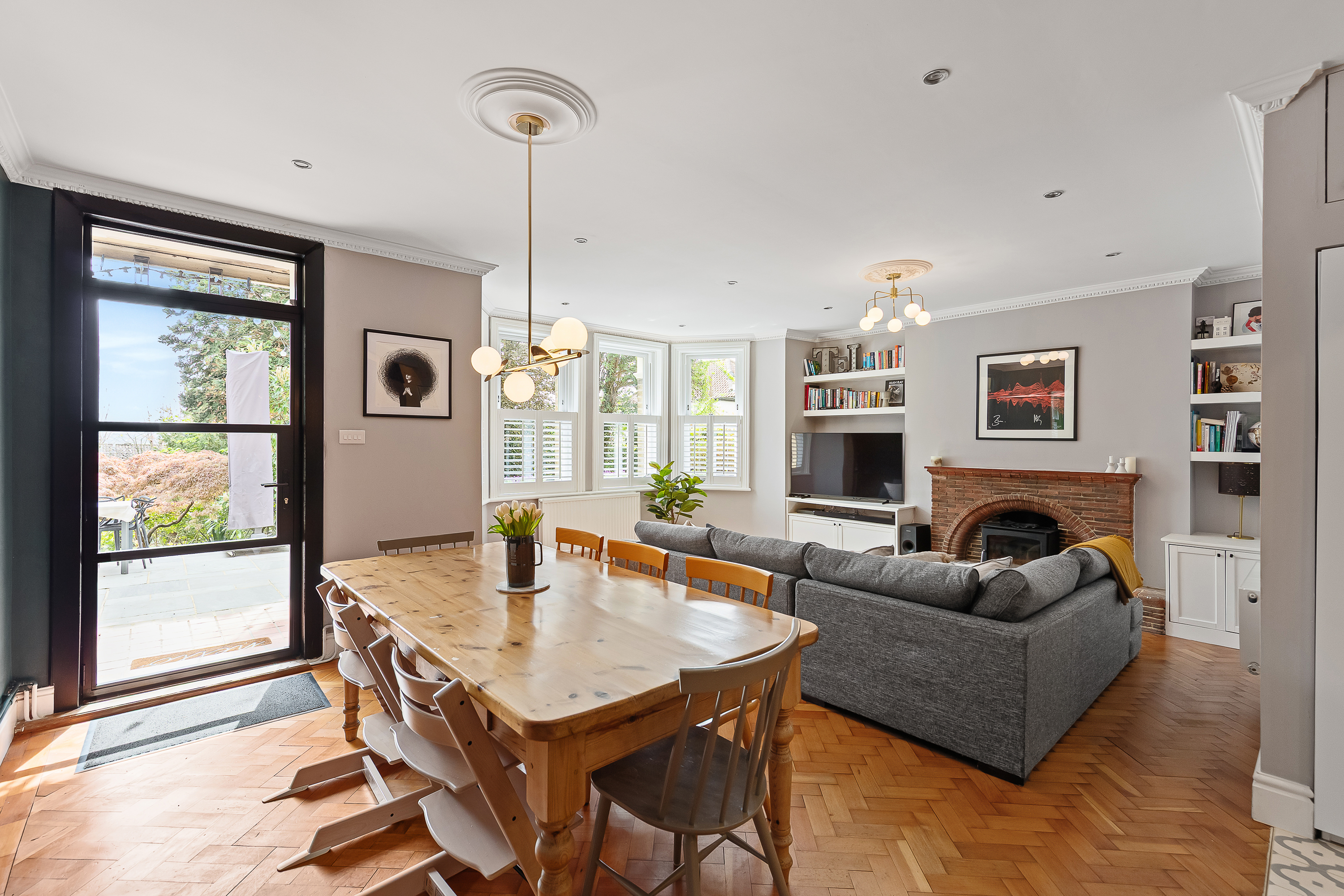 The living and dining room is the heart of the flat at 21'3 x 17'2, and it really does deliver. Hardwood parquet flooring, a beautiful brick fireplace with a wood-burning stove, a full bay window with wooden shutters facing the garden, characterful period-style coving and ceiling rose, and a large Crittall-style door opening directly onto the south-facing patio — so on a good day, the access to the outside space really flows. A large dining table for eight sits naturally between the living area and the garden door; the current owners have a full corner sofa arrangement at the other end, and there is still floor space left. Notably. You can opt for a larger table if you really love entertaining a crowd, and there’s scope for a clutch of sofas to fit comfortably in this space. The built-in alcove shelving on either side of the fireplace is a lovely period detail that most buyers will appreciate. This is a room that works hard all year — in summer with the garden door open, in winter with the stove going, it's equally good.