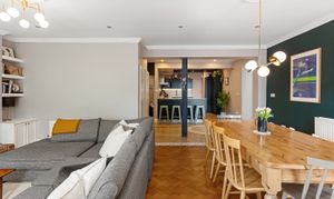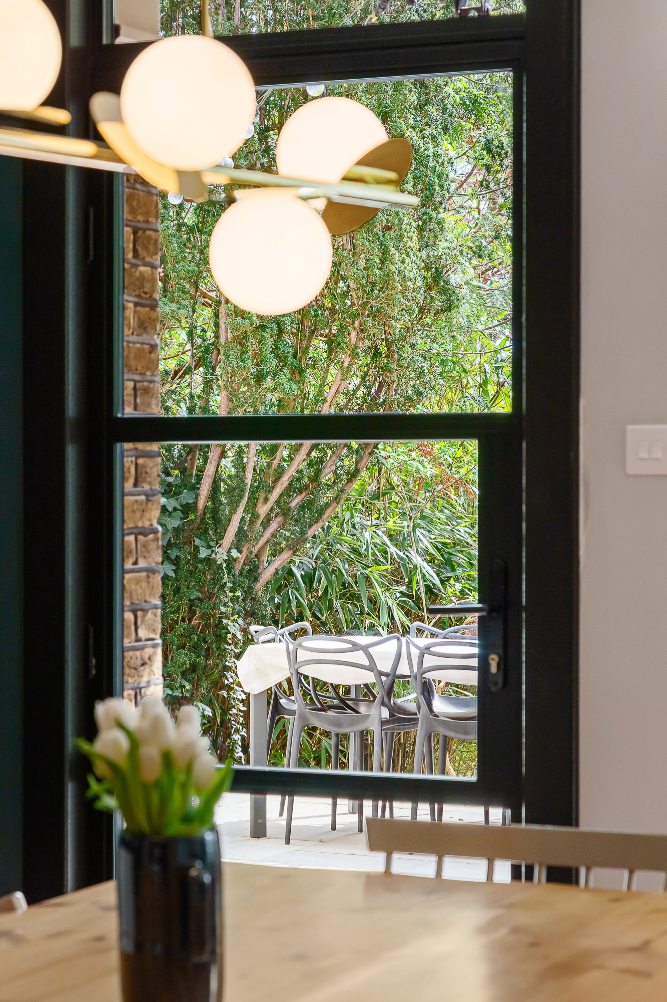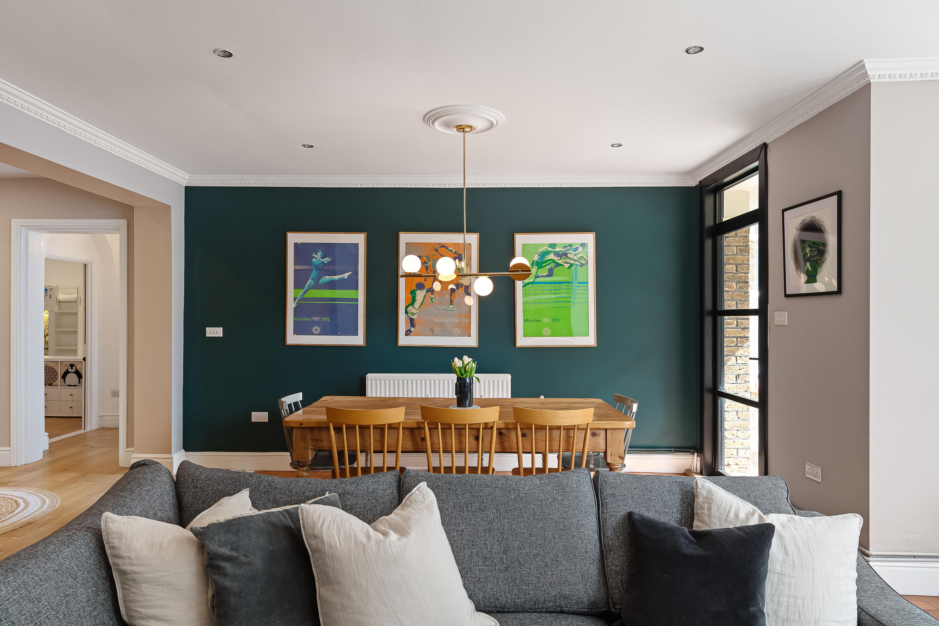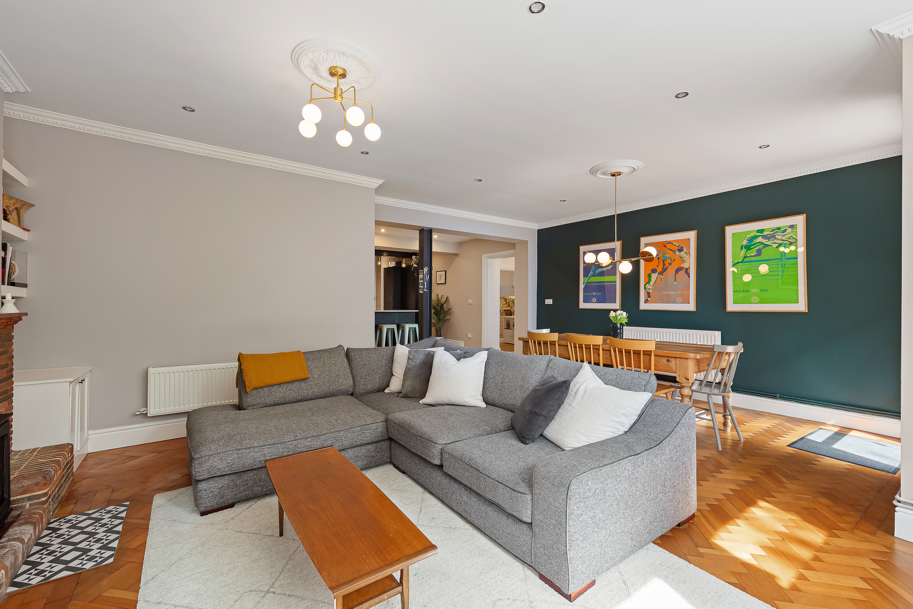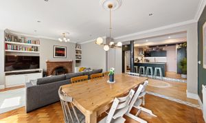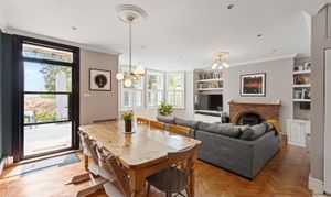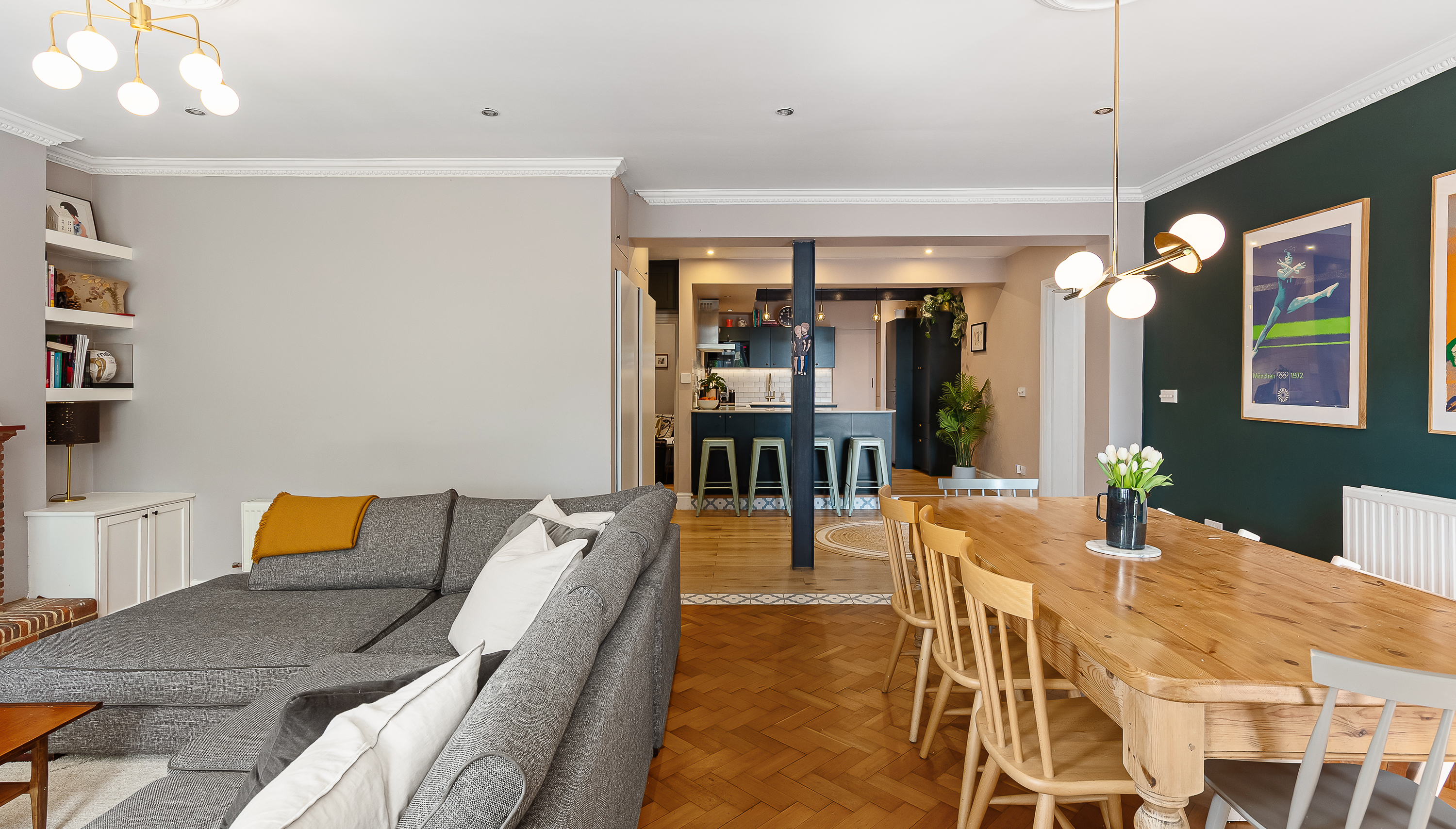 The living and dining room is the heart of the flat at 21'3 x 17'2, and it really does deliver. Hardwood parquet flooring, a beautiful brick fireplace with a wood-burning stove, a full bay window with wooden shutters facing the garden, characterful period-style coving and ceiling rose, and a large Crittall-style door opening directly onto the south-facing patio — so on a good day, the access to the outside space really flows. A large dining table for eight sits naturally between the living area and the garden door; the current owners have a full corner sofa arrangement at the other end, and there is still floor space left. Notably. You can opt for a larger table if you really love entertaining a crowd, and there’s scope for a clutch of sofas to fit comfortably in this space. The built-in alcove shelving on either side of the fireplace is a lovely period detail that most buyers will appreciate. This is a room that works hard all year — in summer with the garden door open, in winter with the stove going, it's equally good.