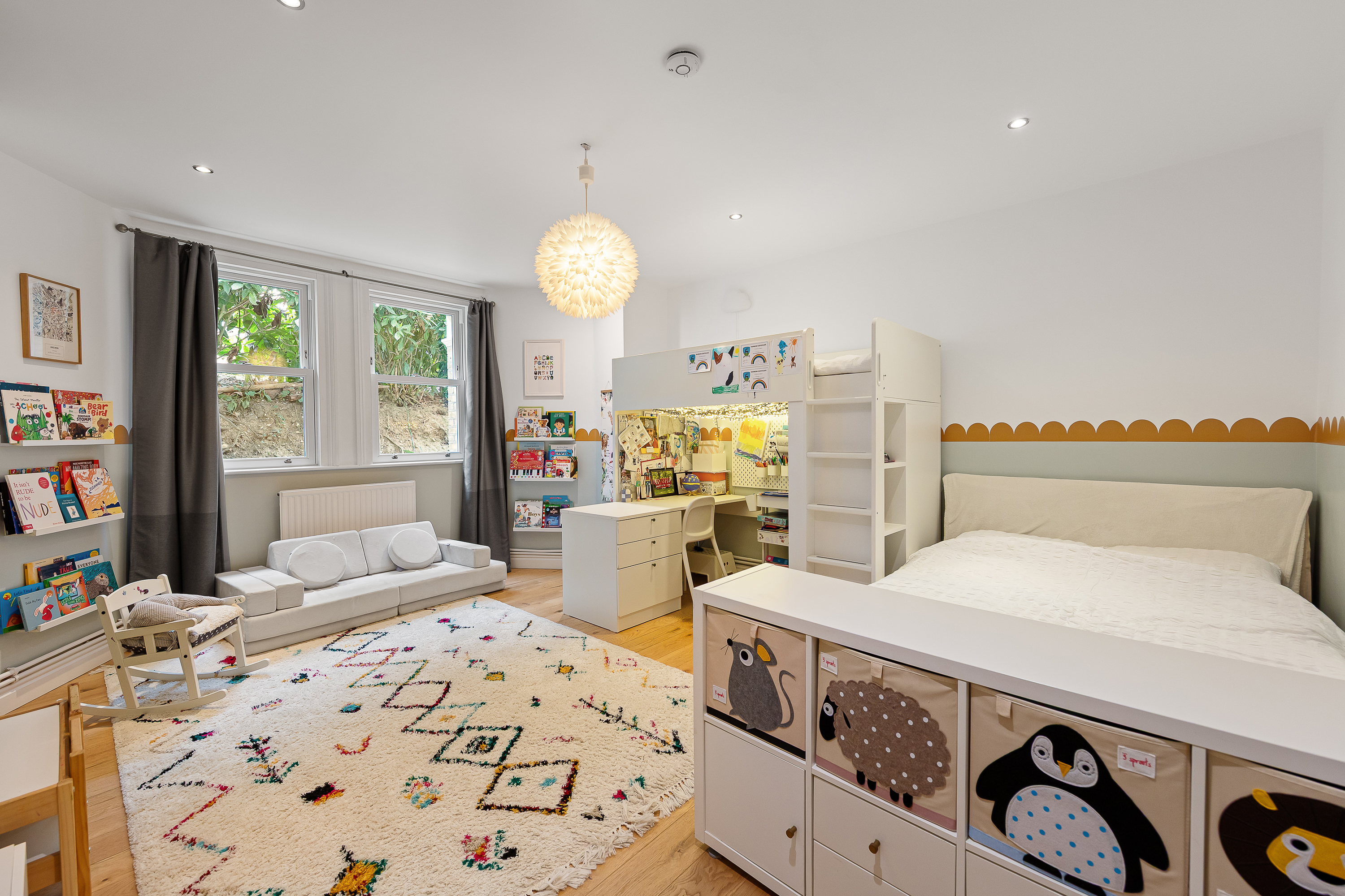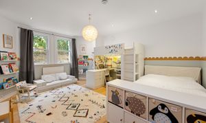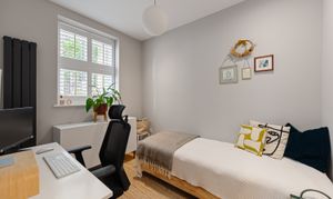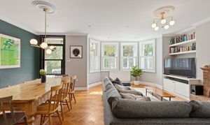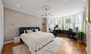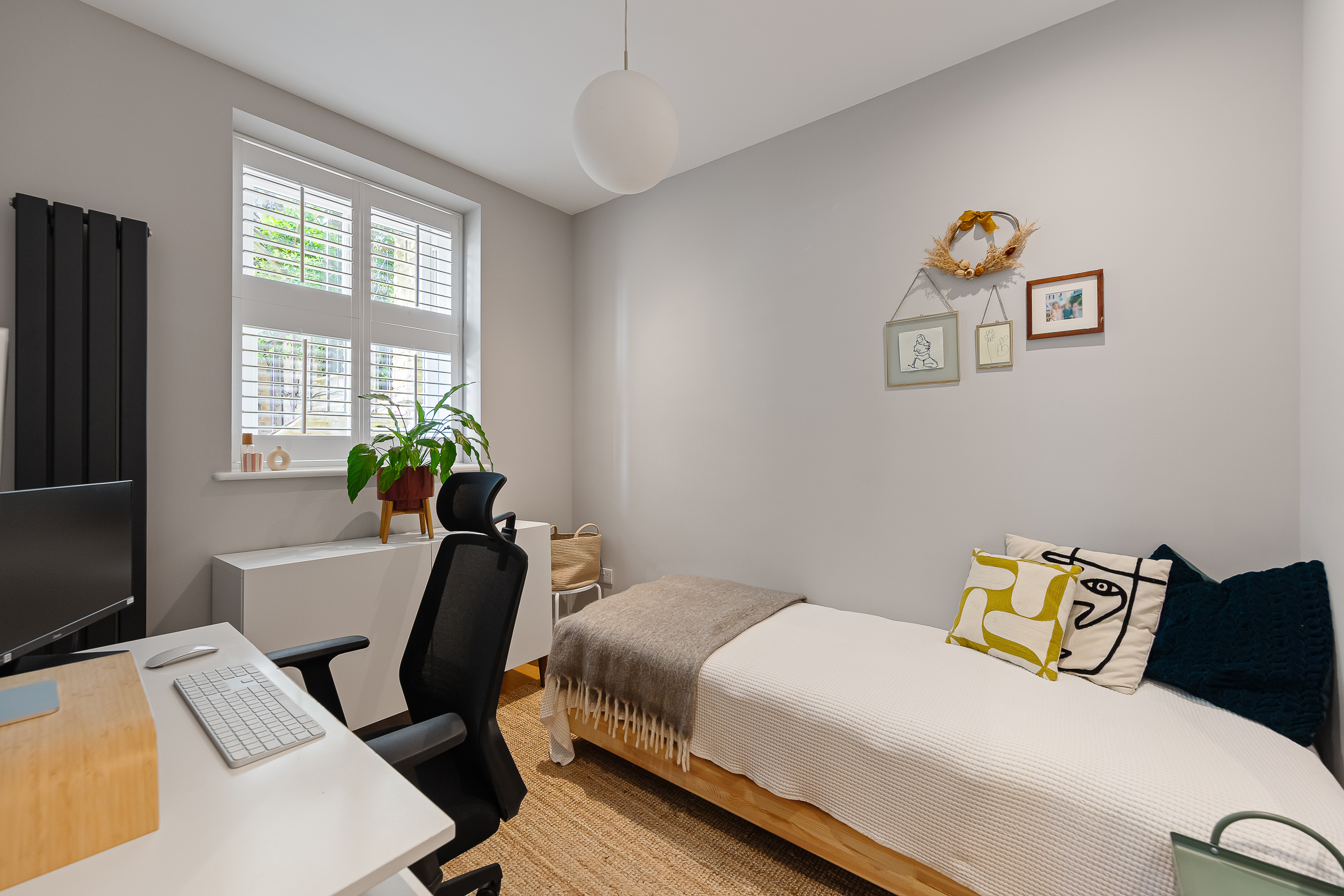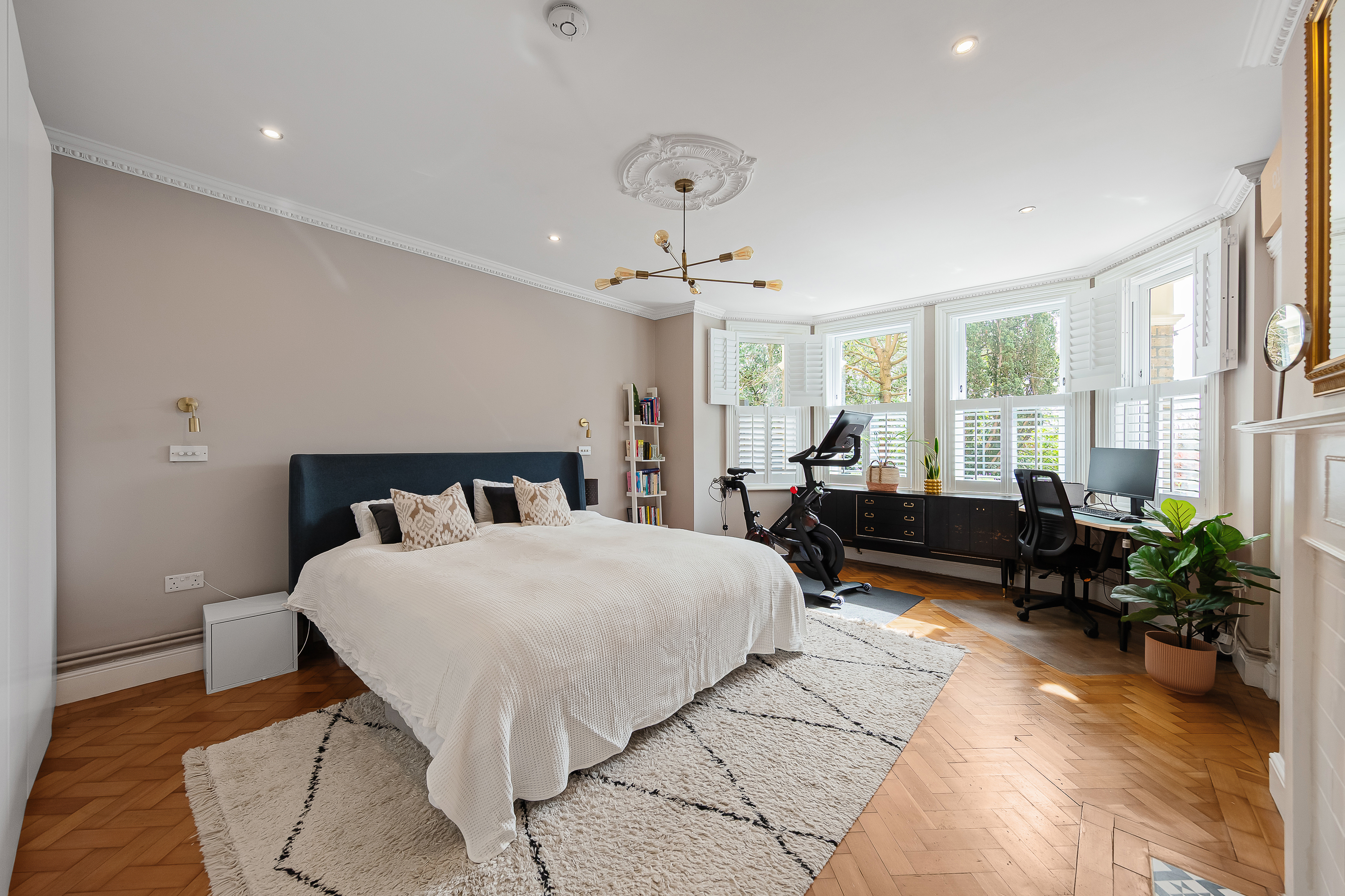 Bedroom one at 19'6 x 15'6 is, frankly, a spectacular principal bedroom for a flat at any price. There’s more beautiful parquet flooring, a full bay window with wooden shutters, original coving and a ceiling rose, a period fireplace, and room for a super king-size bed, a Peloton, a desk setup, and freestanding storage — simultaneously and comfortably. Bedroom two at 17'3 x 15'5 is equally impressive — another huge double with its own bay window, shutters, and the same period detail. Both rooms would dwarf most flats’ living spaces, such are the dimensions. Bedroom three at 11'0 x 9'9 is the smallest of the three but is still a small double, which works well as a guest room, or home office combined, which it handles easily.