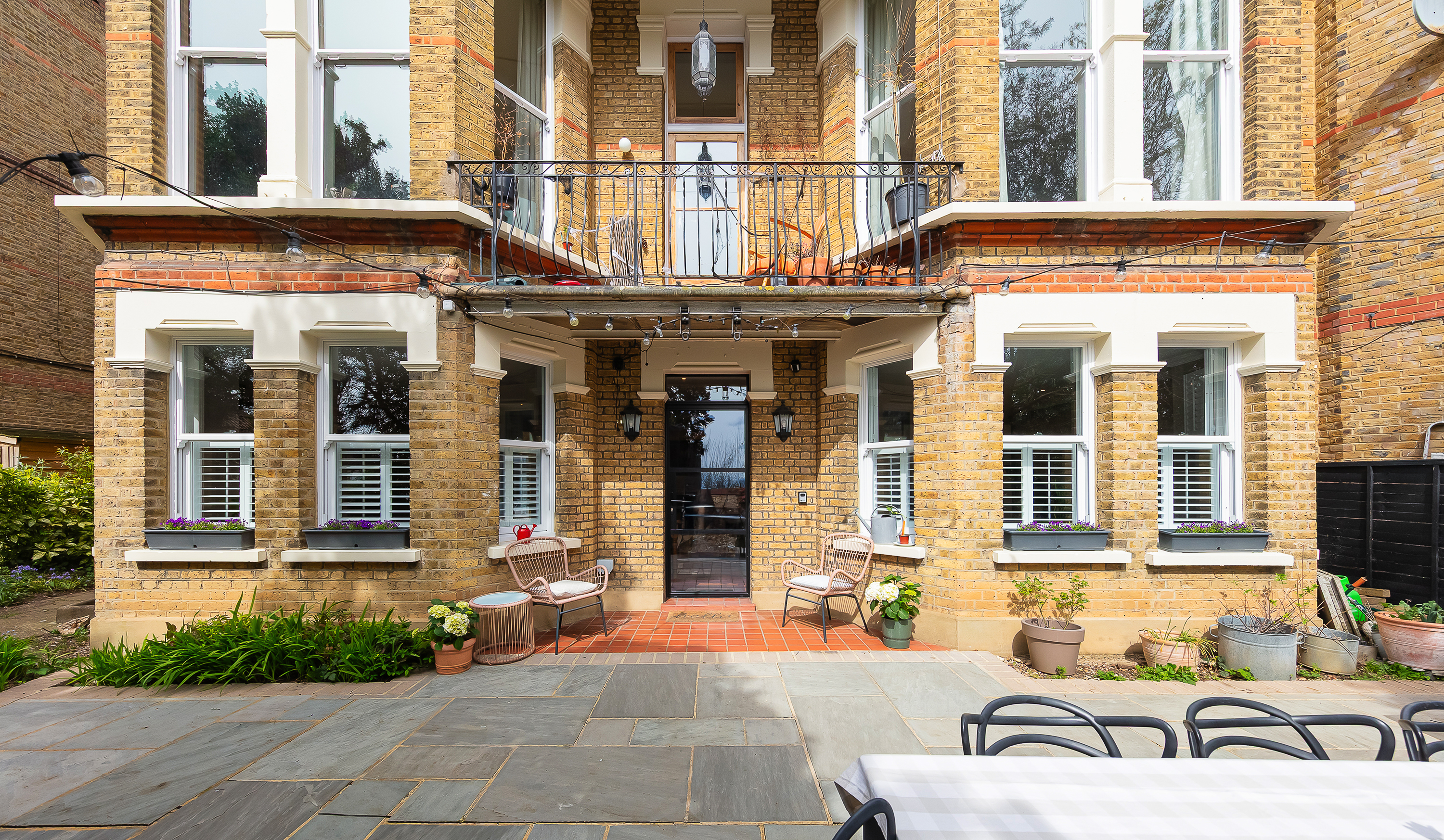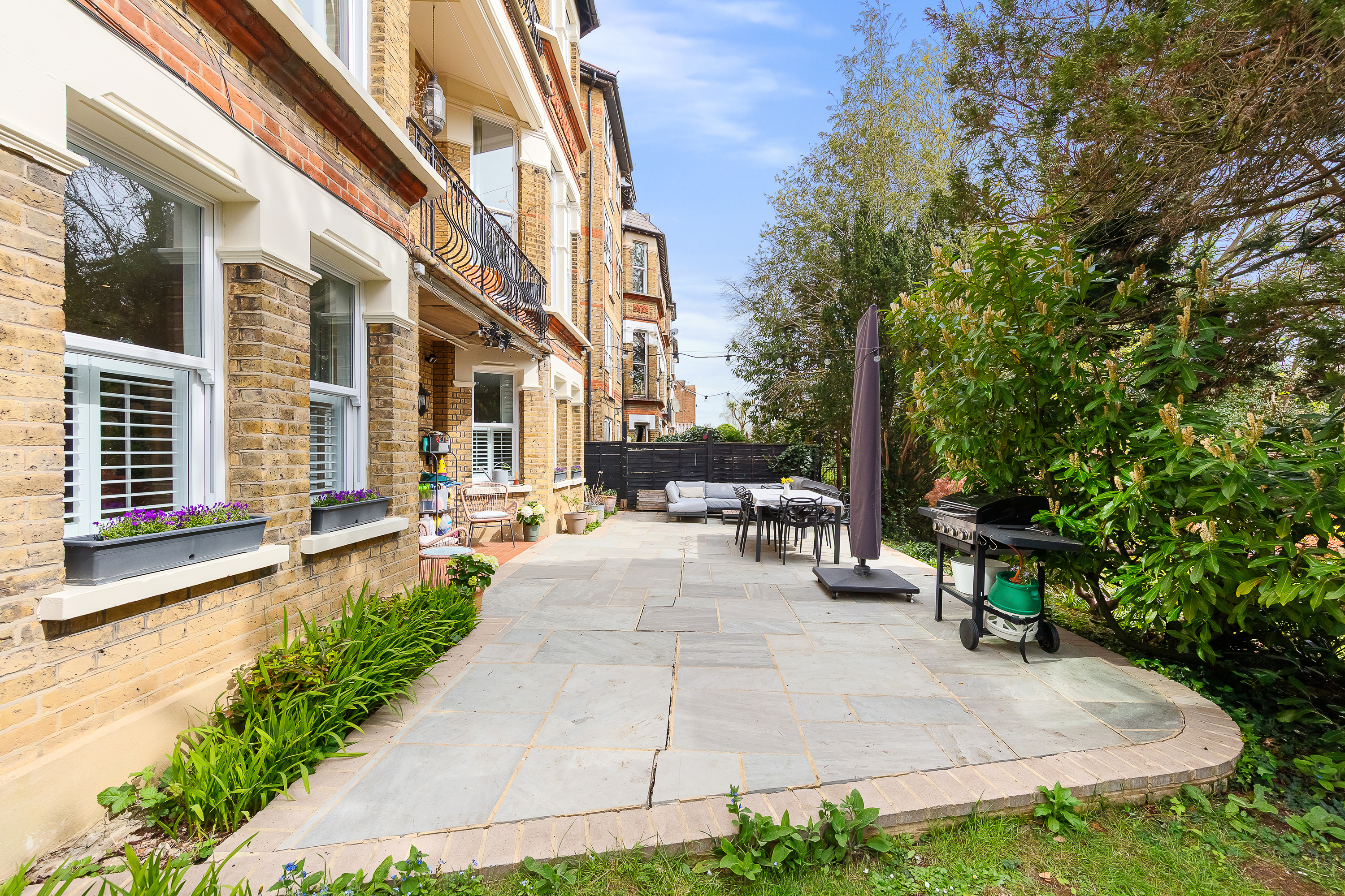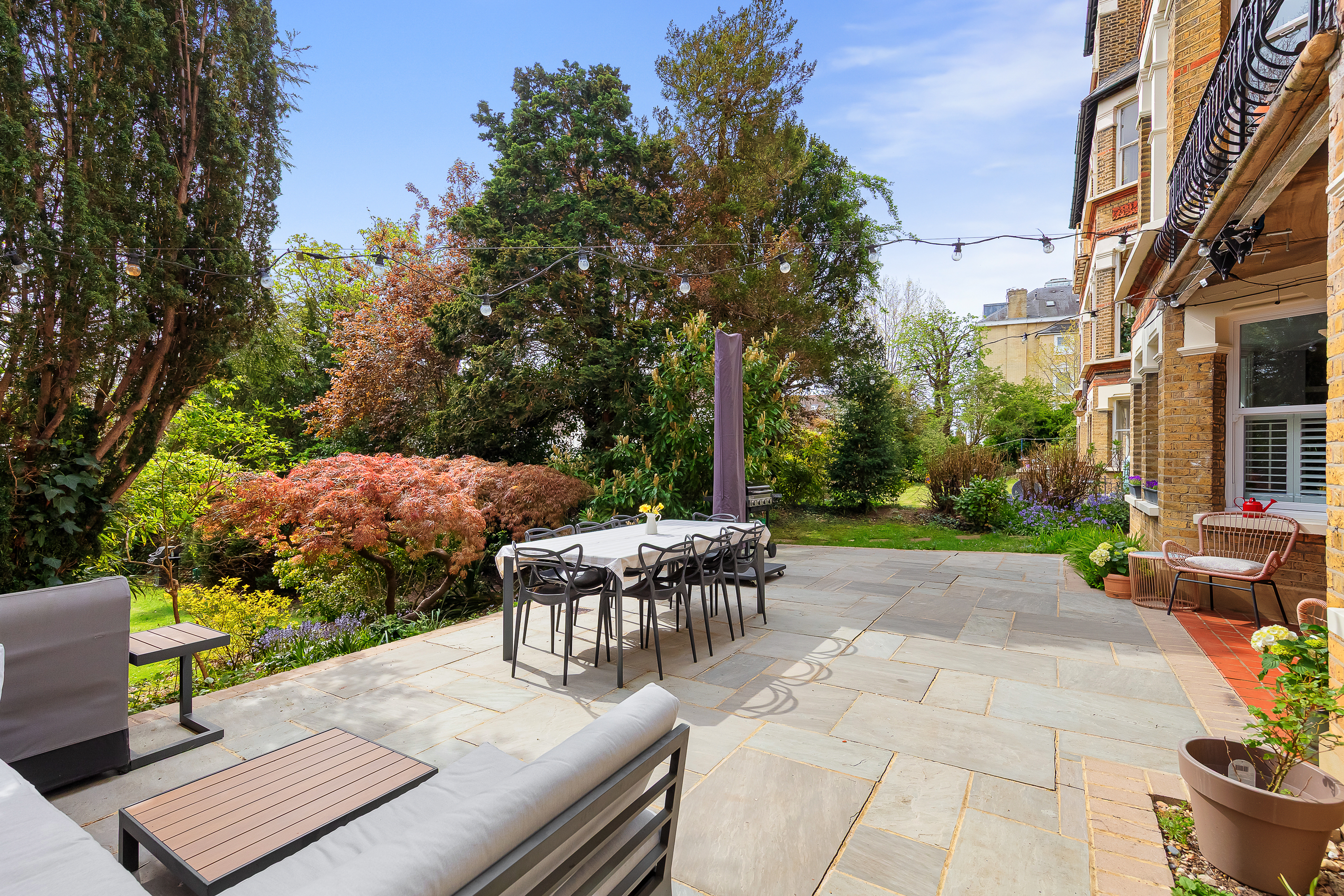 Outside, the south-facing stone patio is accessed directly from the living room and is large enough for a full outdoor dining set and a lounge area — the current owners have both. Beyond the patio, the gardens are beautifully maintained and extend generously; they feel more like private grounds than a shared afterthought. In the sun, this is one of the best outdoor spaces you'll find with a flat at this price in SE25.