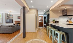 Set across the ground floor of a detached Victorian villa on one of SE25's best roads, which borders Crystal Palace and is an easy walk to Triangle. It’s set back from the street behind a gravelled driveway with mature planting. The private entrance for the flat is down the right side of the building, and adds something that's easy to underestimate until you have it — a degree of privacy.