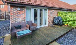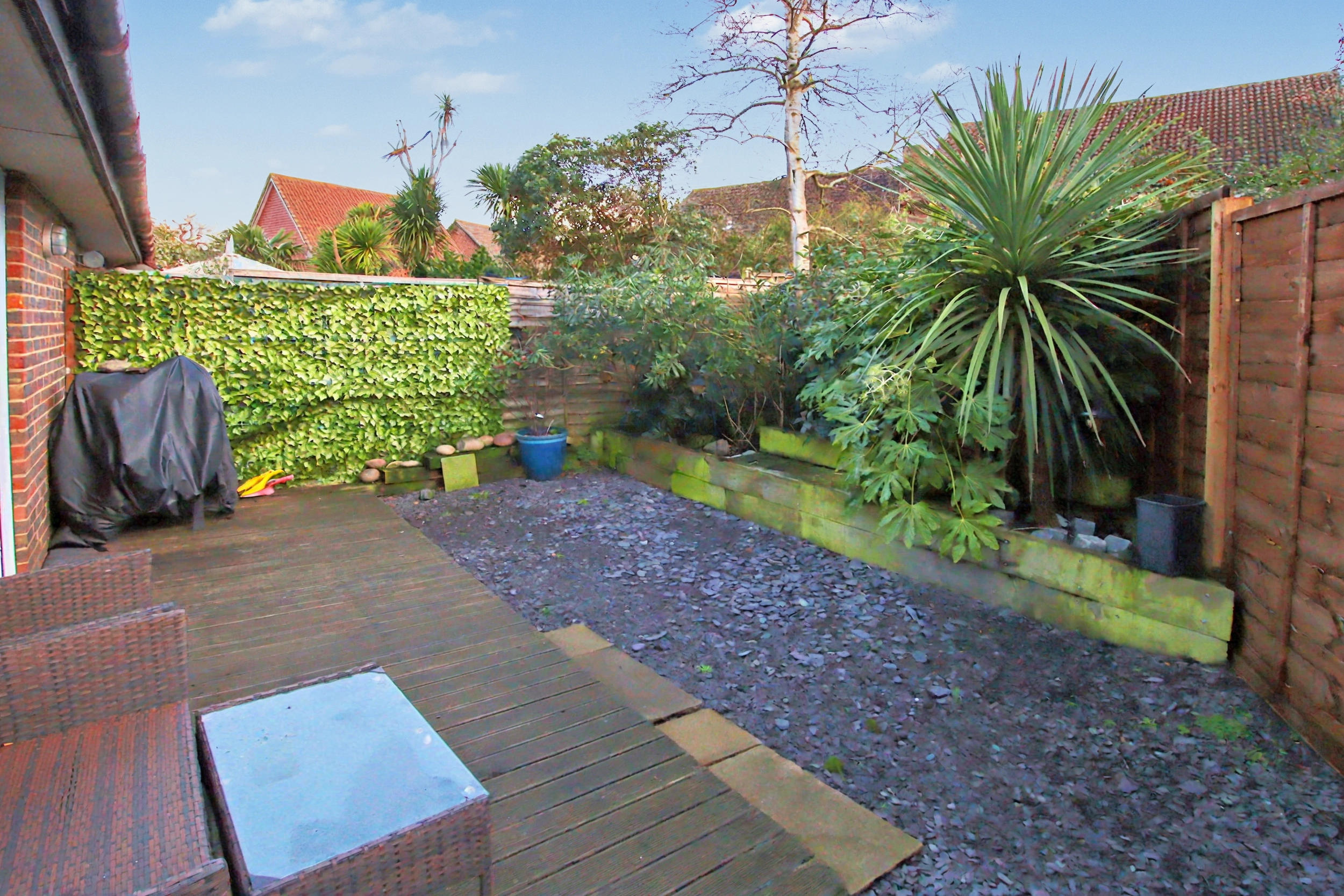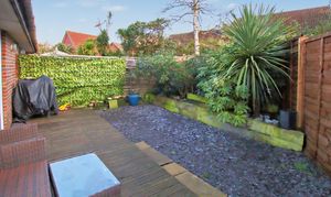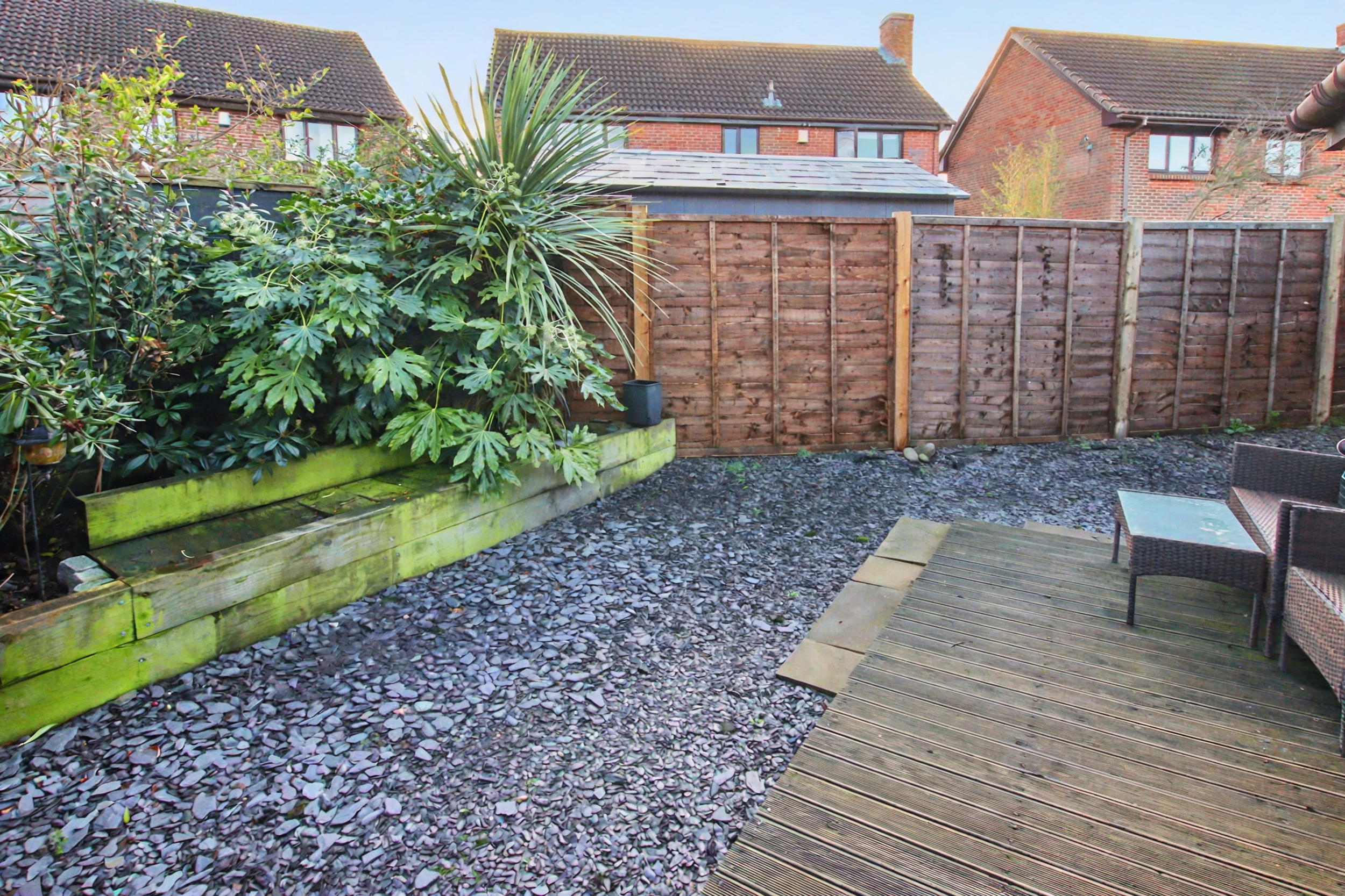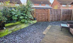 A secluded private rear garden offering a tranquil spot for a BBQ in the summer. The measurement shown does not include a bonus space to the side of the house that houses the cabin, which offers a versatile space for working from home, a gym, a hobbies room, or additional storage. There is also a pedestrian gate onto Tulip Close.