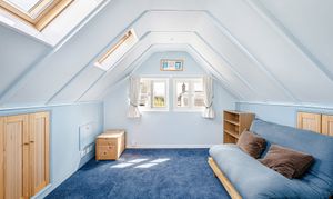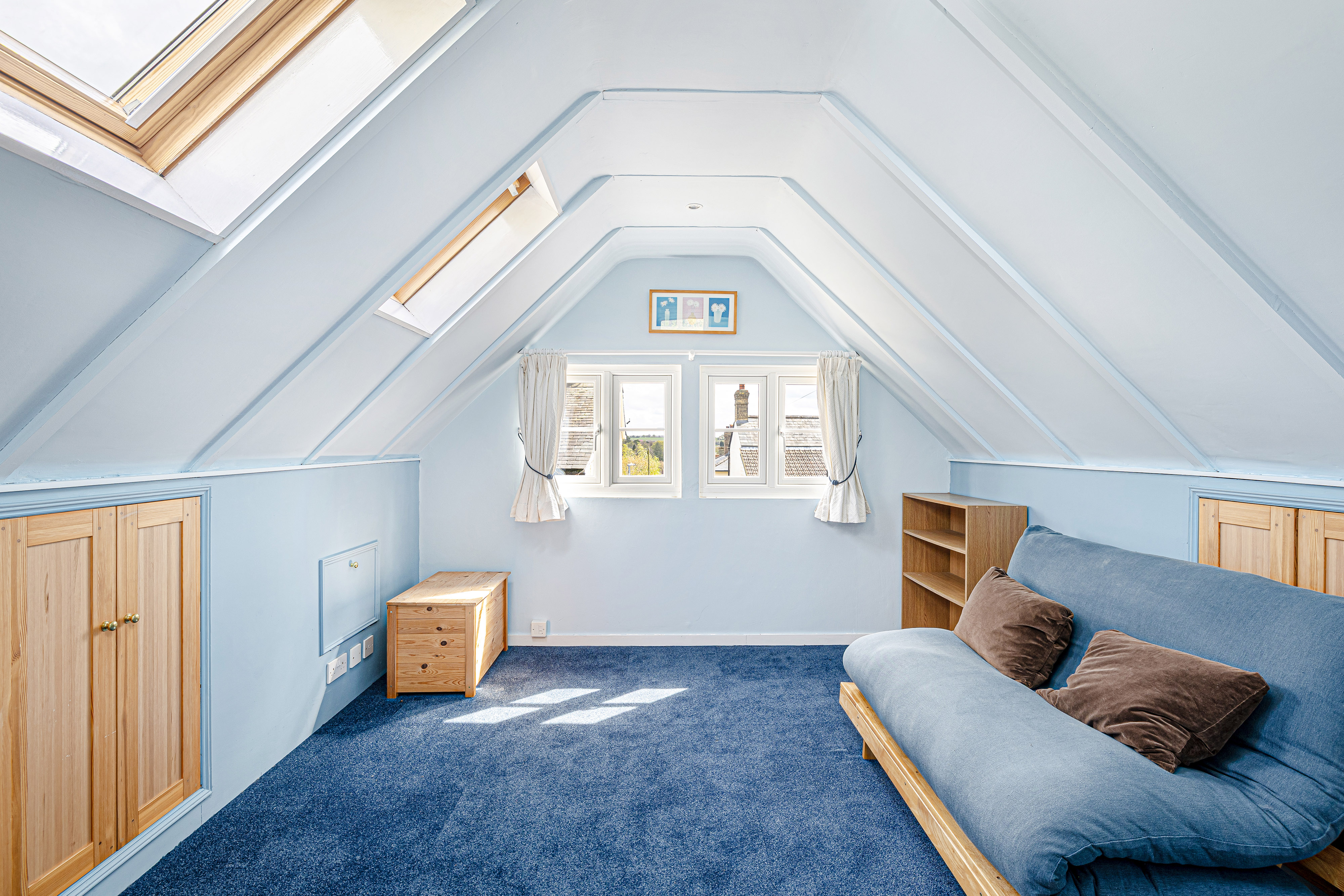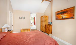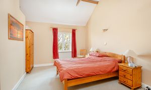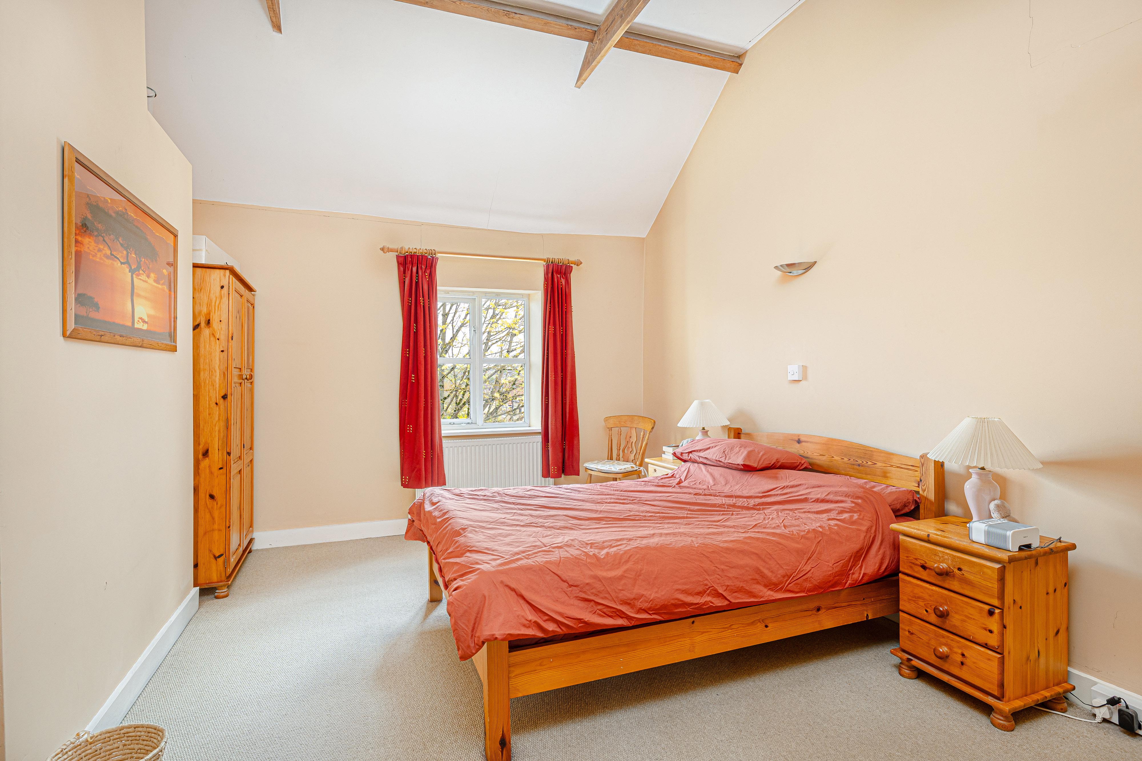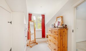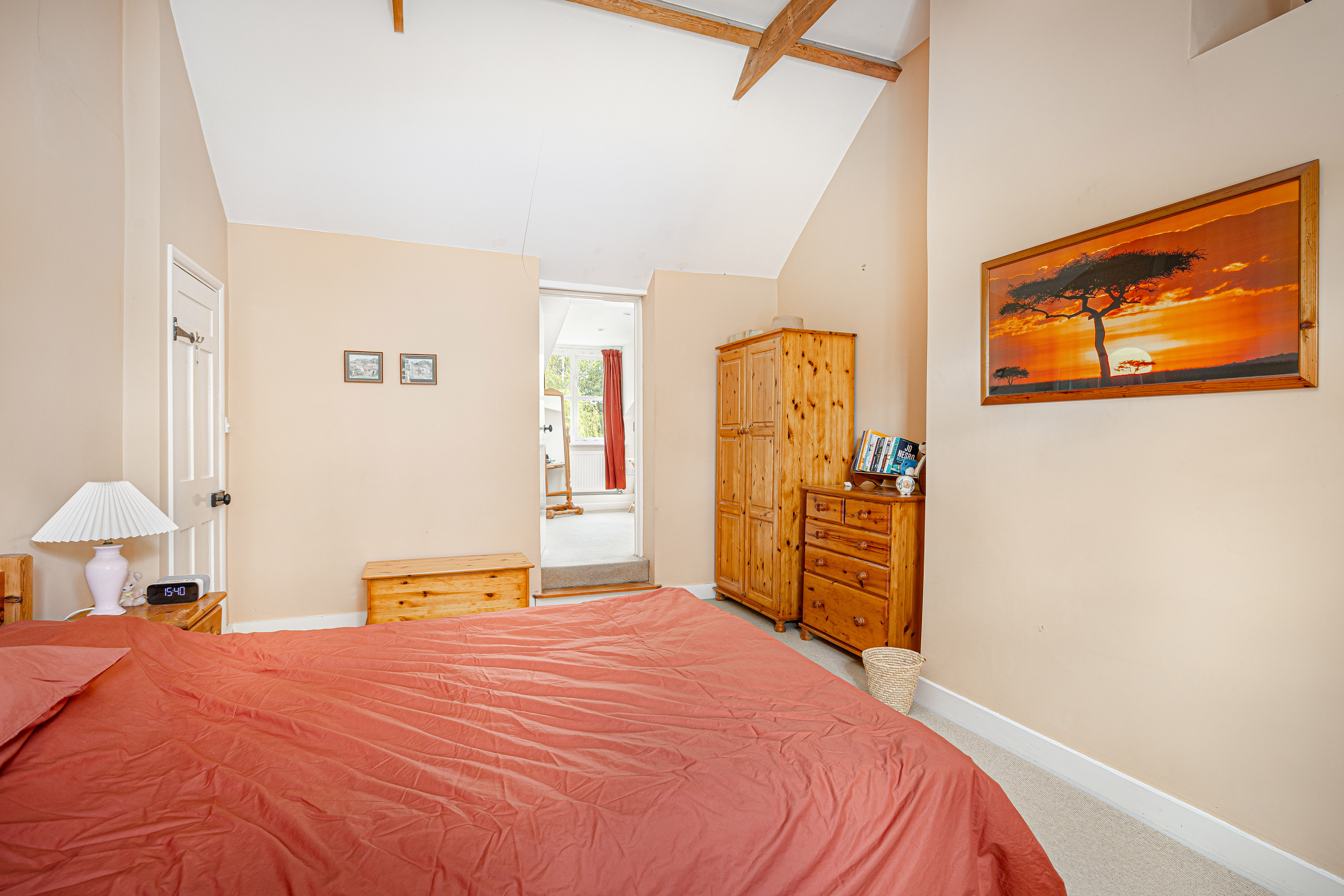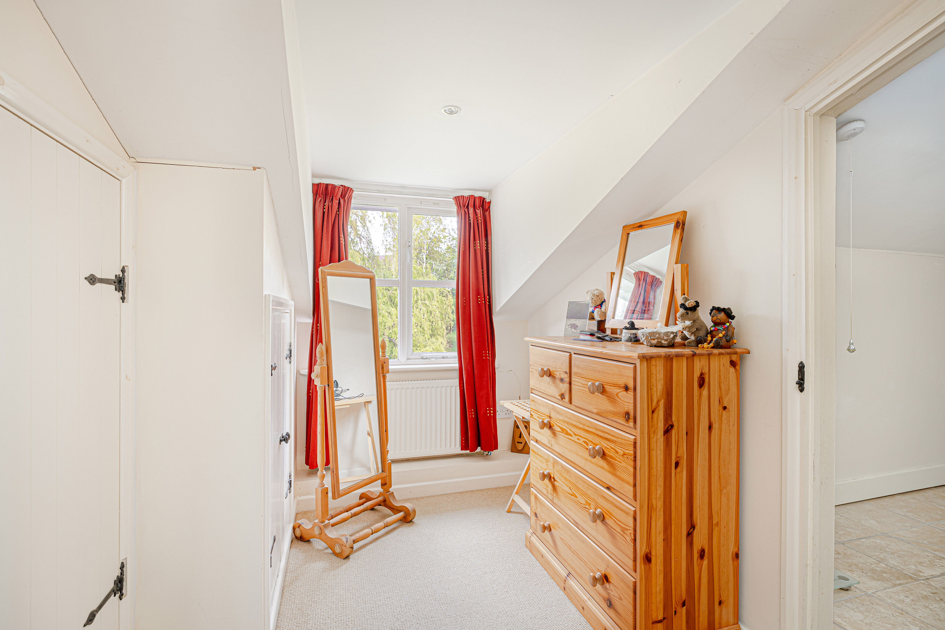 On the first floor are four well-proportioned bedrooms, all enjoying a lovely sense of character. The principal bedroom is especially impressive, with vaulted ceiling detail and exposed timbers, together with an adjoining dressing area offering substantial cupboard space, and a separate shower room with a useful eaves storage cupboard, which gives the principal suite a distinctive and highly practical feel. The remaining bedrooms are all comfortable in size and are served by a spacious family bathroom, ensuring the house is well equipped for busy family life.