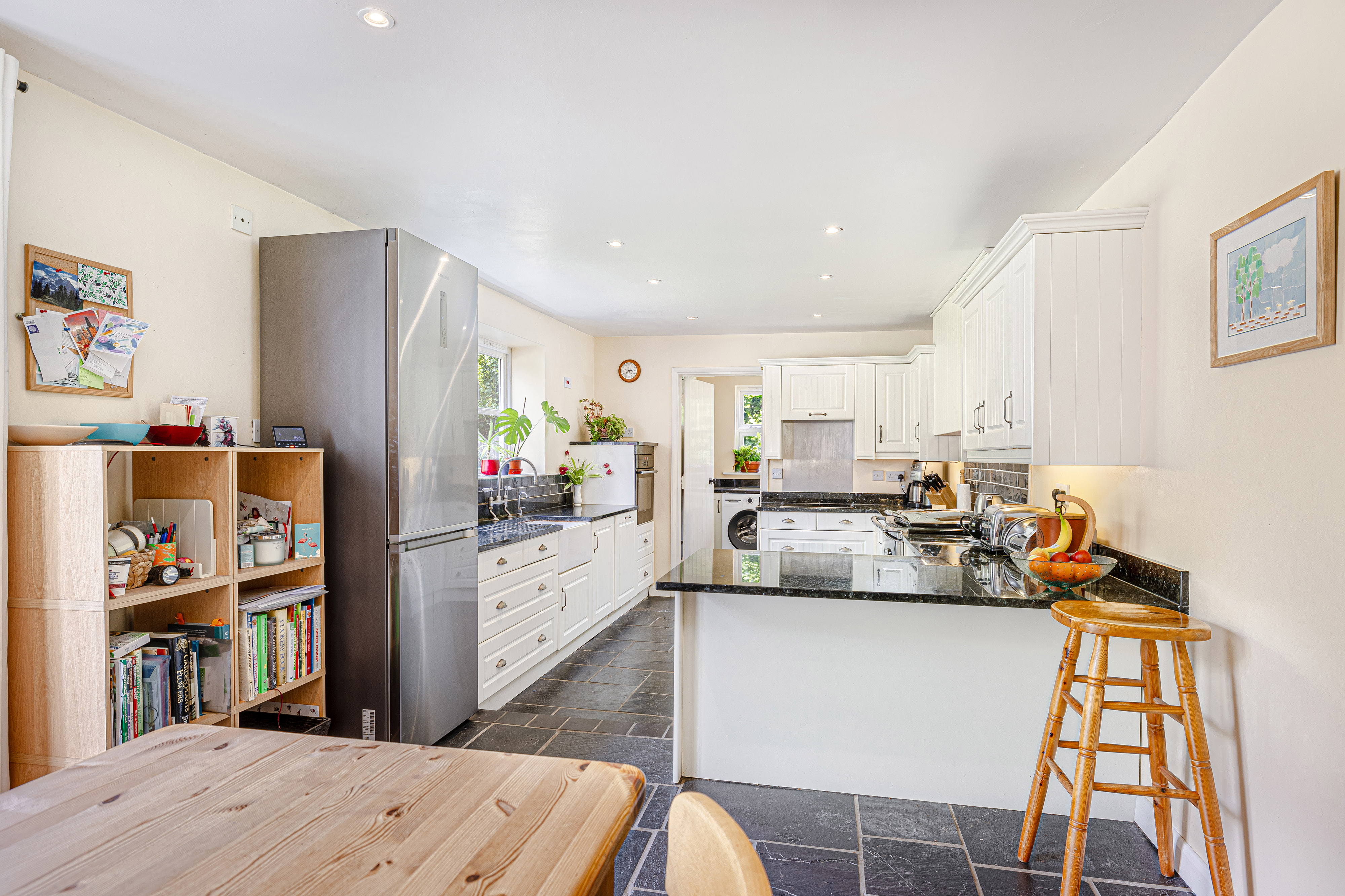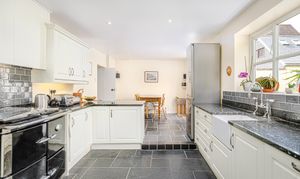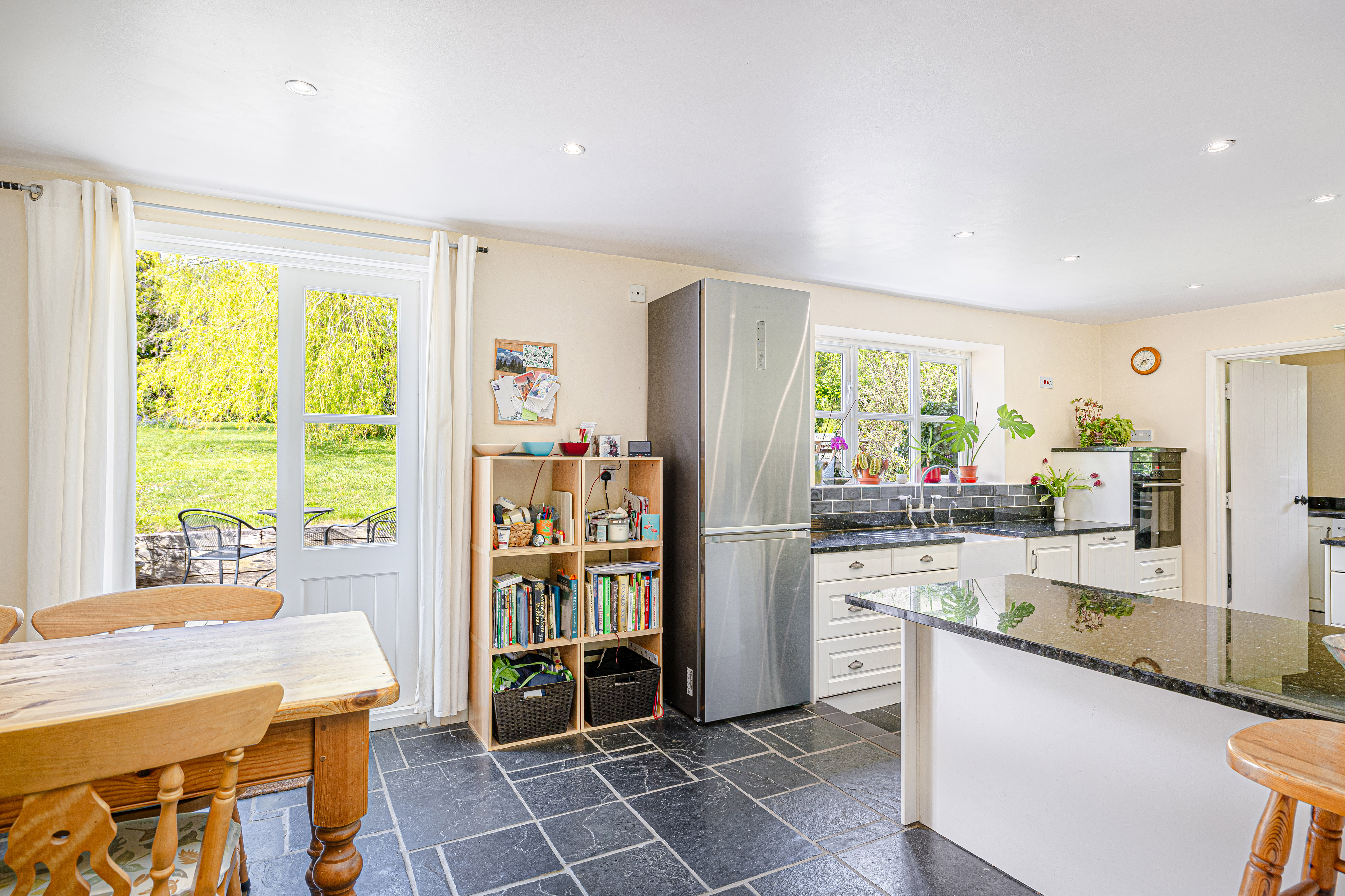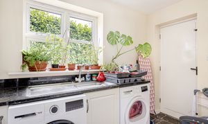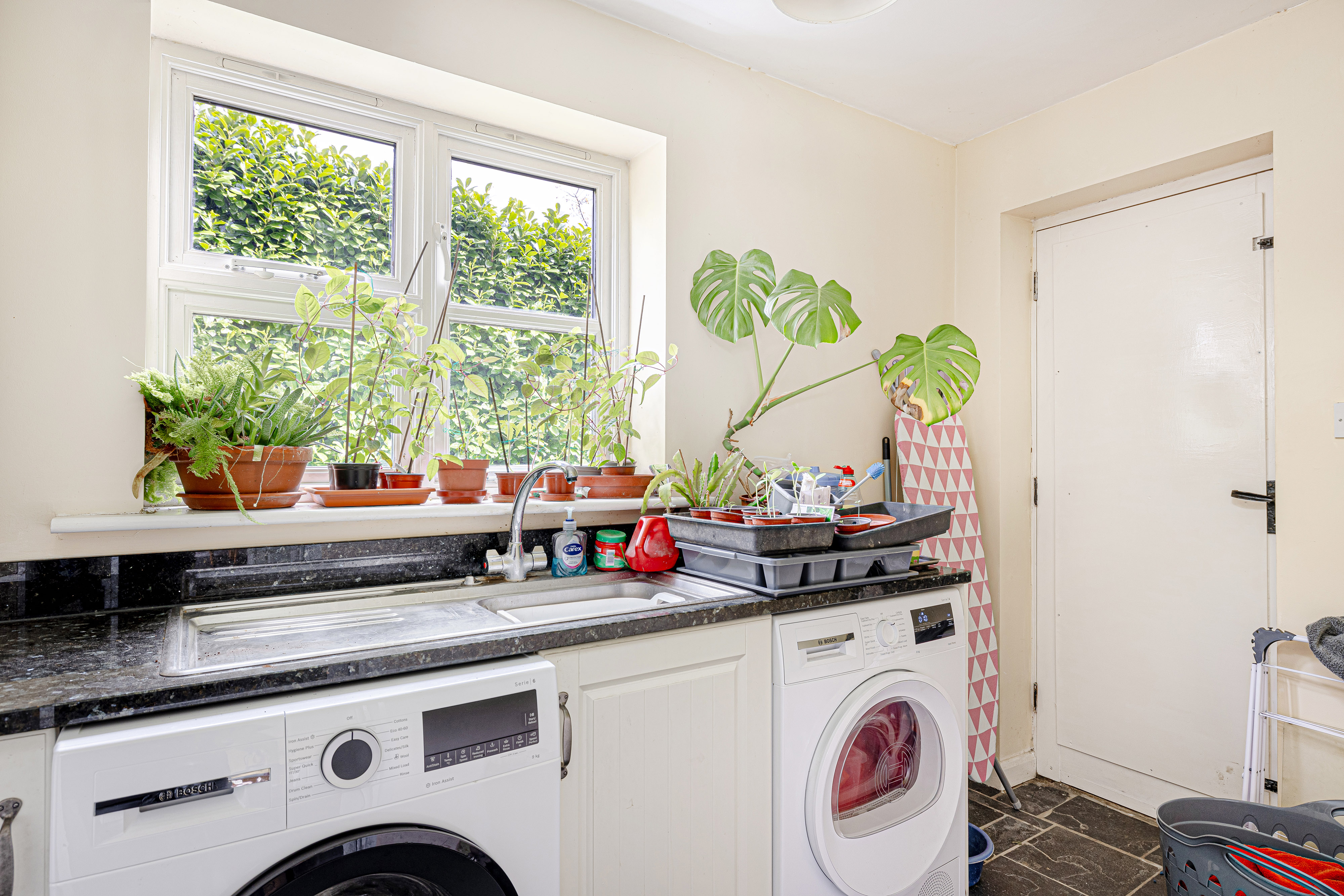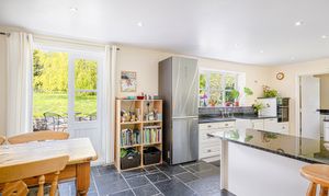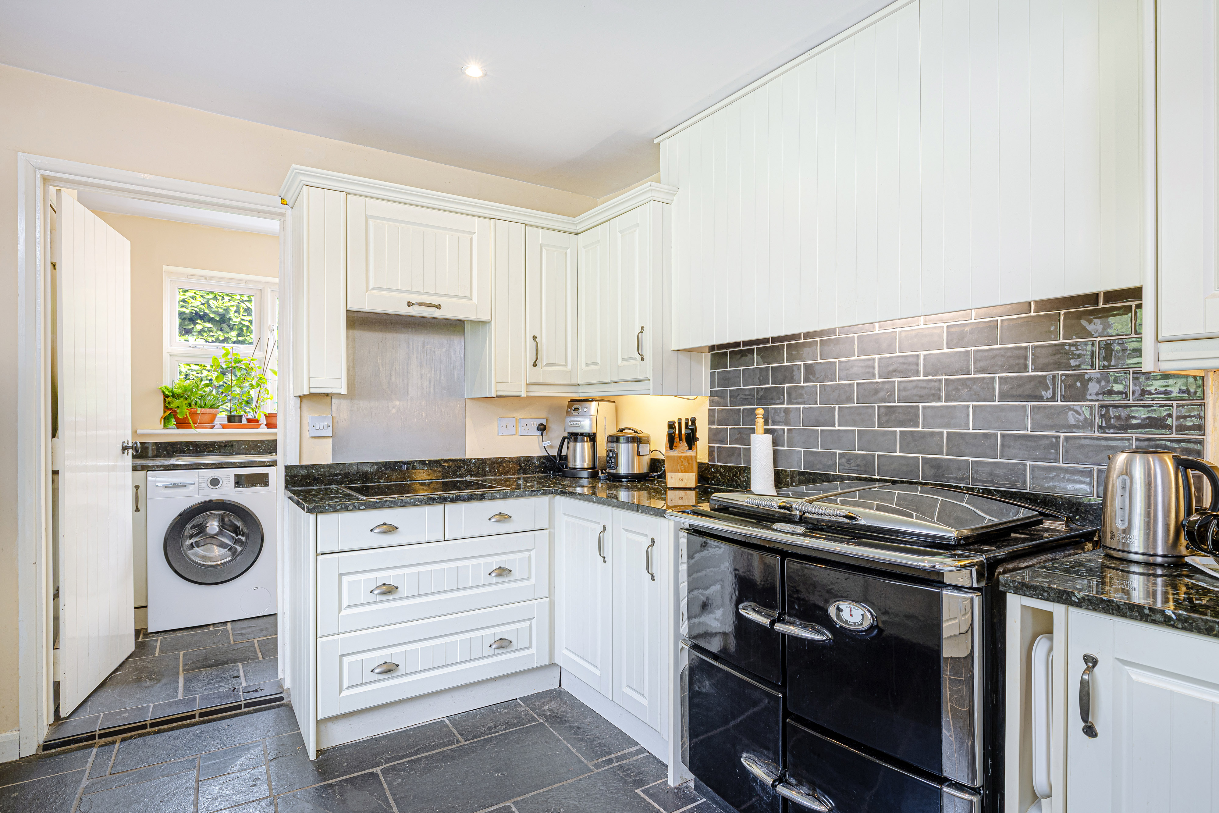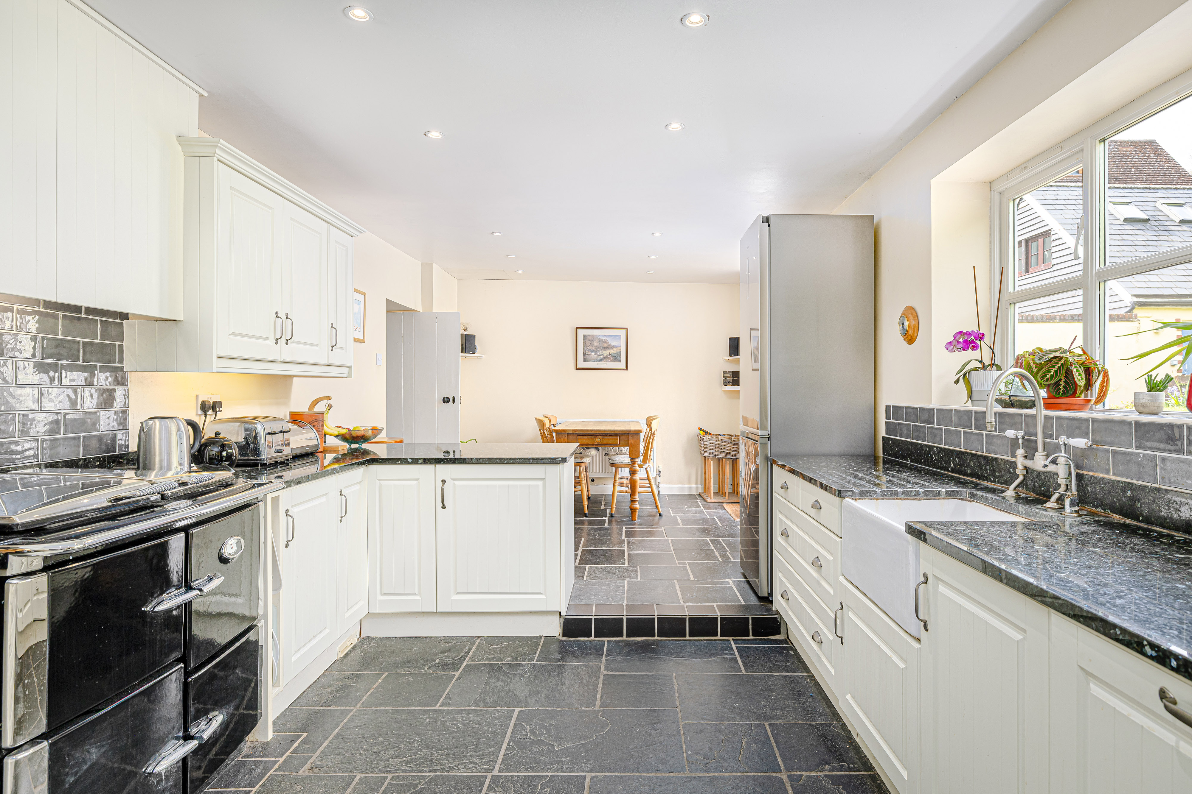 The kitchen/breakfast room forms the heart of the home and stretches to almost 23ft in length. Beautifully arranged with shaker-style cabinetry, dark stone worktops, a butler sink and a Rayburn cooker, it offers both charm and functionality. In addition, the kitchen benefits from a built-in induction hob, fan oven and dishwasher, making it very well equipped for modern family living. There is ample room for informal dining, while doors open out to the garden, allowing the space to connect wonderfully with the outside. A separate utility room sits beyond, helping to keep day-to-day family life neatly organised, and a useful basement provides further storage or ancillary space.