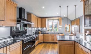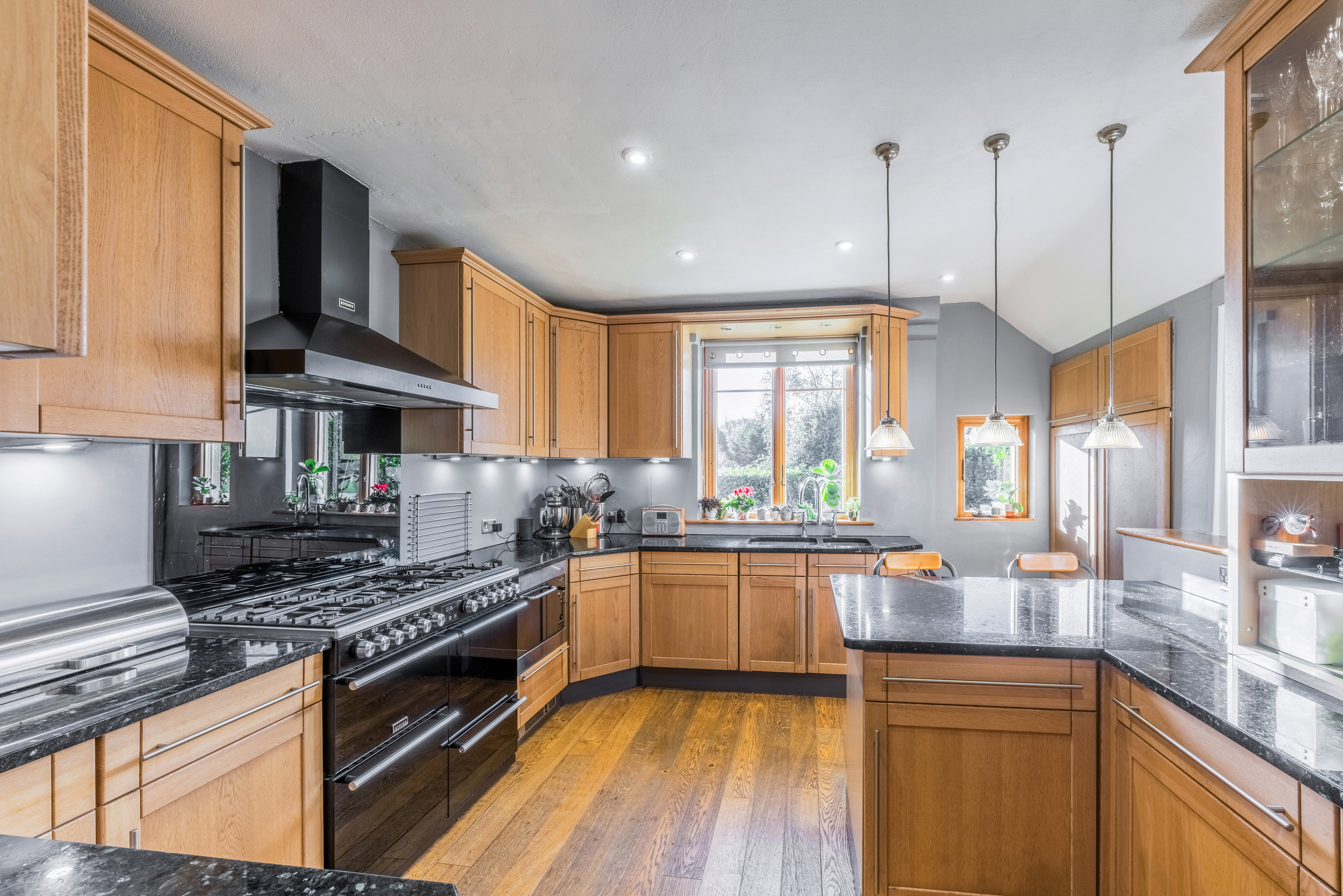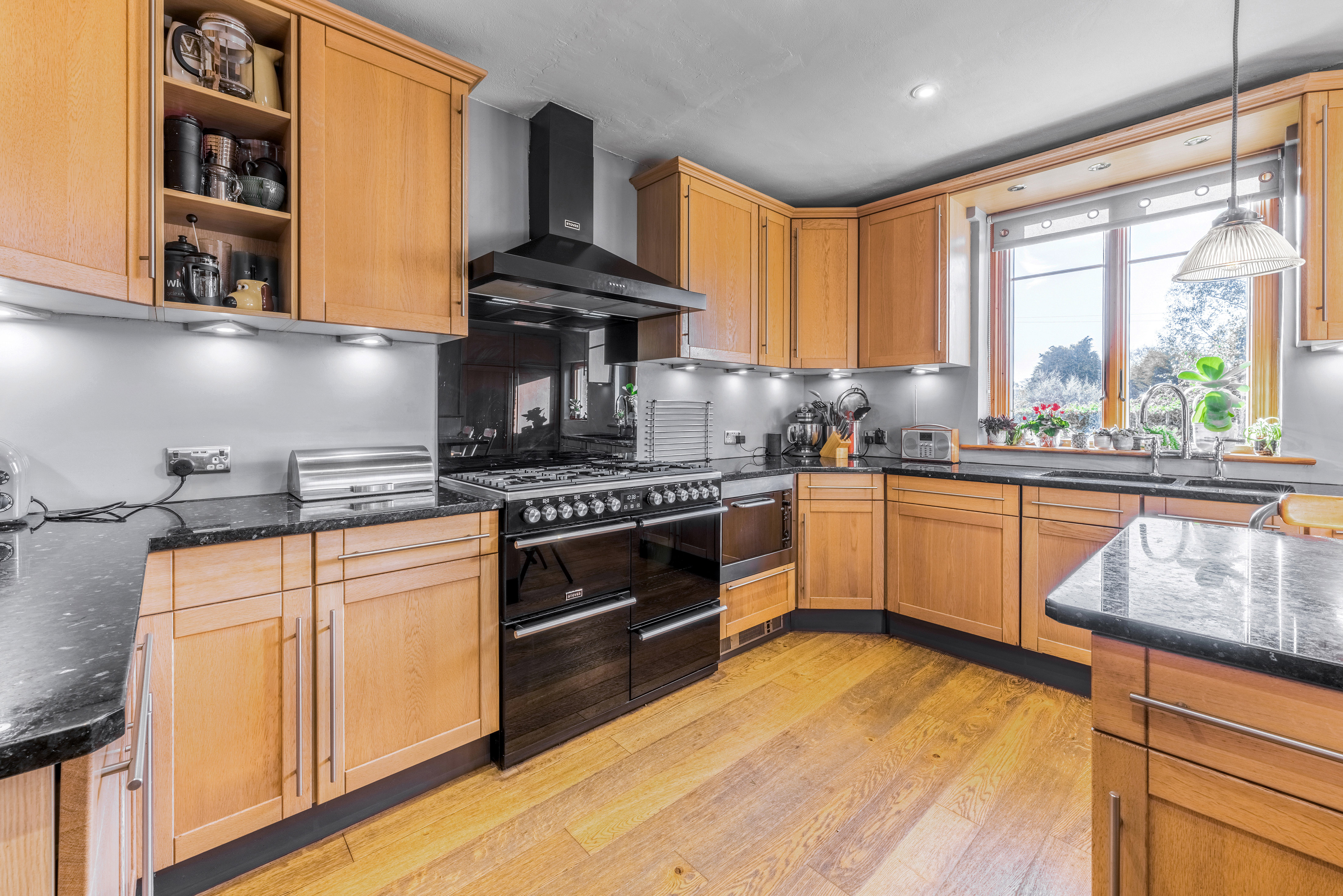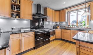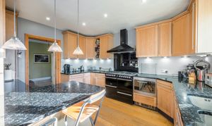 At the heart of the home lies a well-appointed kitchen, fitted with an elegant range of oak cabinetry, integrated appliances, range style gas cooker, granite worktops and a substantial central island with seating—perfect for modern family living and entertaining. This space flows seamlessly into a charming snug or garden room with direct access to the terrace, offering a peaceful retreat with garden views. A separate utility room provides additional practicality with ample storage and laundry facilities.