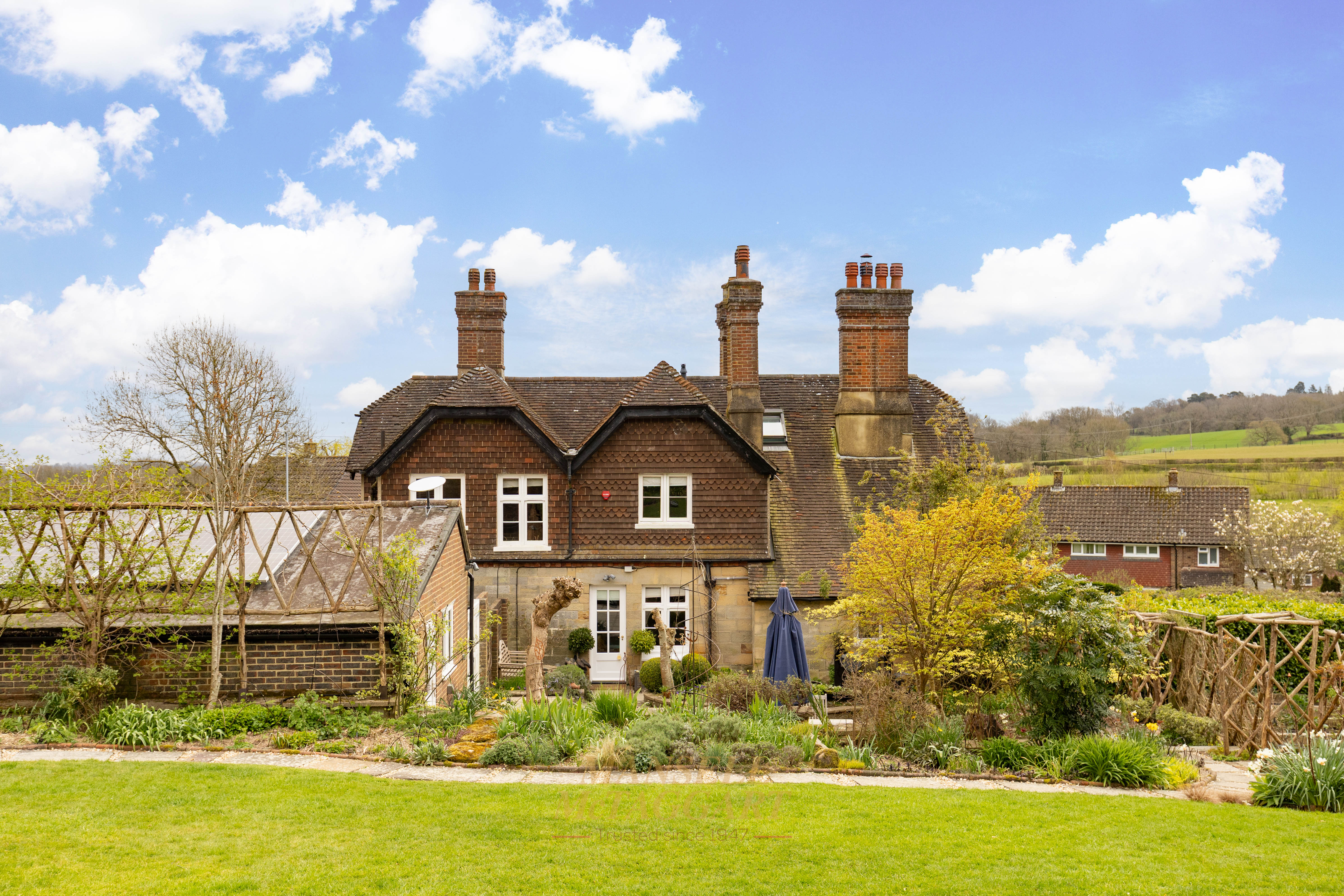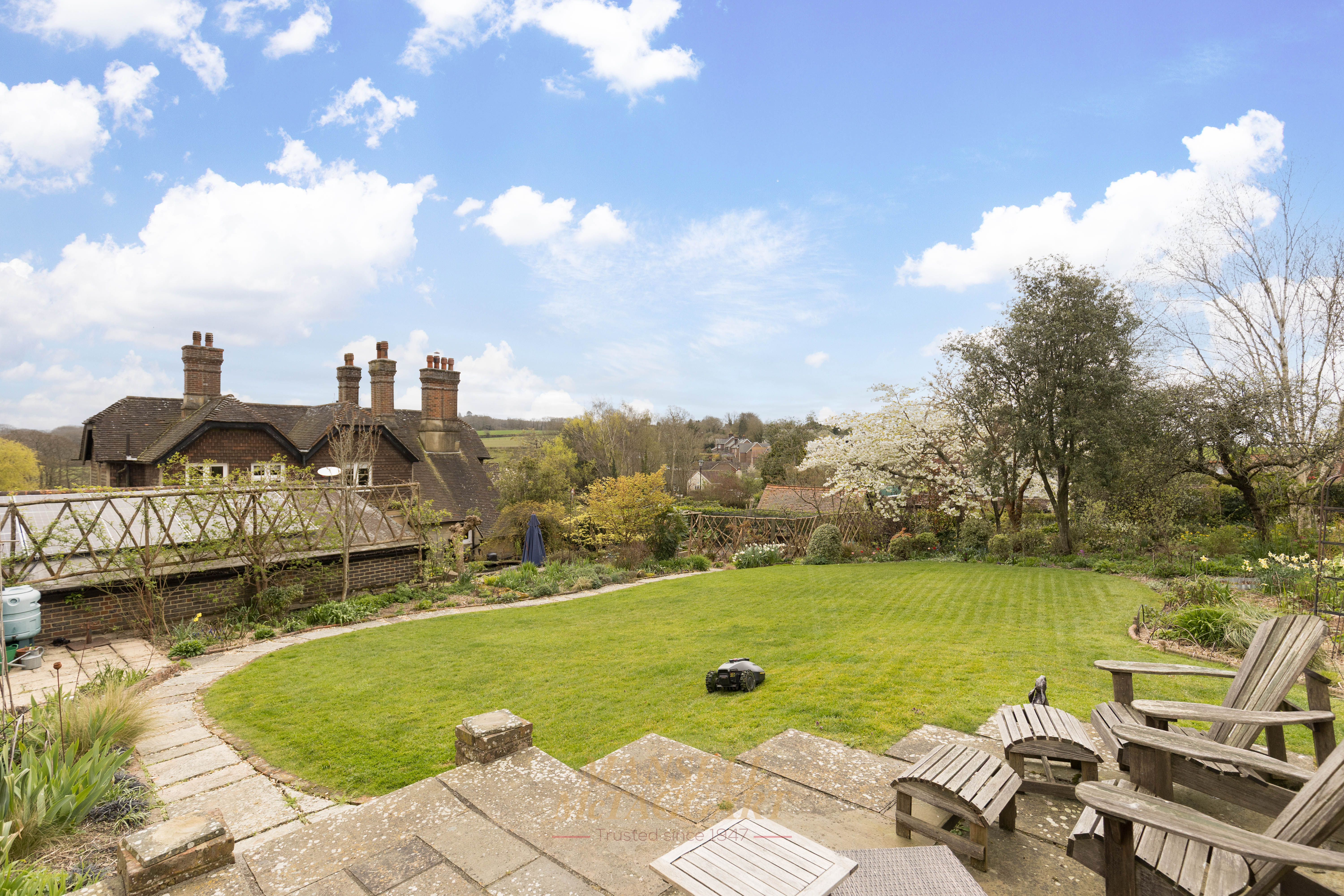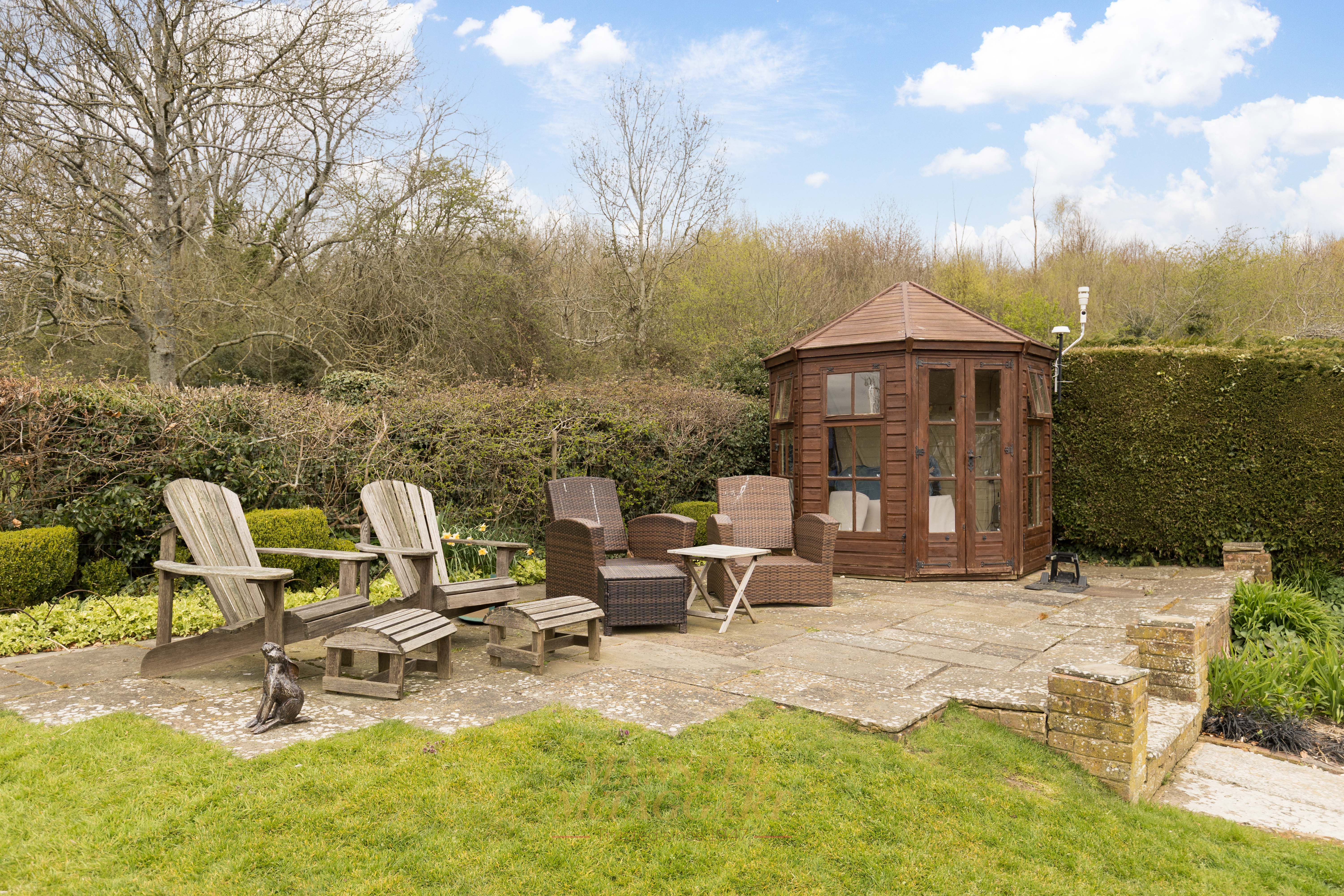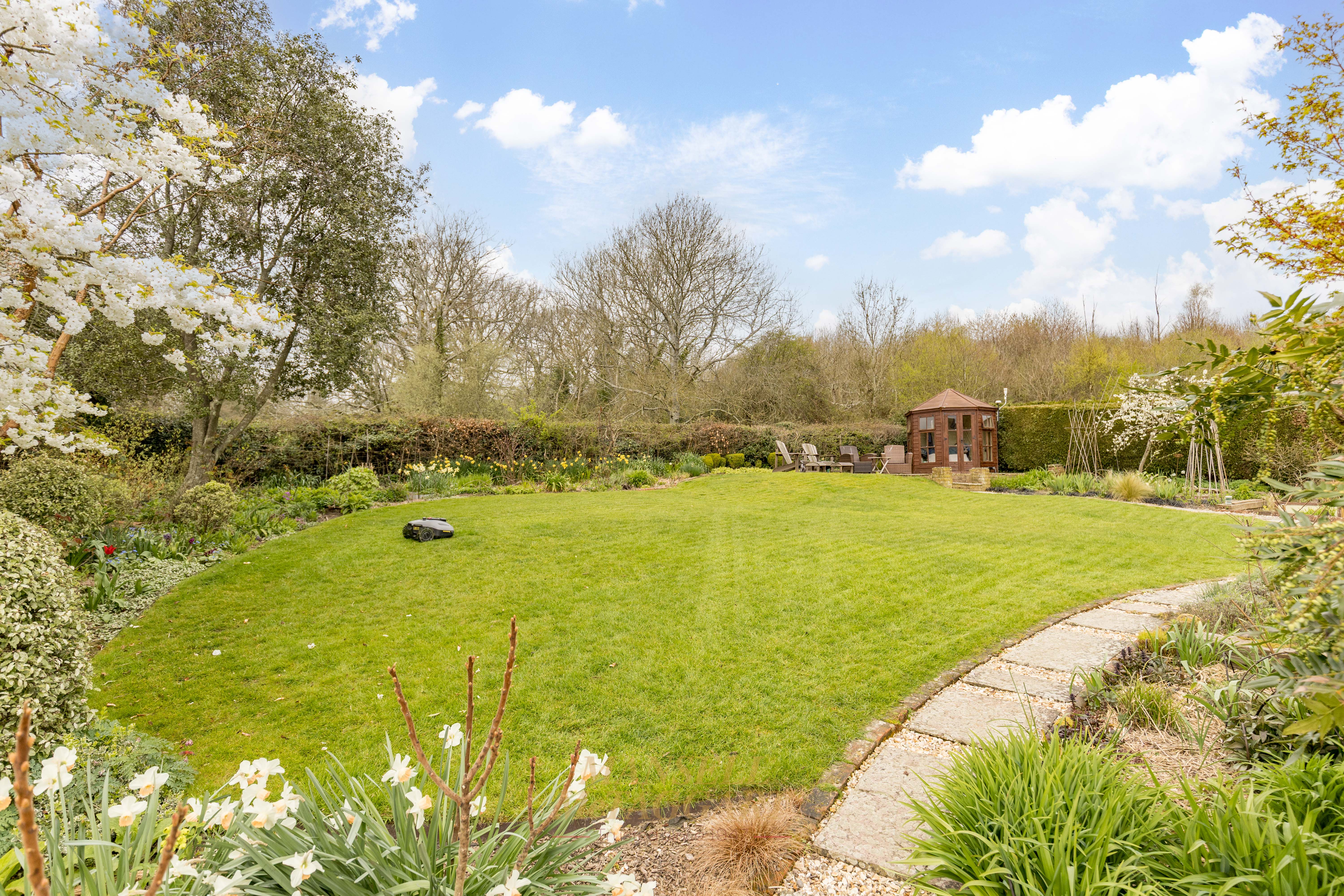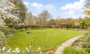 - Stunning southwest-facing rear gardens with established planting, including trees, shrub beds of roses, ornamental flowers and manicured lawns, together with far-reaching views across open countryside
