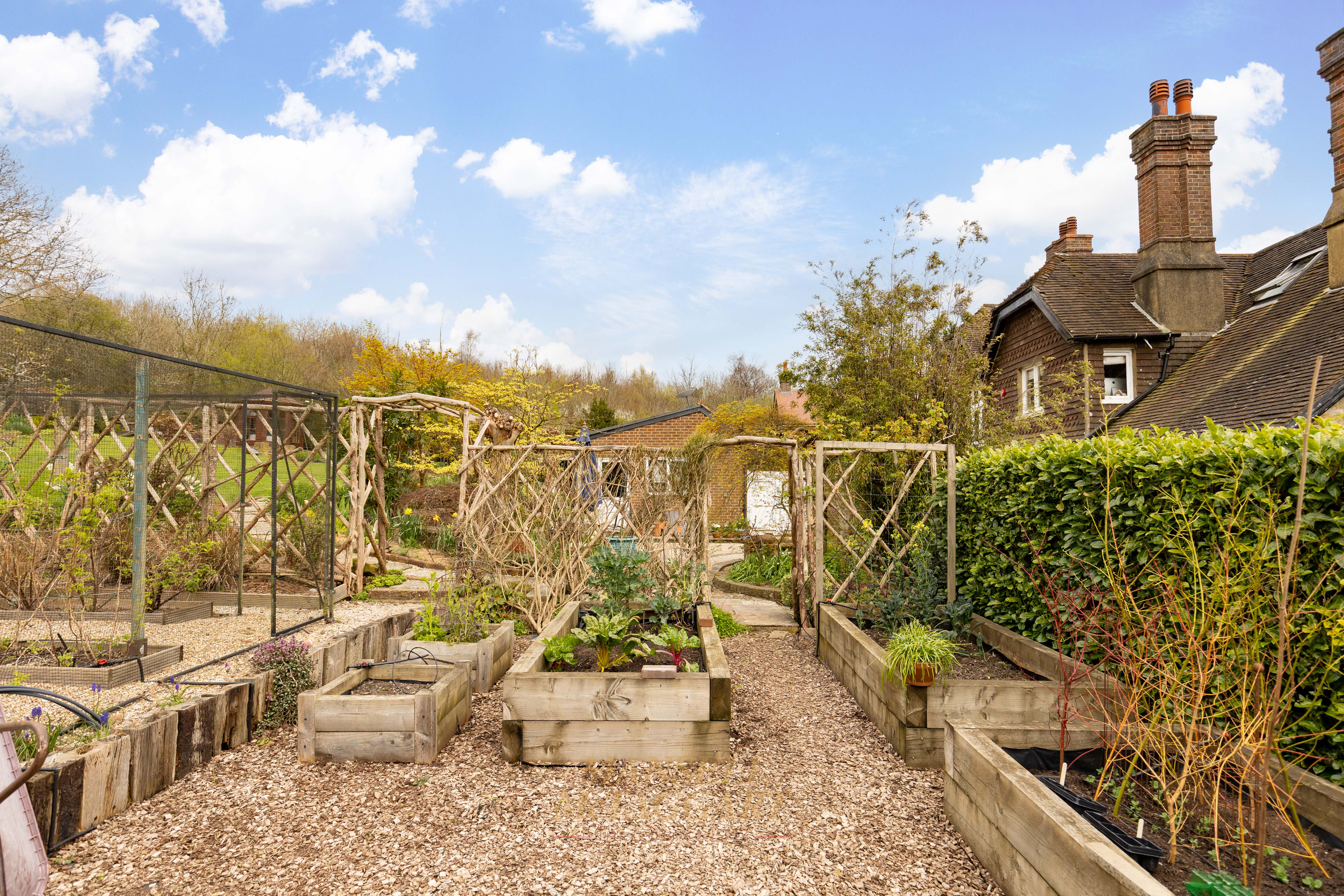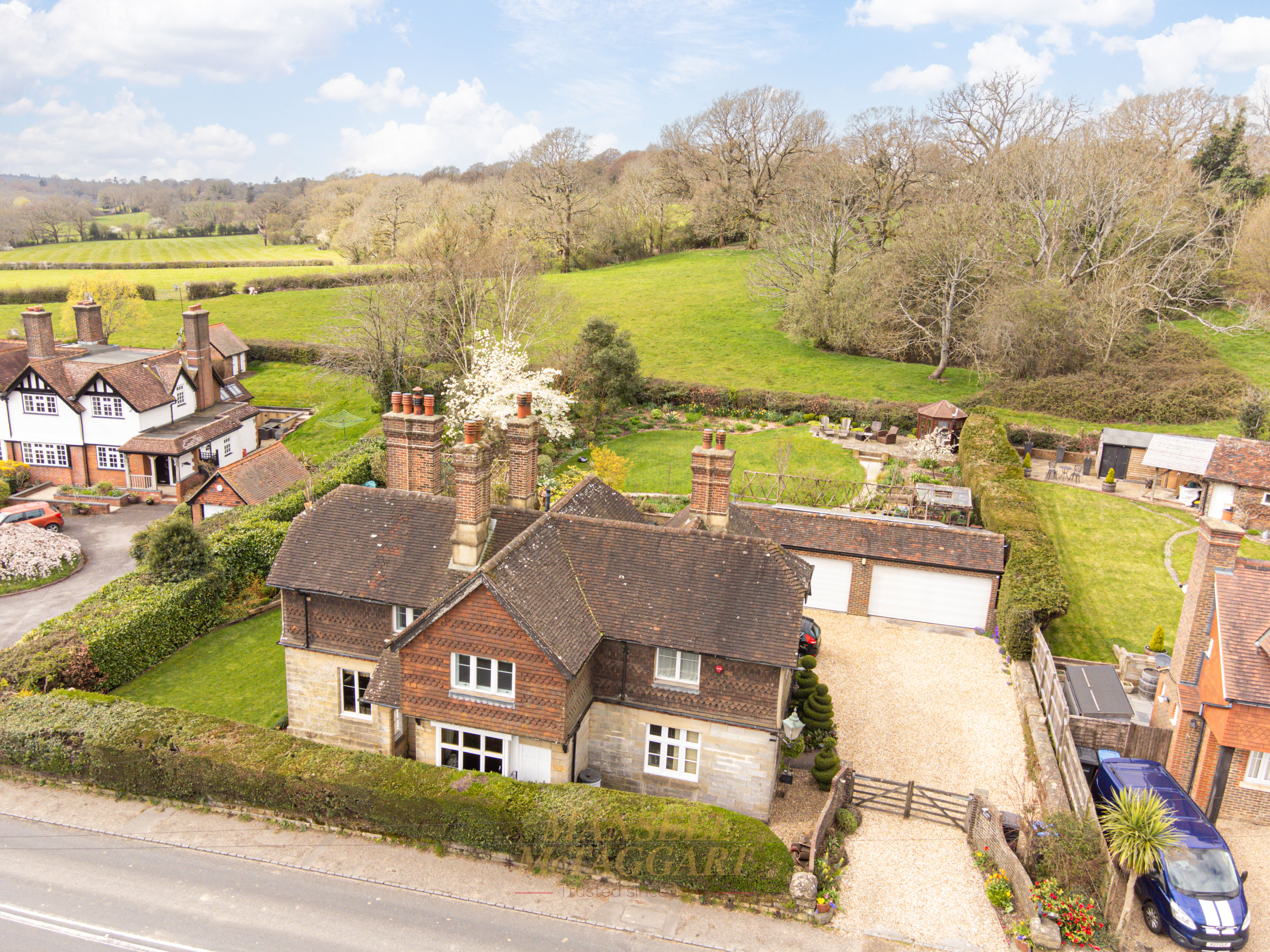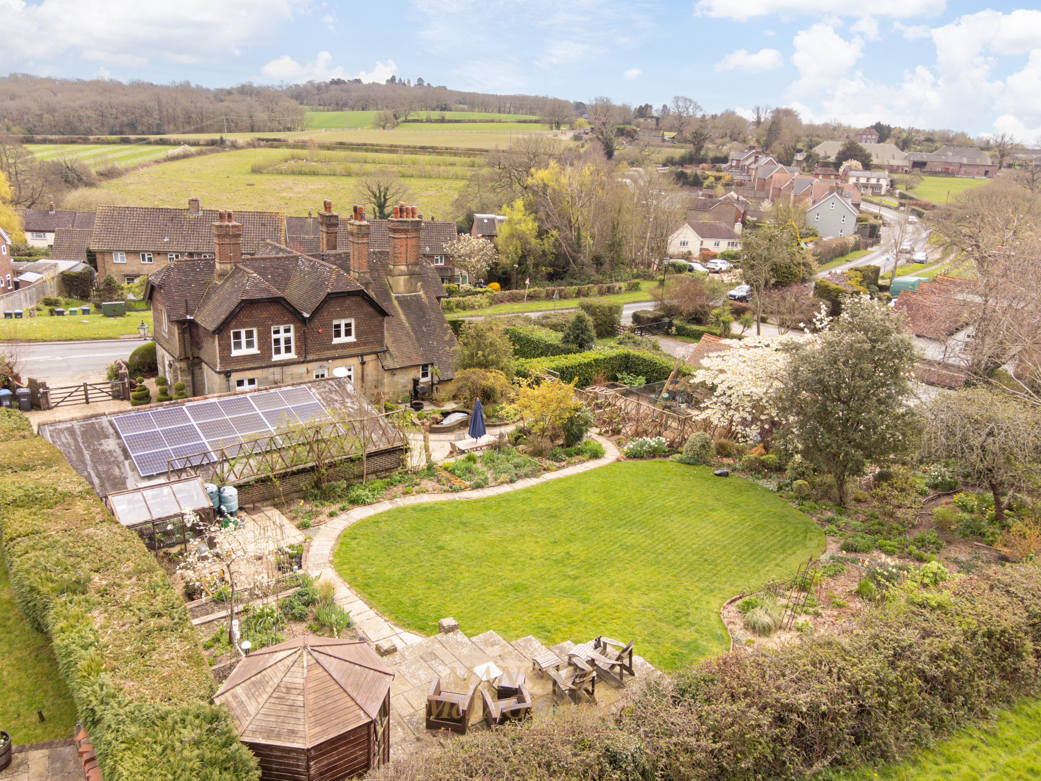- Stunning southwest-facing rear gardens with established planting, including trees, shrub beds of roses, ornamental flowers and manicured lawns, together with far-reaching views across open countryside