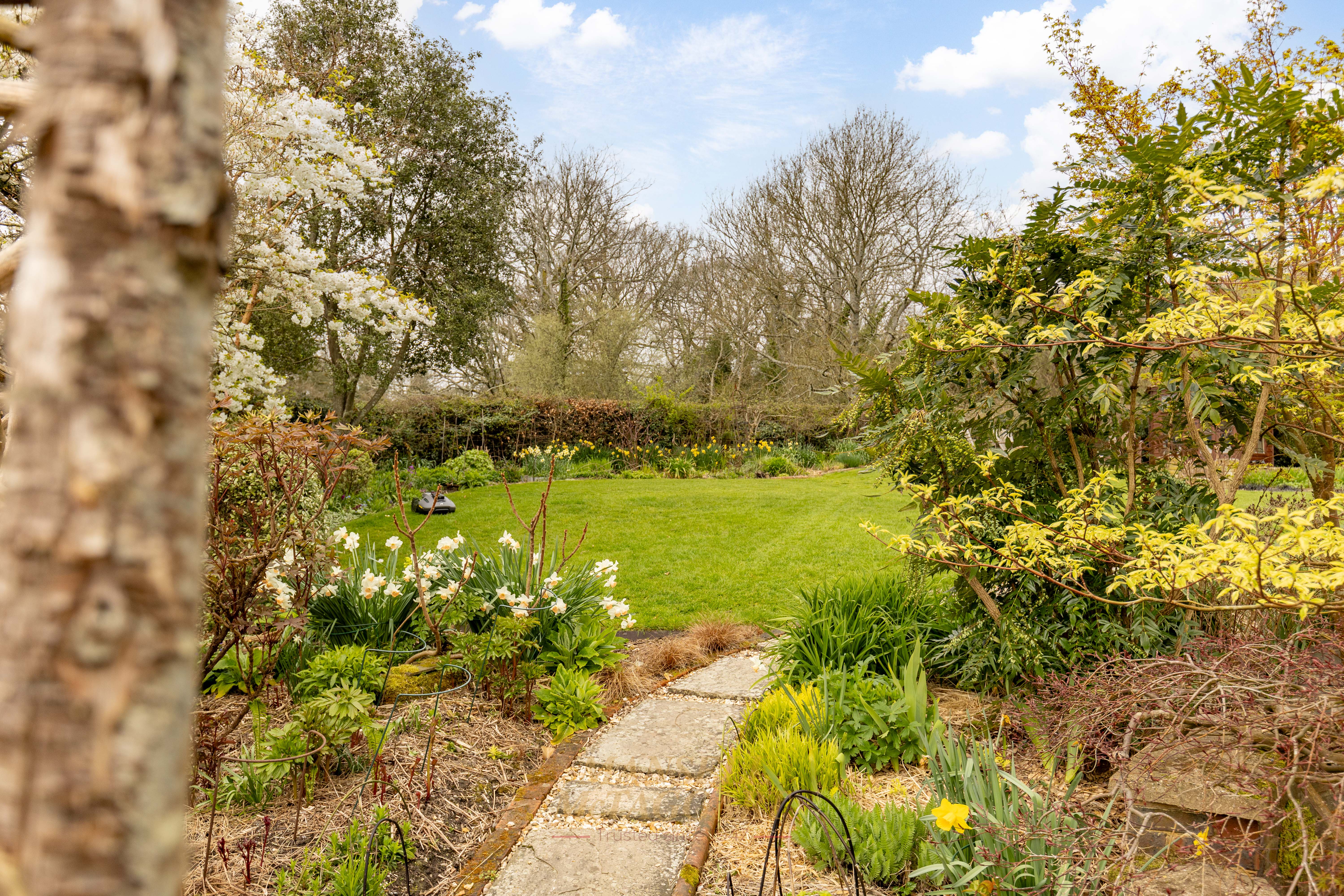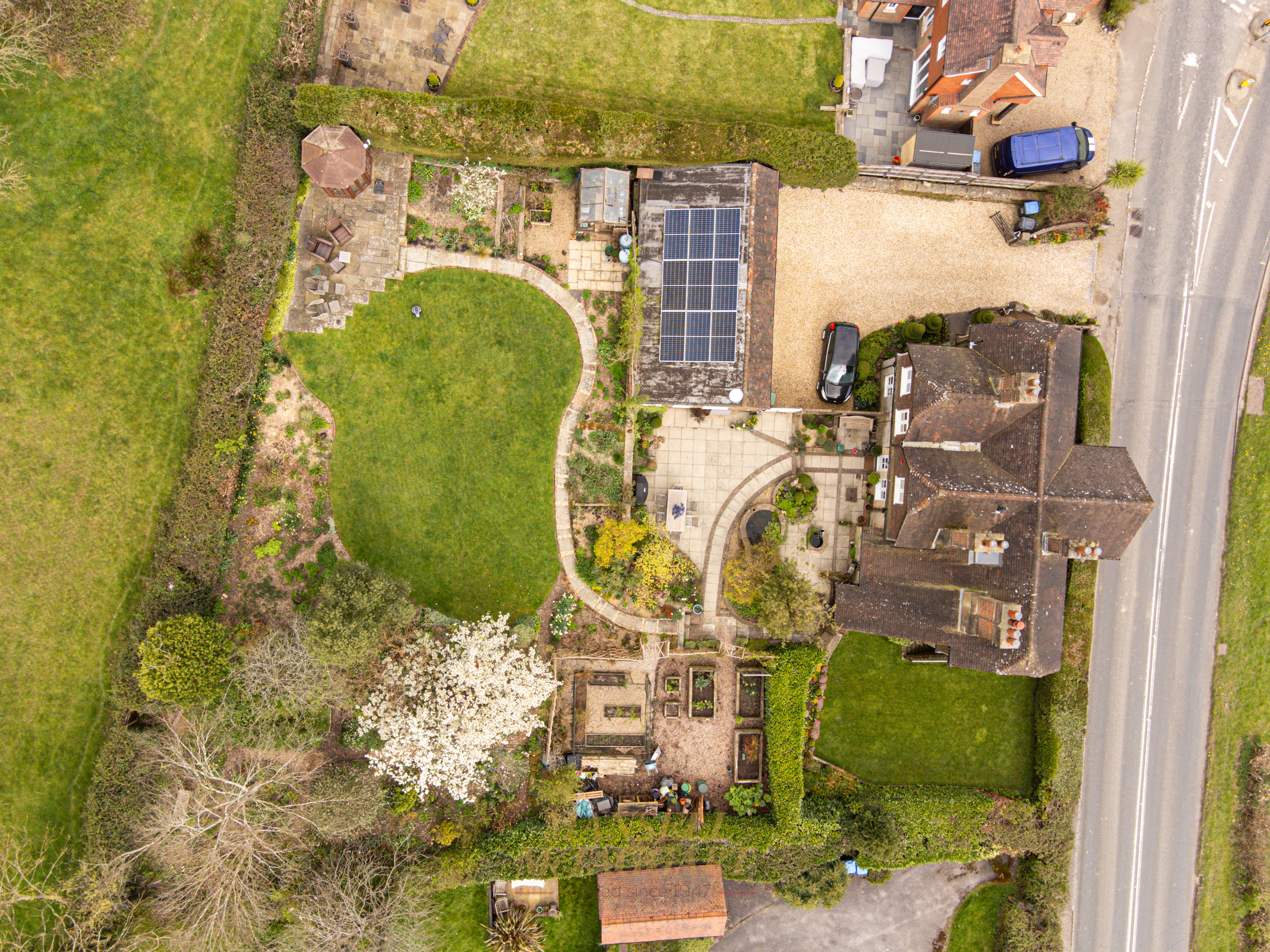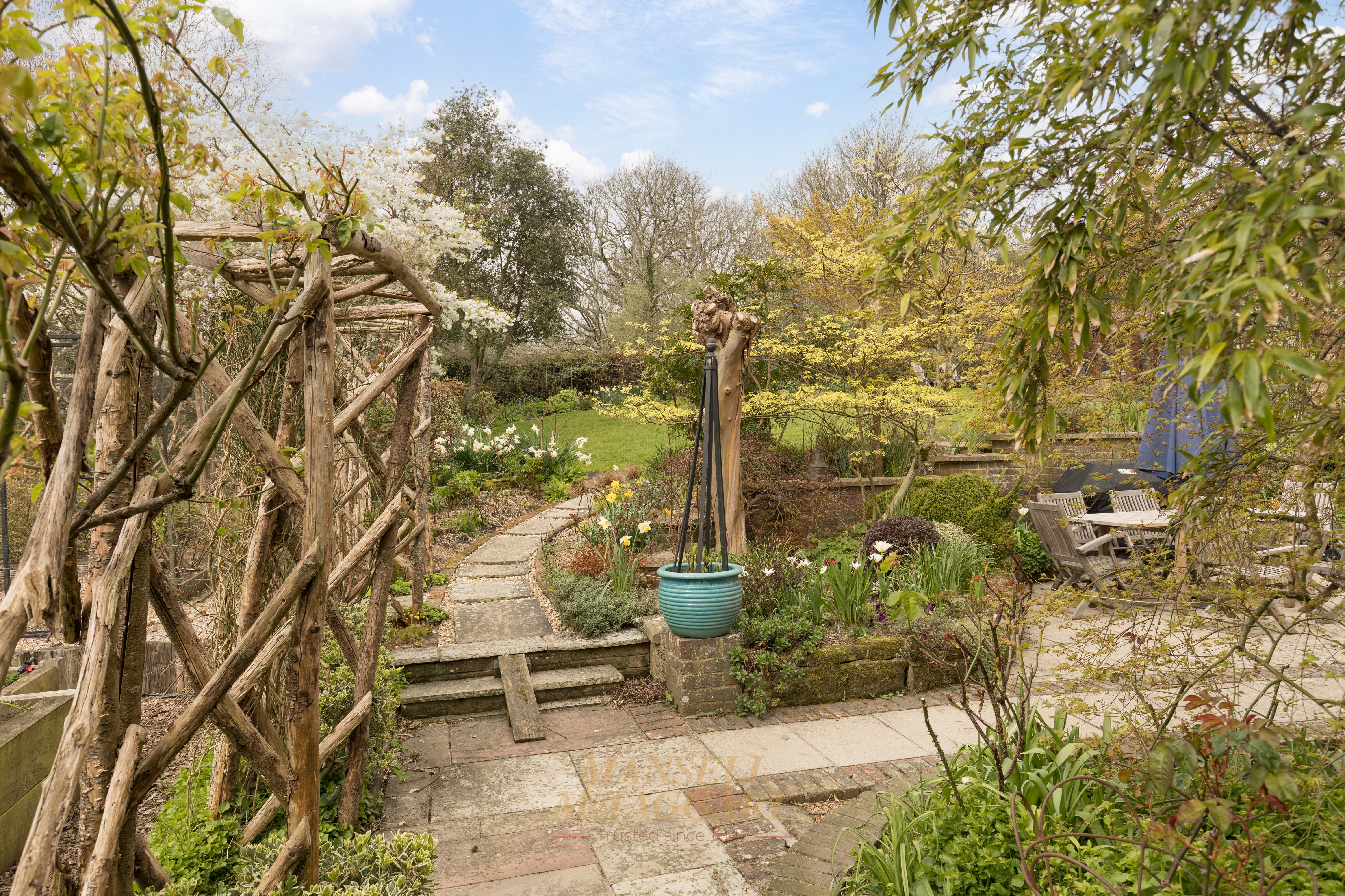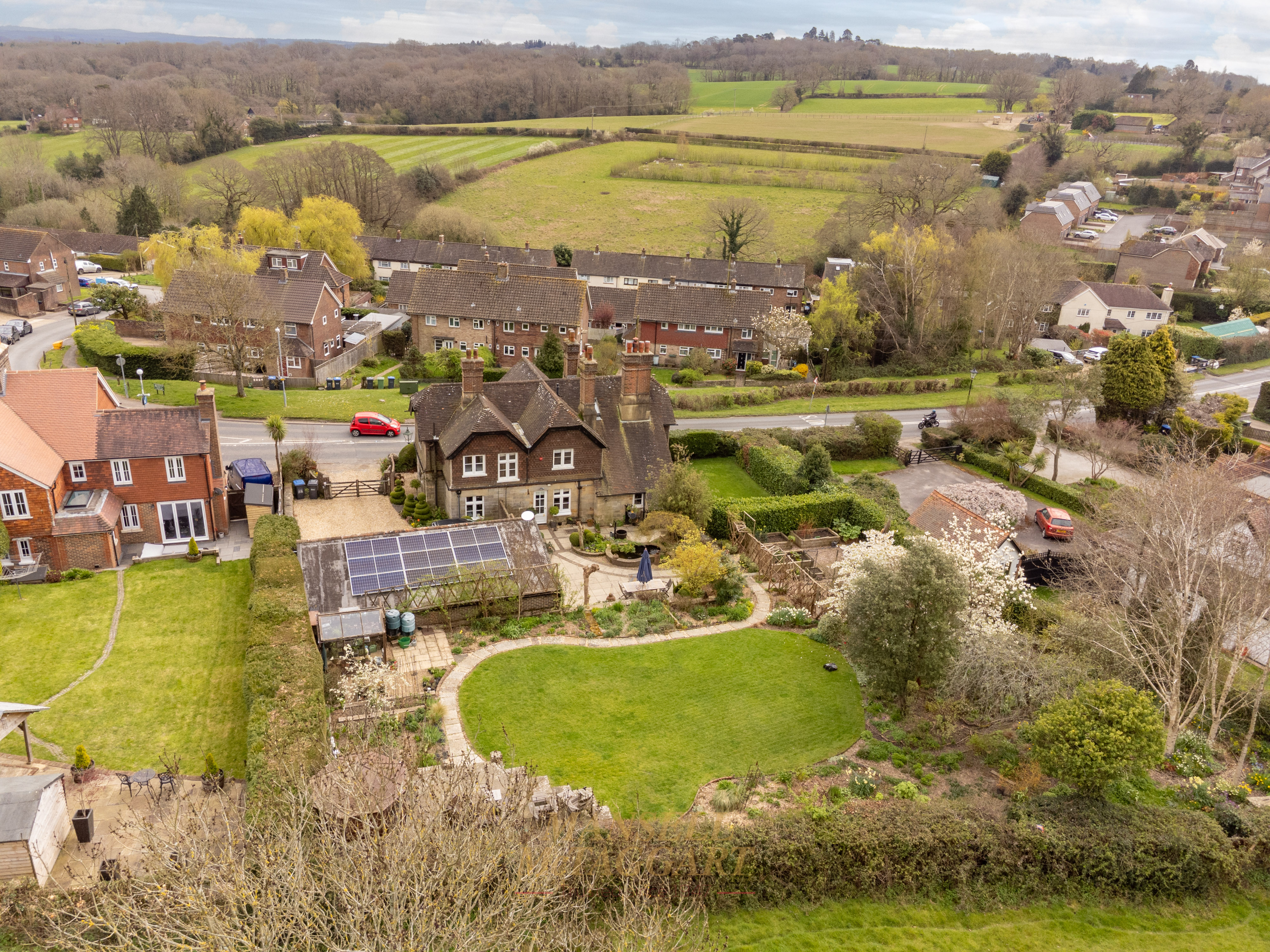 - Stunning southwest-facing rear gardens with established planting, including trees, shrub beds of roses, ornamental flowers and manicured lawns, together with far-reaching views across open countryside