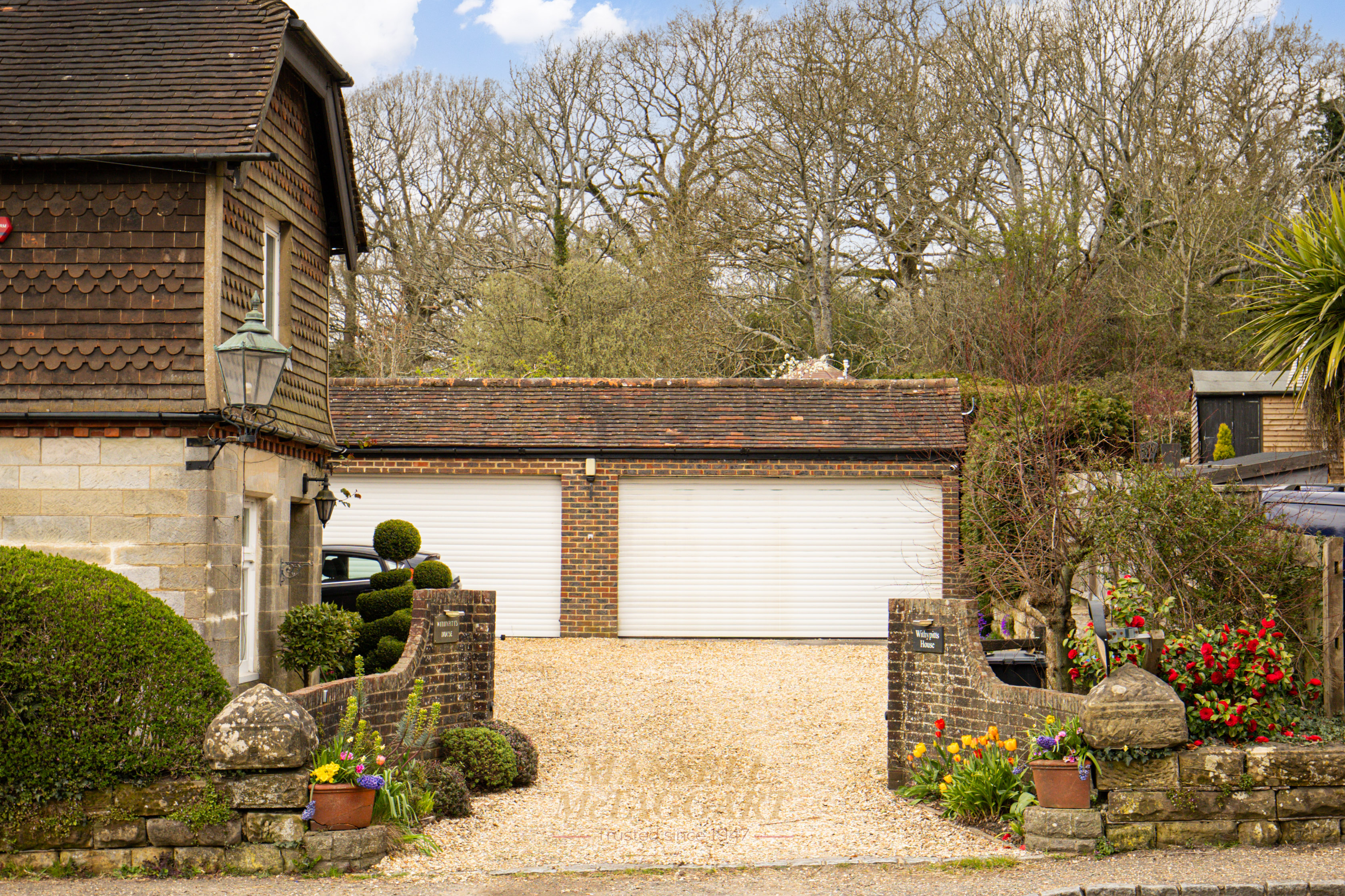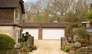 - Electric five-bar double gates leading to a gravel driveway for numerous cars. Garages for up to 4 cars with electric roller doors