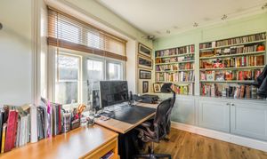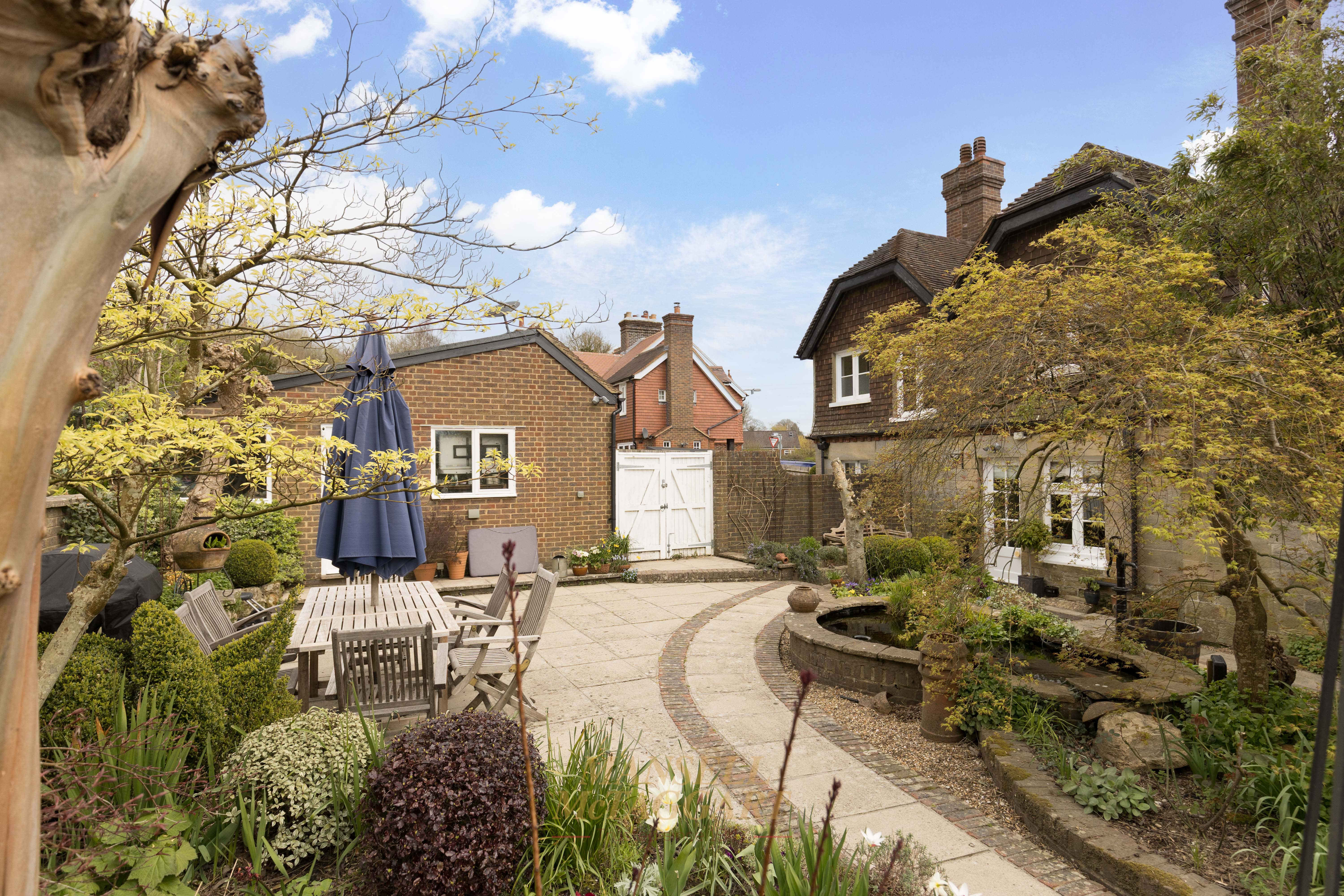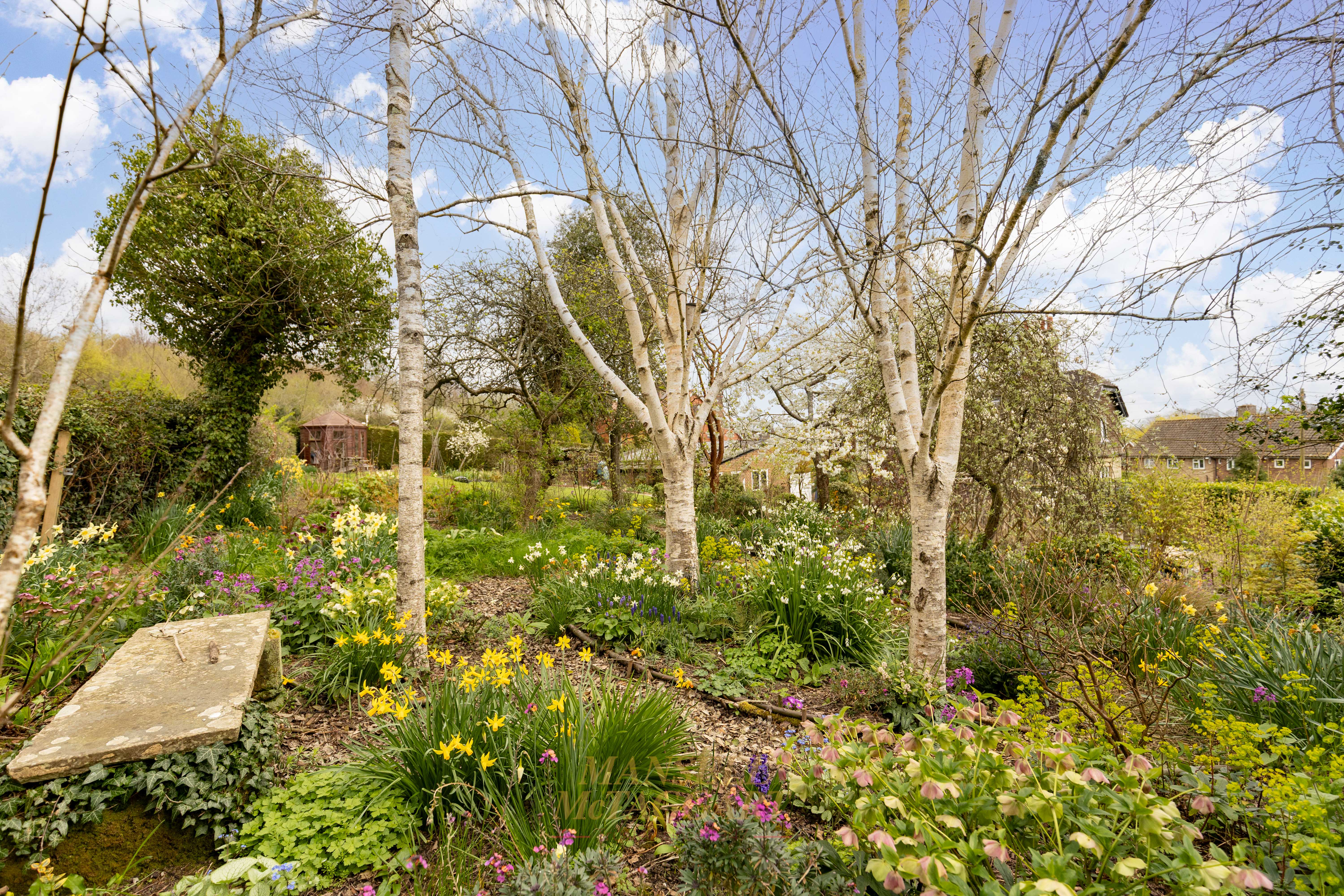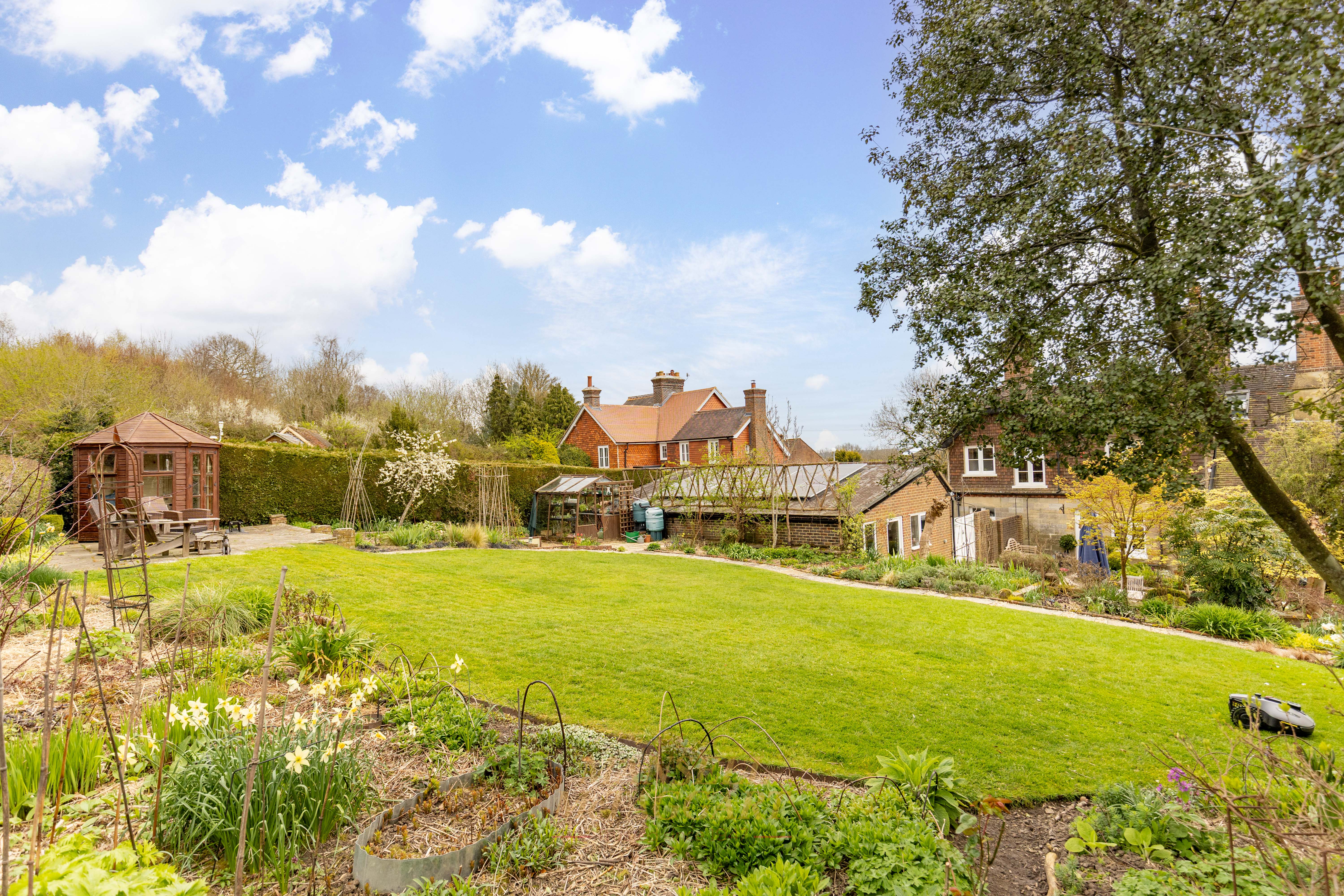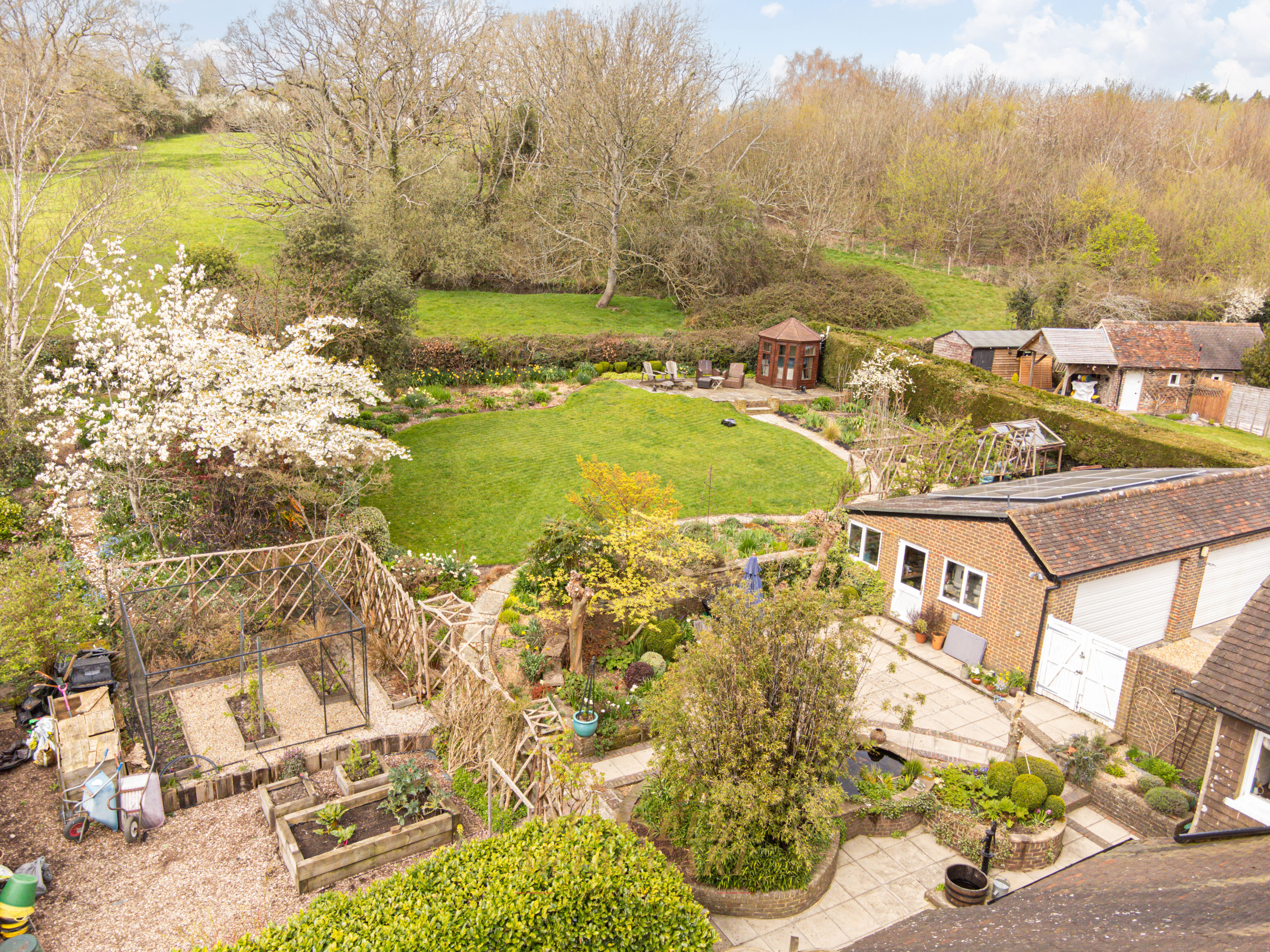 The rear garden is a true sanctuary. Beautifully landscaped and enjoying a prized south-westerly aspect, it features an array of mature trees, manicured hedging, flowering borders, and specimen planting including roses, wisteria, spring bulbs, and fruit trees. Expansive lawns sweep gently towards a raised bed area, fruit cage and onto the picturesque pond complete with Koi carp, while thoughtfully positioned seating areas provide idyllic spaces for outdoor entertaining and quiet reflection. A cellar, accessed via external steps, adds further versatility to this remarkable home.