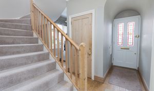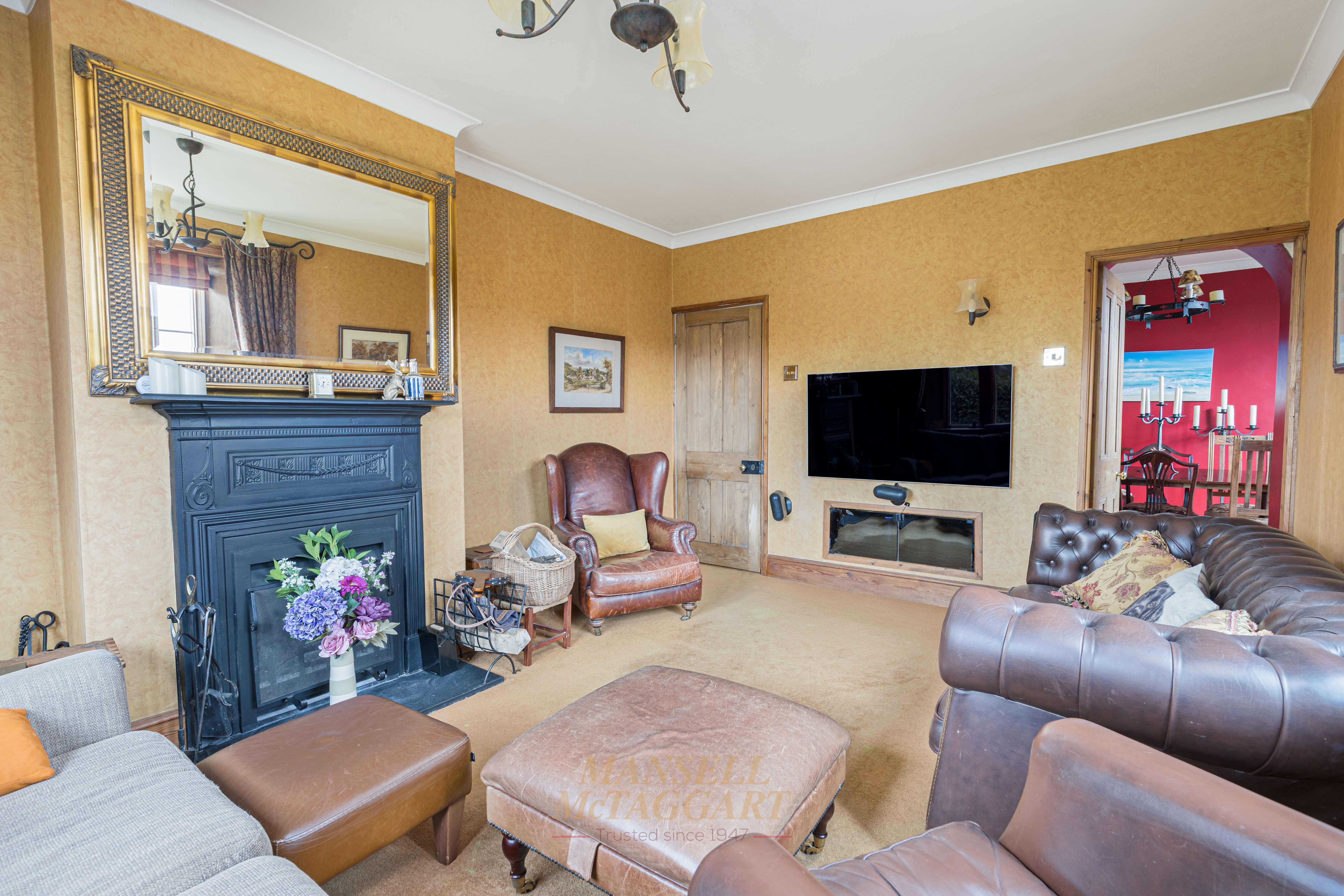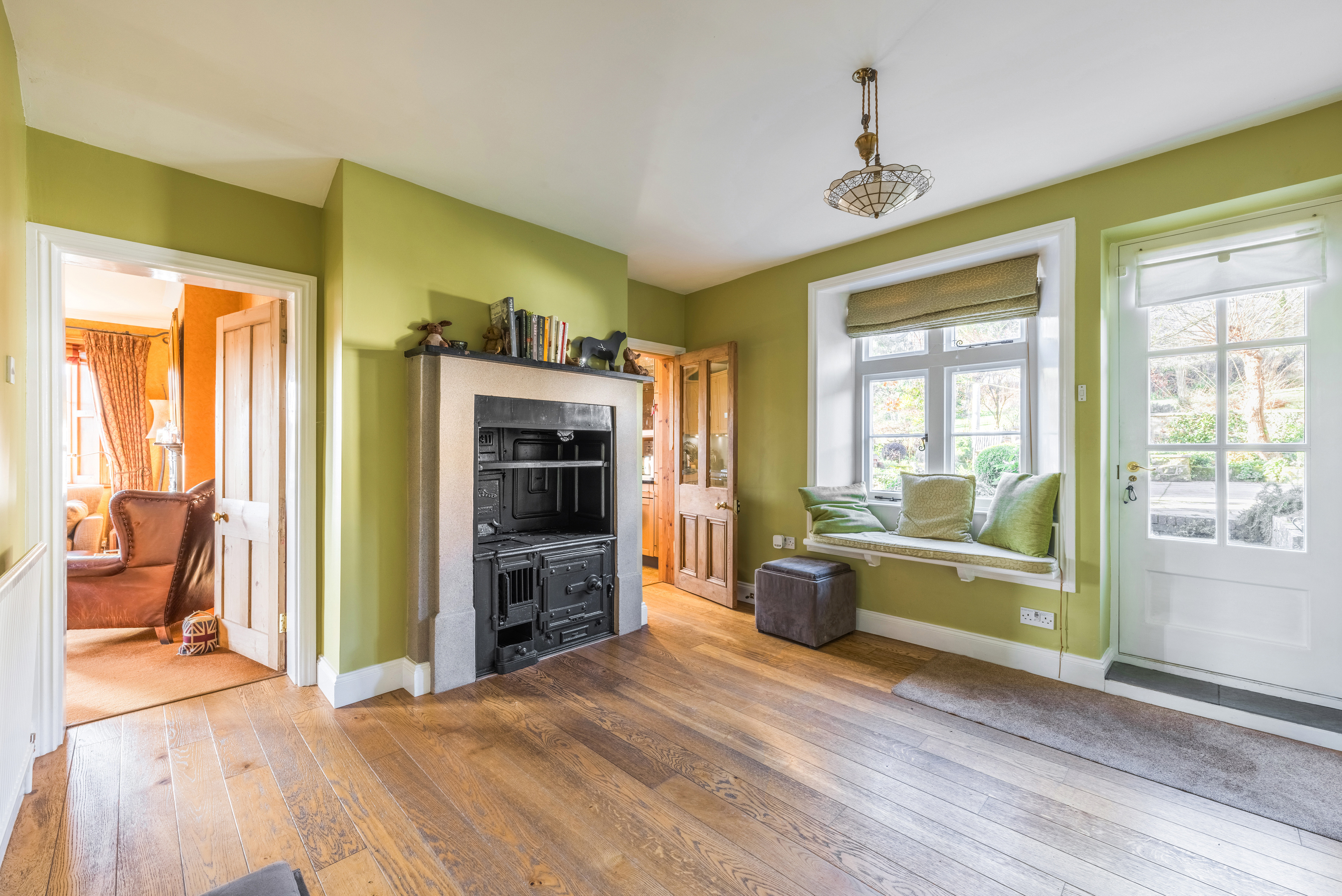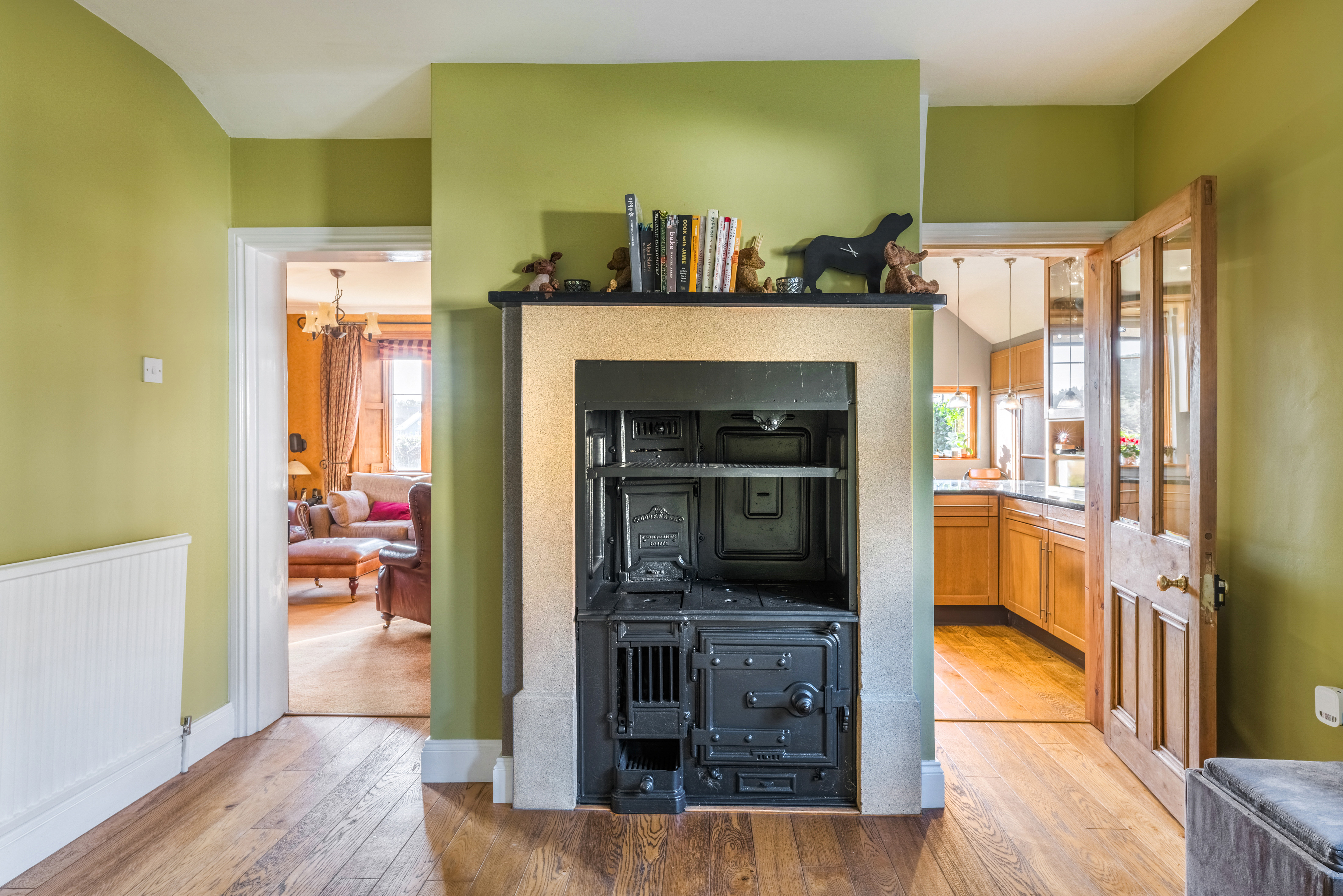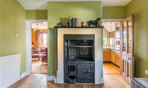 The approach is both elegant and secure, with a stone boundary wall and sweeping gravel driveway leading to electric five-bar gates and extensive parking. A striking entrance porch with sandstone detailing opens through a solid oak door into a welcoming reception hall and on to the family room / snug where an original cast-iron range creates an immediate sense of character and refinement.