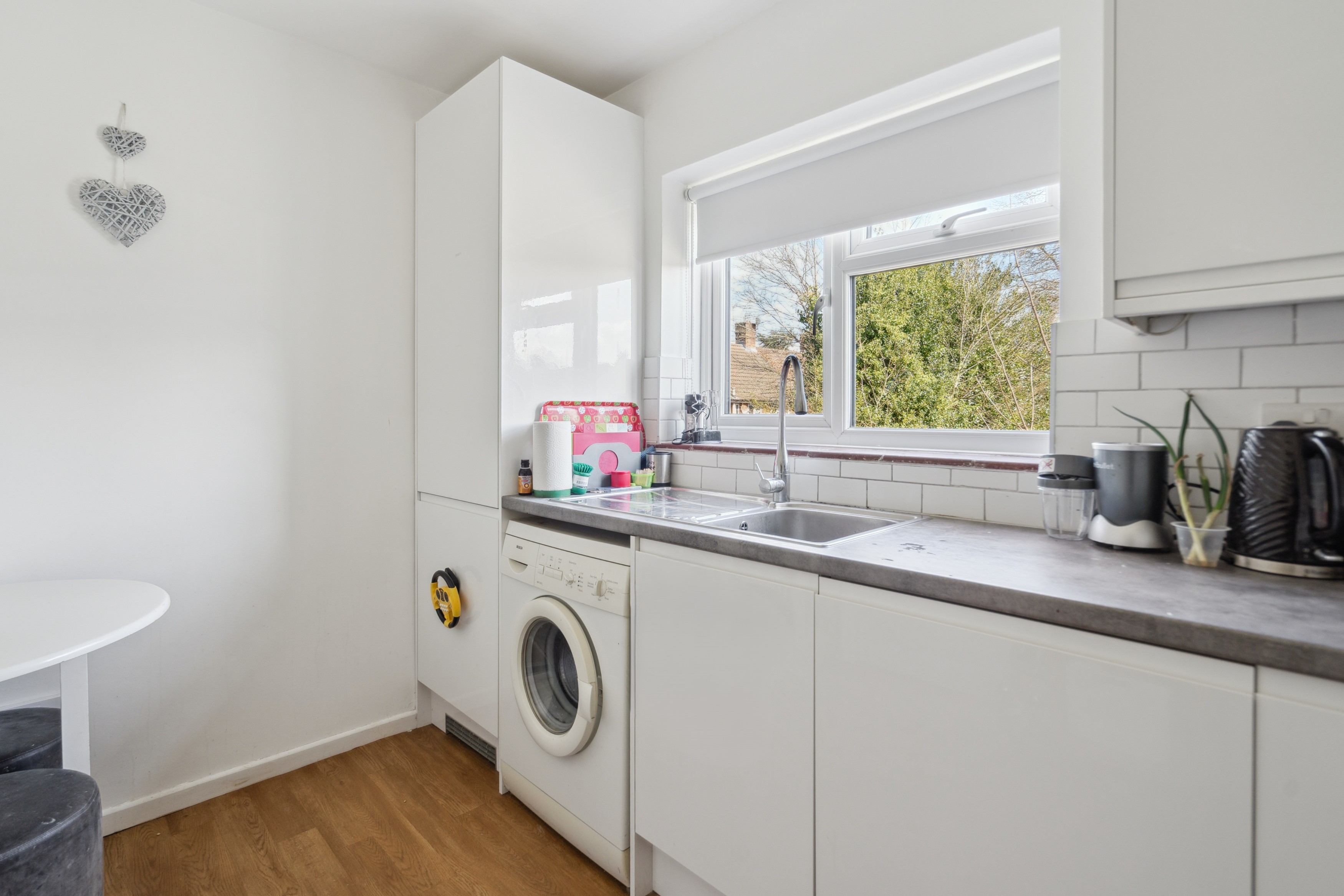 The refitted kitchen is designed with sleek white gloss units, ample storage above and below eye level, and a pantry for additional convenience. It is well-equipped with an integrated oven, induction hob with an extractor fan, an integrated dishwasher, and space for a washing machine. A built-in fridge freezer ensures a streamlined look, while there is also room for a table, making this an ideal space for both cooking and entertaining.