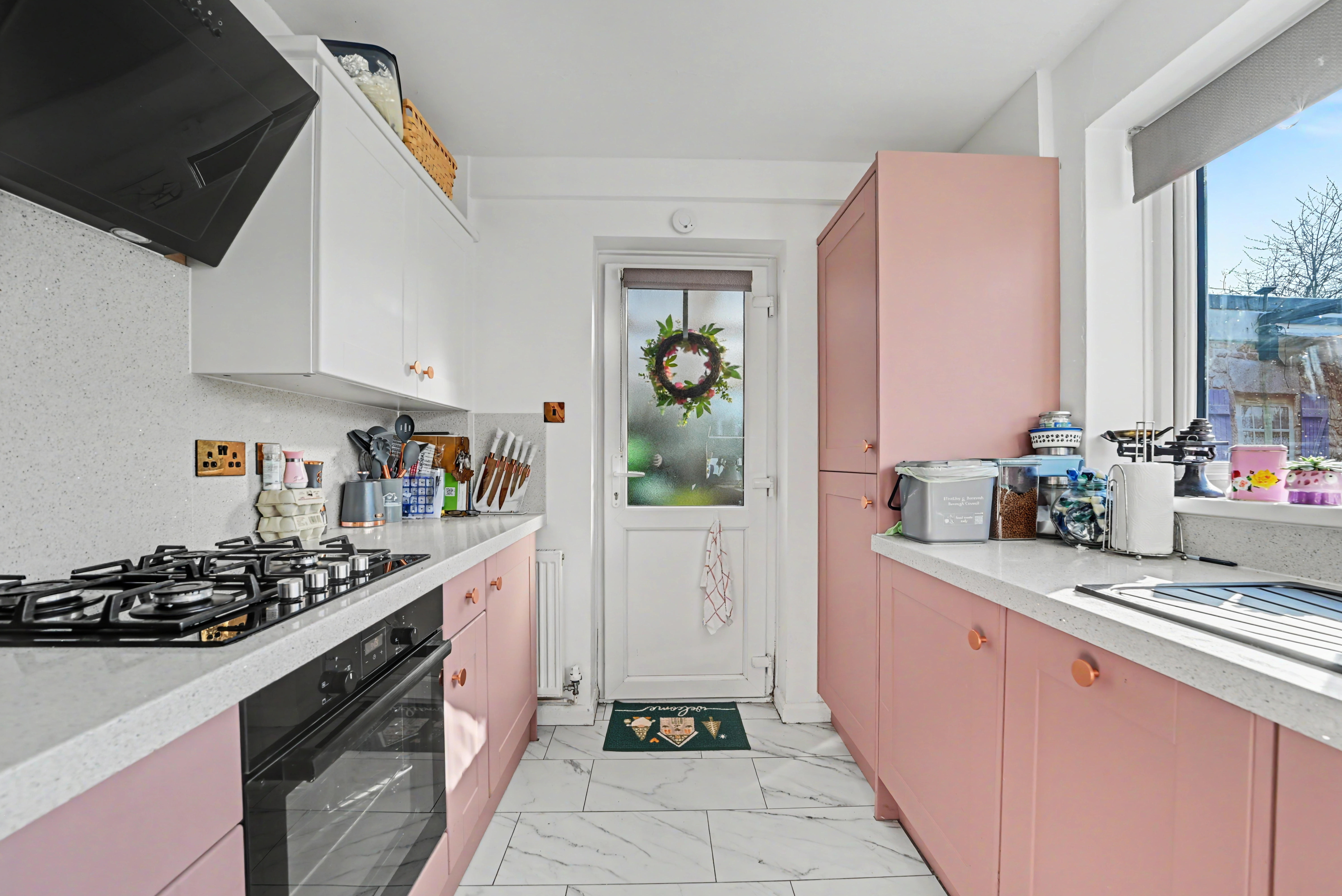 The two well-proportioned bedrooms are thoughtfully designed: the primary bedroom boasts built-in wardrobes, decorative wallpaper, and a large window, while the second bedroom is equally inviting and bathed in natural light. The recently upgraded kitchen is a true highlight, equipped with stylish pastel pink cabinetry, sleek countertops, integrated appliances, and an integrated oven, alongside a large window and direct access to the car port, making it both functional and visually appealing. The contemporary bathroom features a walk-in shower, under-sink storage, and decorative floor tiles, all enhanced by natural light from a frosted window.