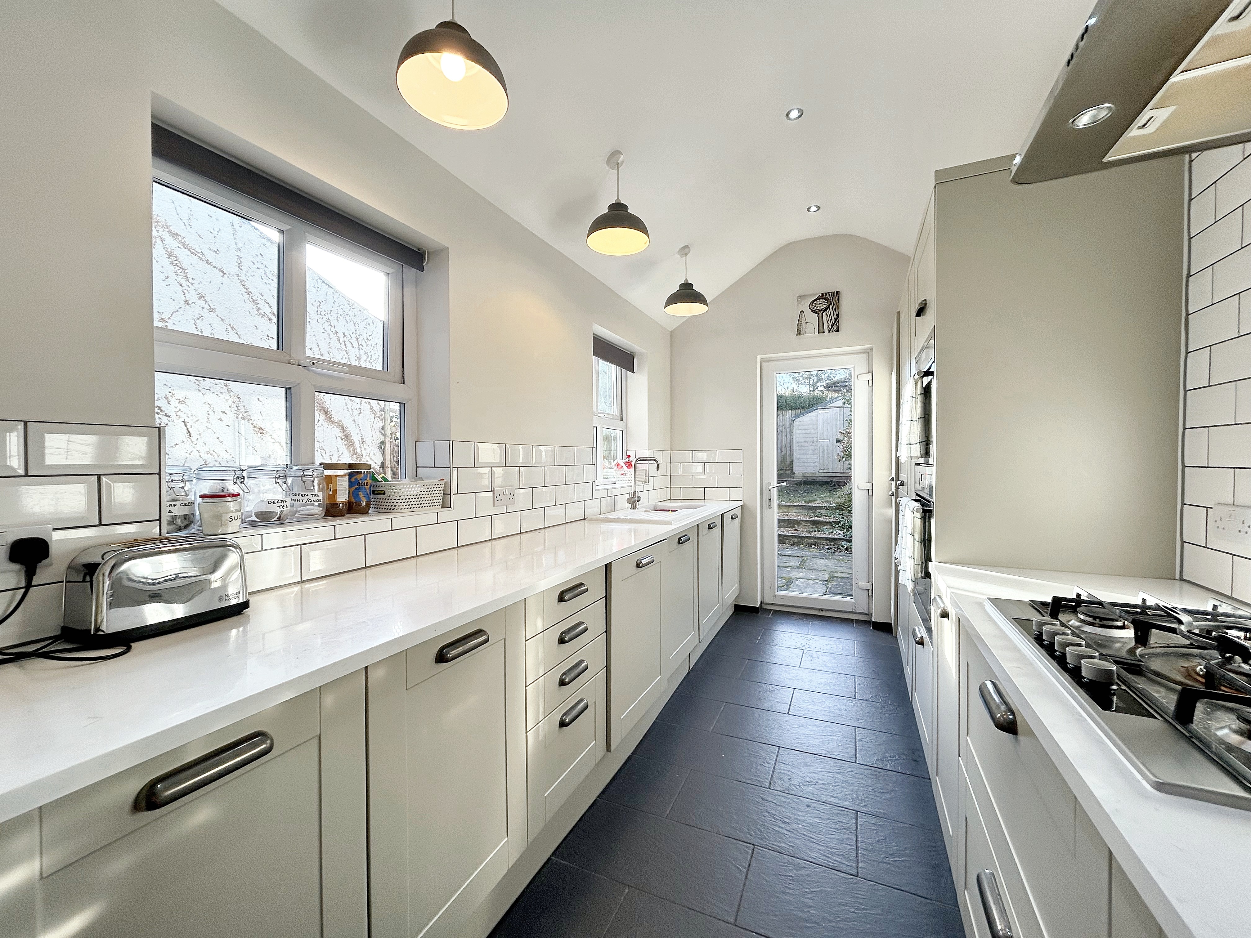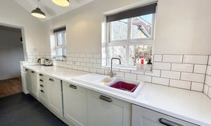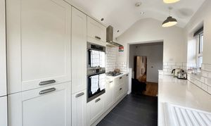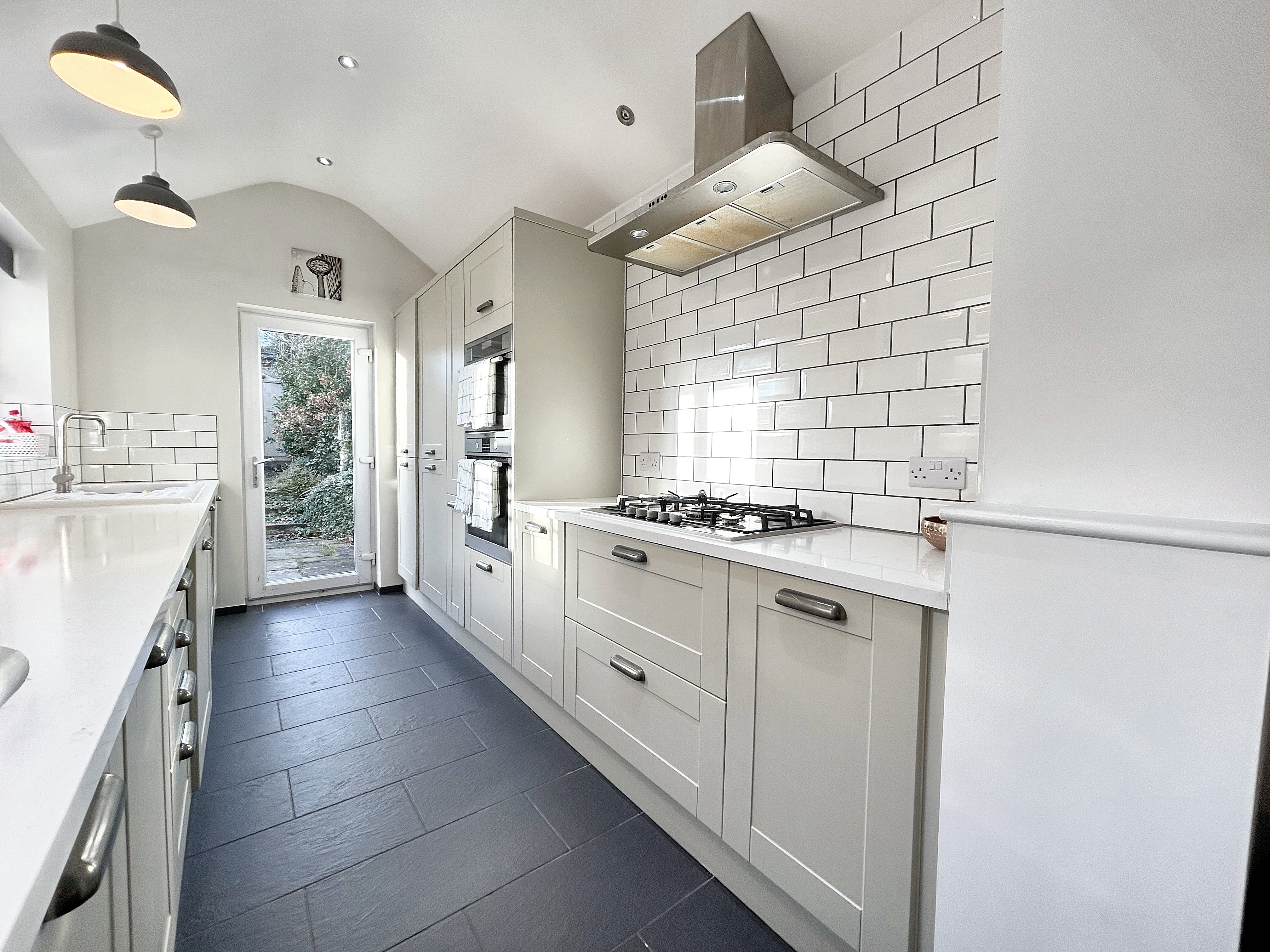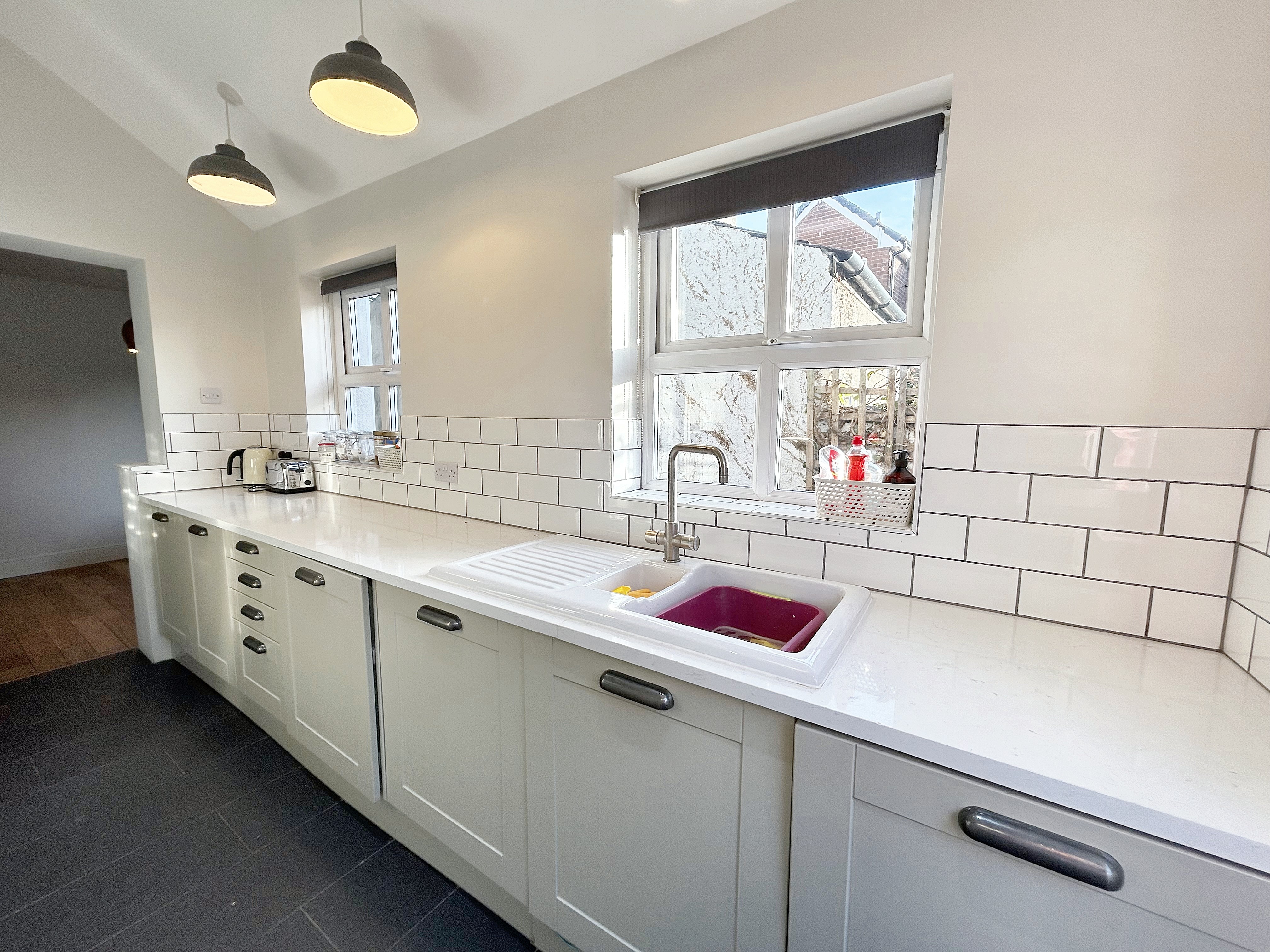 Modern fitted kitchen with a range of wall and base units, integrated with; Oven, Microwave, Gas Hob, Extractor Fan, Fridge/Freezer, Dishwasher and Washing Machine. 2 windows to side elevation. External door onto garden patio.