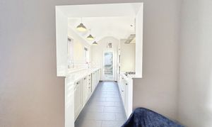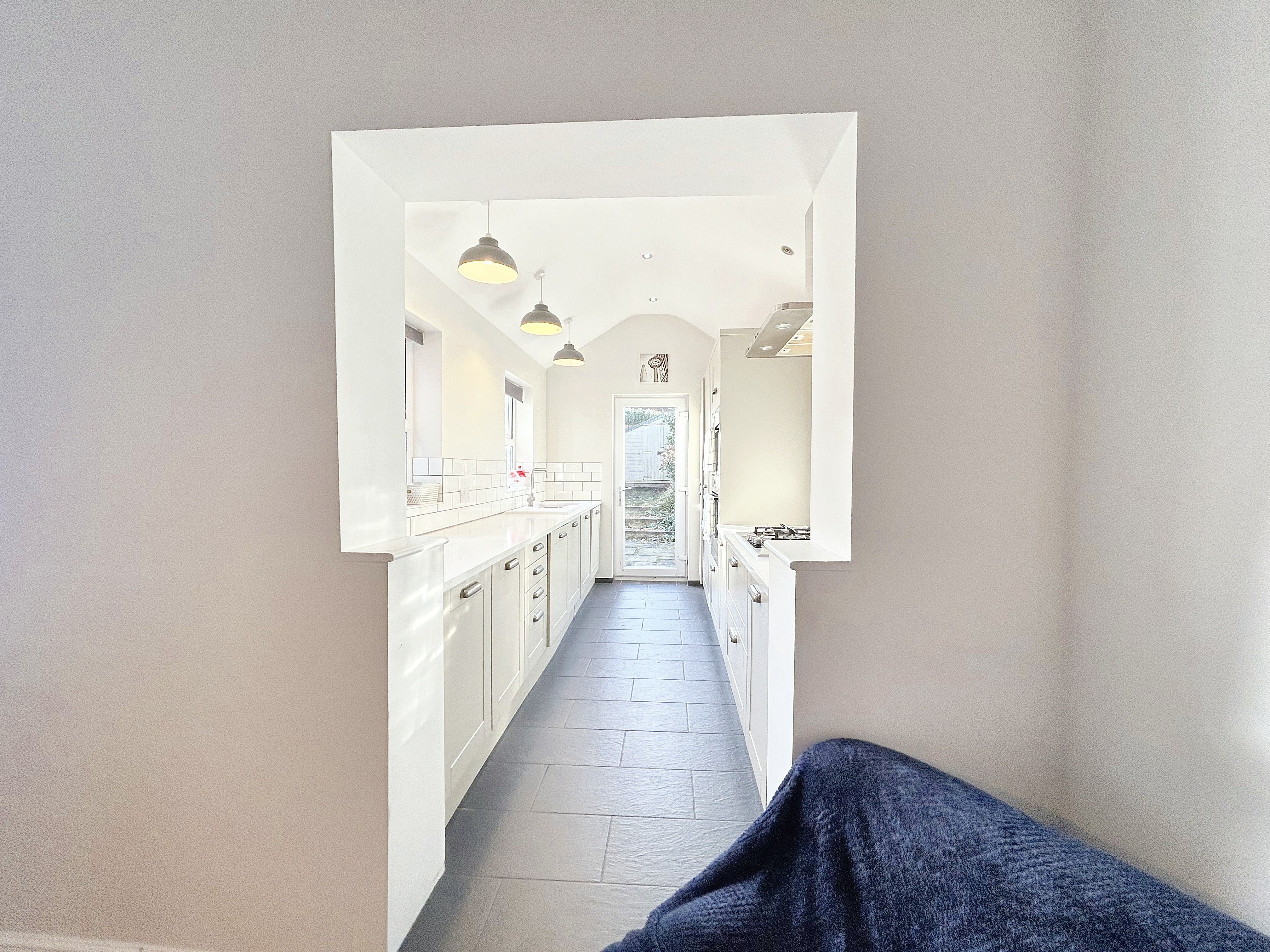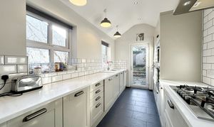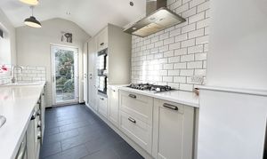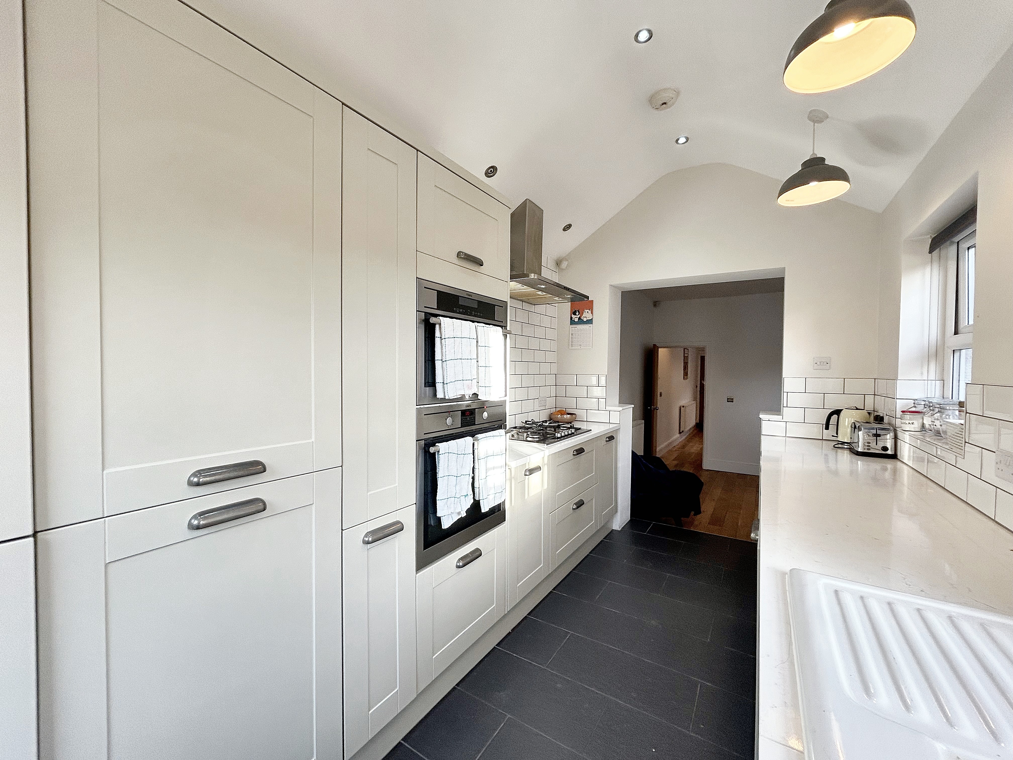 Modern fitted kitchen with a range of wall and base units, integrated with; Oven, Microwave, Gas Hob, Extractor Fan, Fridge/Freezer, Dishwasher and Washing Machine. 2 windows to side elevation. External door onto garden patio.