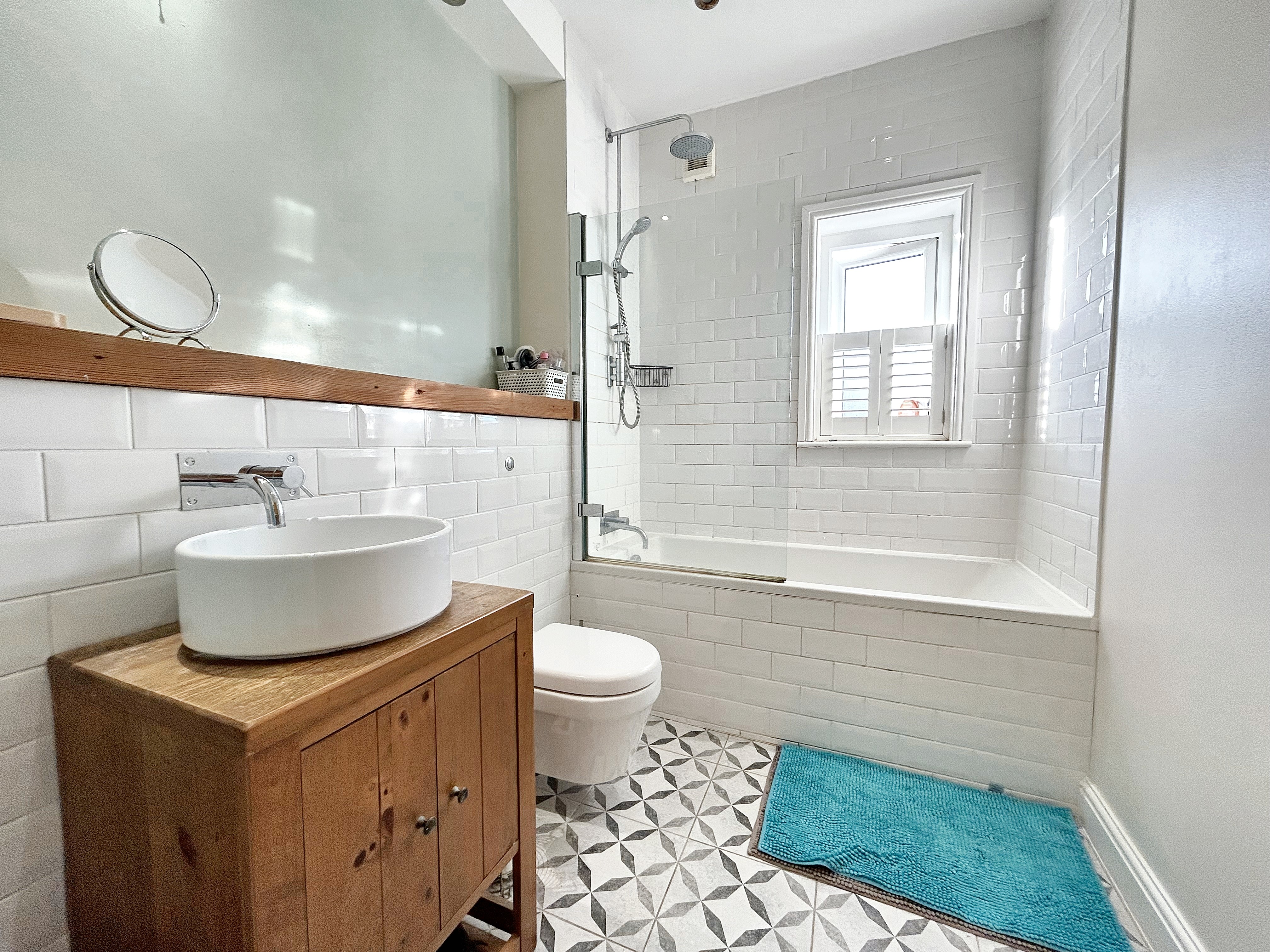 Fitted with a Low Level WC, Vanity Hand Wash Basin and Bath with Shower over. Tiled Floor And Part Tiled Walls. Window to rear elevation with Shutter.