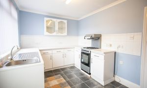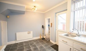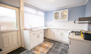 With tiled flooring, kitchen units, laminate worktop, oven and gas hob, storage room, door to the rear garden, radiator, and window.