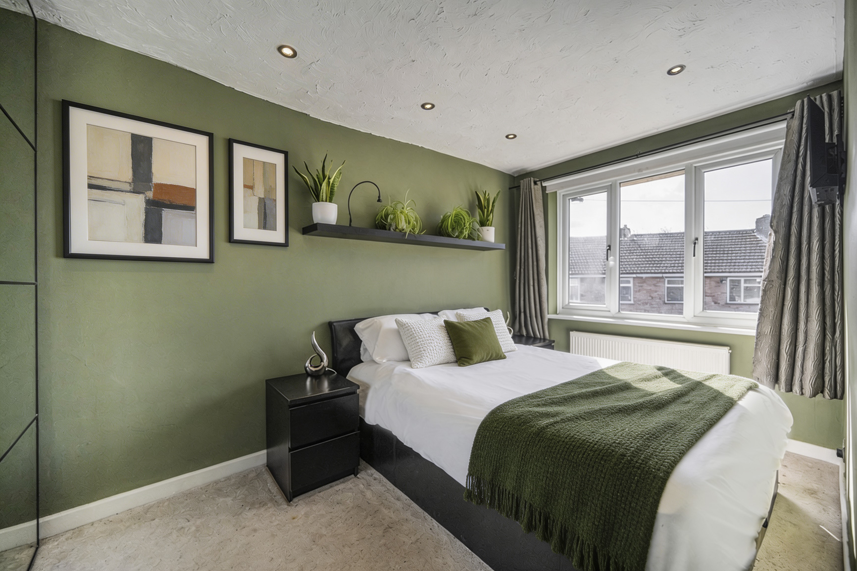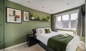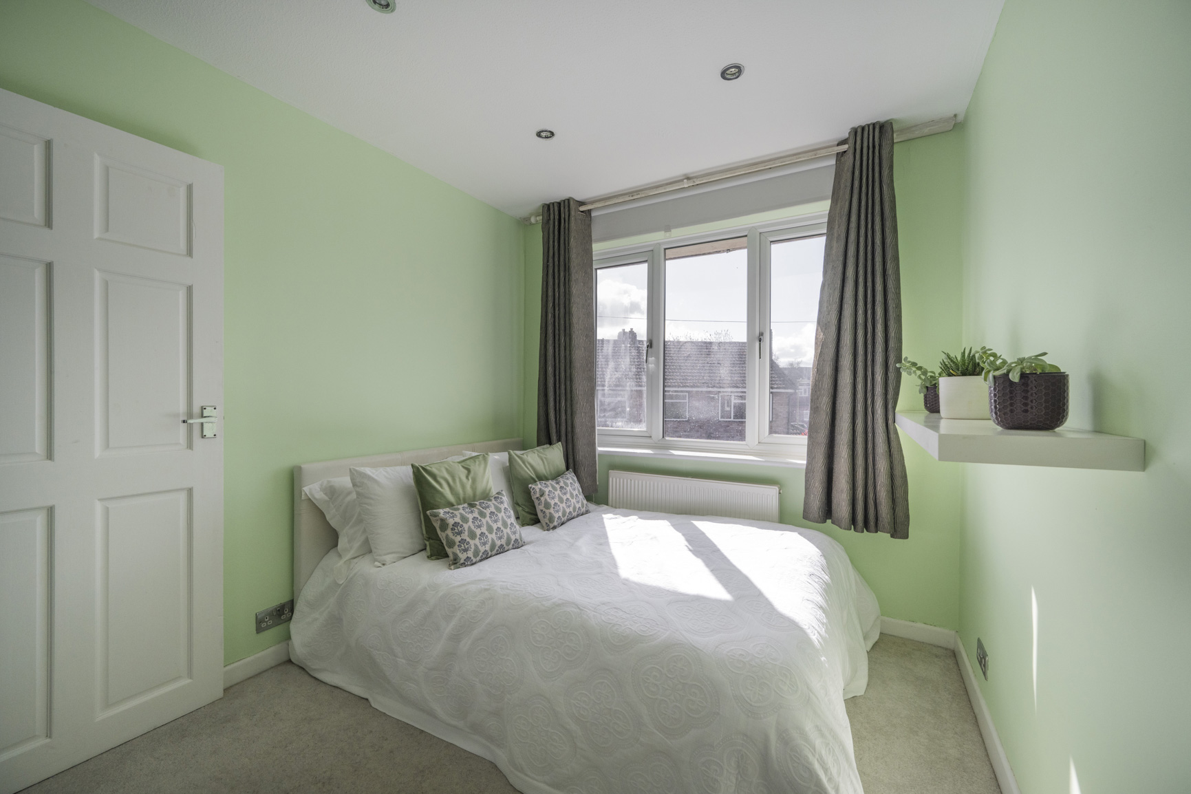 Completing the first-floor accommodation is a third double bedroom, bathed in a soft palette of pale green. True to the home’s spirit, the décor evokes the calming essence of nature, creating a restful environment that encourages deep sleep and peaceful dreams.