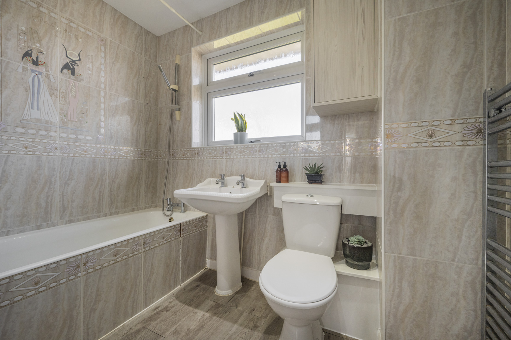 The family bathroom is fully enveloped in tiling, grounded by wide wood-effect flooring, the room balances earthy elements with modern convenience to maintain the home’s seamless functionality.