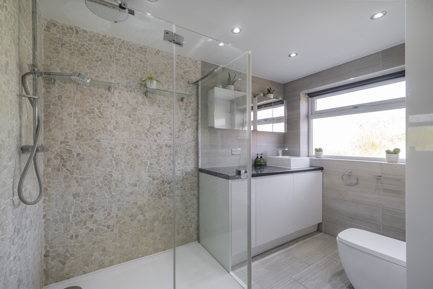 The ground floor is further enhanced by a thoughtfully designed shower room. The space features exquisite pebble effect tiling that creates a textured, artisanal feel. At its centre is a large, walk-in shower cubicle, for daily rejuvenation.