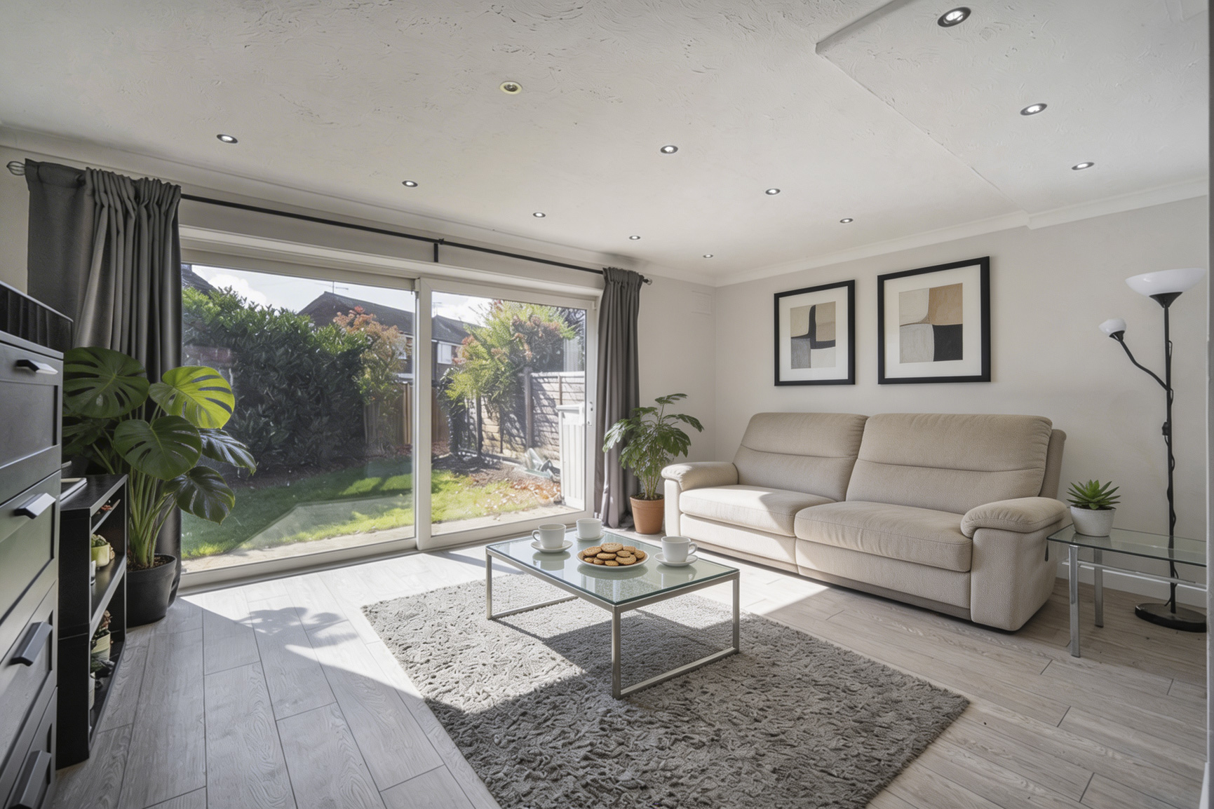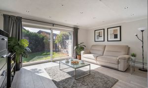 - Spacious living and dining room with patio doors opening to the garden