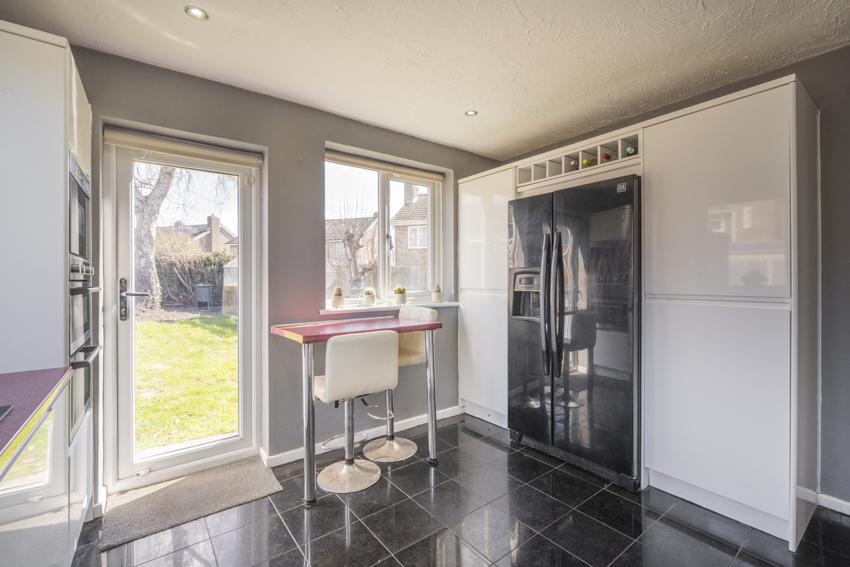 The kitchen serves as a striking balance of modern design. Featuring a sleek black tiled floor and crisp white units, the space is beautifully accented by bold speckled worktops that reflect the vibrant, soulful energy of the home. A dedicated high breakfast bar offers a tranquil spot to drink in the sunshine through the large window, providing a peaceful view of the lush, mature gardens as you start your day.