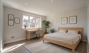 The ground floor is completed by an expansive, multi-use reception room grounded by wide wood-effect flooring and a palette of soft, blended fawn tones. Whether used as a quiet home office, play room or a comfortable guest suite, this versatile space offers a quiet retreat from the main living areas.