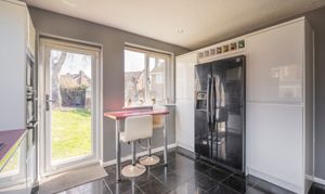 - Modern fitted kitchen with integrated appliances and breakfast bar